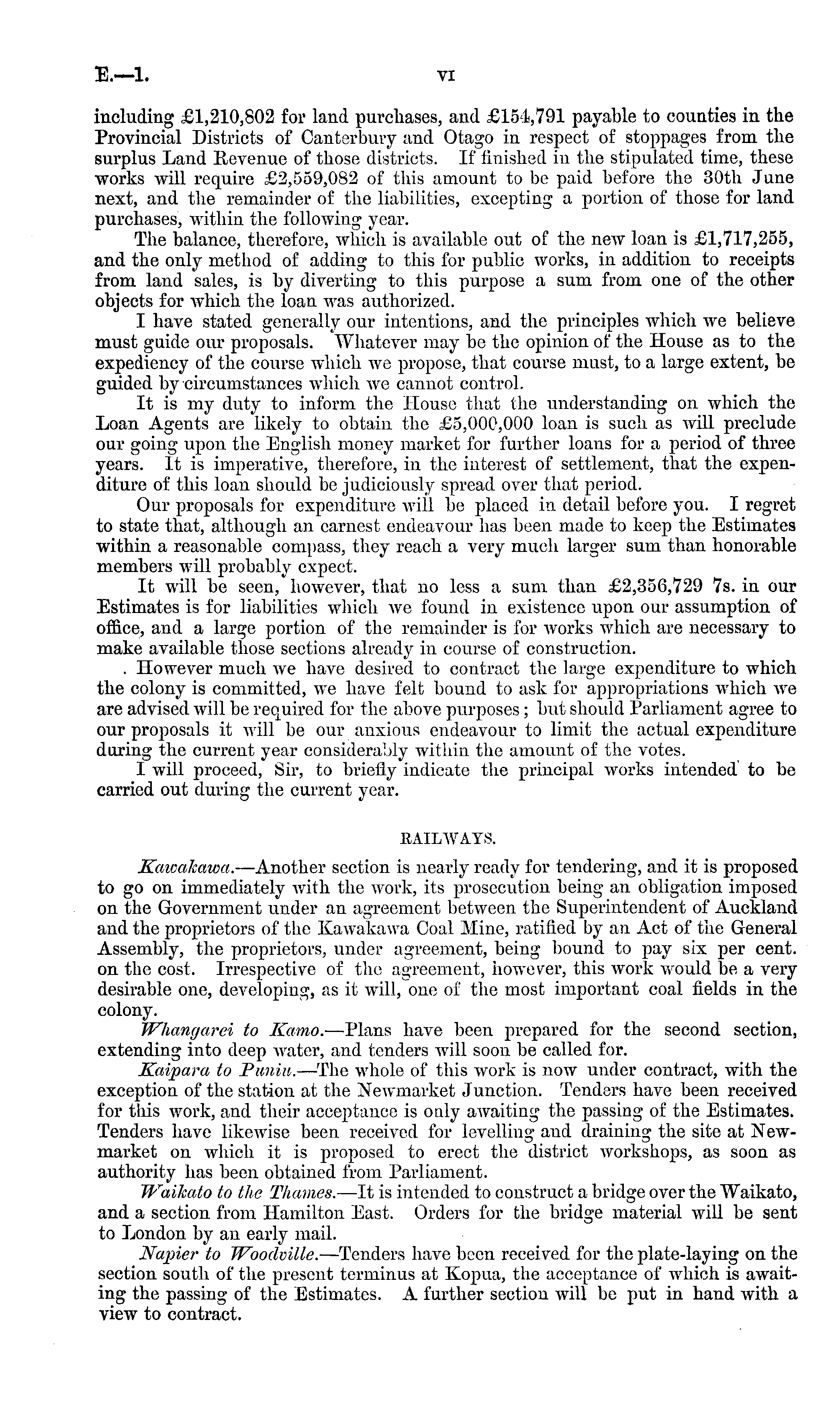 including £1,210,802 for land purchases, and £154,791 payable to counties in the Provincial Districts of Canterbury and Otago in respect of stoppages from the surplus Land Revenue of those districts. If finished in the stipulated time, these works will require £2,559,082 of this amount to be paid before the 30th June next, and the remainder of the liabilities, excepting a portion of those for land purchases, within the following year. The balance, therefore, which is available out of the new loan is £1,717,255, and the only method of adding to this for public works, in addition to receipts from land sales, is by diverting to this purpose a sum from one of the other objects for which the loan .vas authorized. I have stated generally our intentions, and the principles which we believe must guide our proposals. Whatever may be the opinion of the House as to the expediency of the course which we propose, that course must, to a large extent, be guided by circumstances which we cannot control. It is my duty to inform the House that the understanding on which the Loan Agents are likely to obtain the £5,000,000 loan is such as will preclude our going upon the English money market for further loans for a period of three years. It is imperative, therefore, in the interest of settlement, that the expenditure of this loan should be judiciously spread over that period. Our proposals for expenditure will be placed in detail before you. I regret to state that, although an earnest endeavour has been made to keep the Estimates within a reasonable compass, they reach a very much larger sum than honorable members will probably expect. It will be seen, however, that no less a sum than £2,356,729 7s. in our Estimates is for liabilities which we found in existence upon our assumption of office, and a large portion of the remainder is for works which are necessary to make available those sections already in course of construction. . However much we have desired to contract the large expenditure to which the colony is committed, we have felt bound to ask for appropriations which Aye are advised will be required for the above purposes; but should Parliament agree to our proposals it will be our anxious endeavour to limit the actual expenditure during the current year considerably within the amount of the votes. I will proceed, Sir, to briefly indicate the principal works intended to be carried out during the current year. RAILWAYS. Kawakawa. —Another section is nearly ready for tendering, and it is proposed to go on immediately with the work, its prosecution being an obligation imposed on the Government under an agreement between the Superintendent of Auckland and the proprietors of the Kawakawa Coal Mine, ratified by an Act of the General Assembly, the proprietors, under agreement, being bound to pay six per cent. on the cost. Irrespective of the agreement, however, this work would be a very desirable one, developing, as it will, one of the most important coal fields in the colony. Whangarei to Kamo. —Plans have been prepared for the second section, extending into deep .vater, and tenders will soon be called for. Kaipara to JPuniu. —The whole of this work is now under contract, with the exception of the station at the Newmarket Junction. Tenders have been received for this work, and their acceptance is only awaiting the passing of the Estimates. Tenders have likewise been received for levelling and draining the site at Newmarket on which it is proposed to erect the district workshops, as soon as authority has been obtained from Parliament. Waikato to the Thames. —lt is intended to construct a bridge over the Waikato, and a section from Hamilton East. Orders for the bridge material will be sent to London by an early mail. Napier to Woodville. —Tenders have been received for the plate-laying on the section south of the present terminus at Kopua, the acceptance of which is awaiting the passing of the Estimates. A further section will be put in hand with a view to contract.