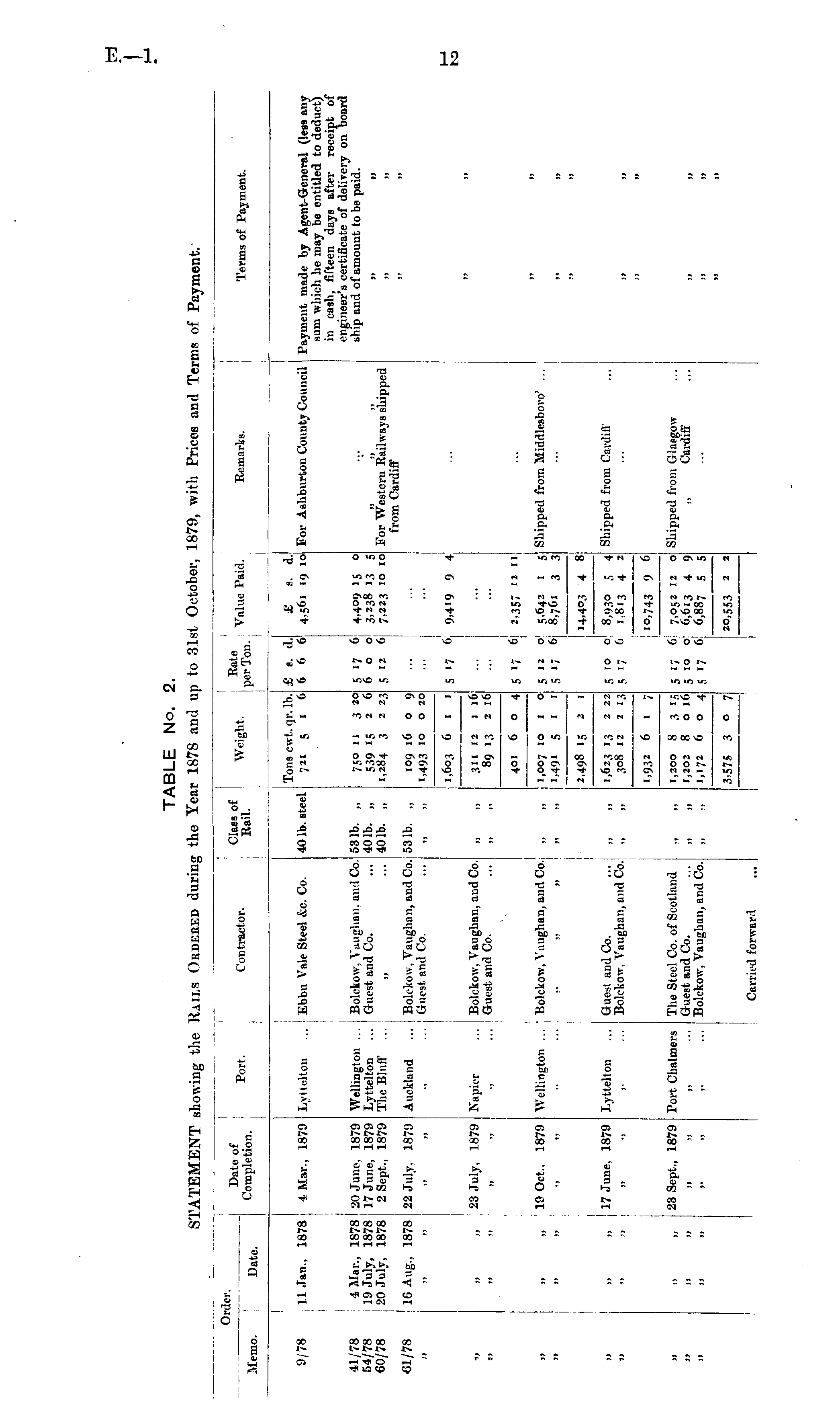 TABLE No. 2. STATEMENT showing the RAILS ORDERED during the Year 1878 and up to 31st October, 1879, with Prices and Terms of Payment.