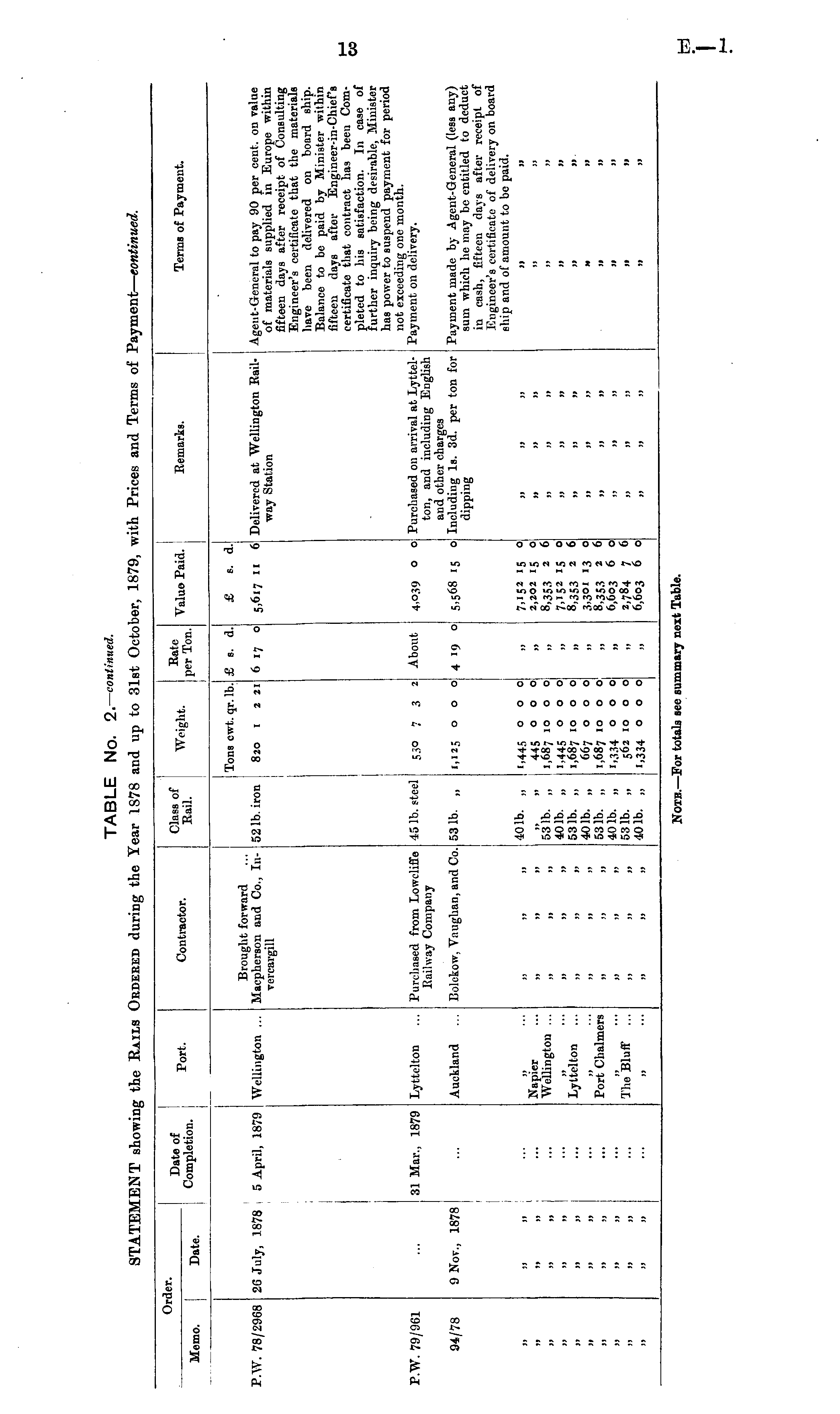 Order. Date of Completion. Port. Contractor. Class of Rail. Weight. Rate per Ton. A'aluo Paid. Remarks. Terms of Payment. Memo. Date. Tons cwt. qr. lb. £ a. d. £ a. dJ Agent-General to pay 90 per cent, on value of materials supplied in Europe within fifteen days after receipt of Consulting Engineer's certificate that the materials have been delivered on board ship. Balance to be paid by Minister within fifteen days after Engineer-in-Chief's certificate that contract has been Completed to his satisfaction. In case of further inquiry being desirable, Minister has power to suspend payment for period not exceeding one month. Payment on delivery. P.AV. 78/2968 26 July, 1878 5 April, 1879 AVellington ... Brought forward Macpherson and Co., Invercargill 52 lb. iron 820 1 2 21 6 17 o 5,617 11 6 : Delivered at Wellington Railway Station Purchased from Lowcliffe Railway Company Purchased on arrival at Lyttelton, and including English and other charges Including Is. 3d. per ton for dipping P.W. 79/961 31 Mar., 1879 Lyttelton 45 lb. steel 5..° 7 3 2 About 4,039 o o 94/78 9 Nov., 1878 Auckland Bolckow, Vaughan, and Co. 53 lb. „ 1,125 000 4 19 o 5>5 68 '5 o Payment made by Agent-General (less any) sum which he may be entitled to deduct in cash, fifteen days after receipt of Engineer's certificate of delivery on board ship and of amount to bo paid. JJ jj jj ,, ... Napier AVellington ... ., .. .> 40 lb. „ 1,445 000 445 ° o o 1,687 10 o o 1,445 000 1,687 10 o o 667 000 1,687 1 o o o 1,334 000 562 10 o o 1,334 000 7.152 15 o 2,202 15 o 8,353 2 6 7>>5 2 '5 ° 8.353 2 6 3,301 13 o 8,353 2 6 6,603 & ° 2,784 7 6 6,603 ° ° >» .. .. .. ti » M j> jj jj jj jj jj jj jj jj JJ >i il jj Lyttelton Port Chalmers j. >> .. ,. >t ji .» .. >> >. .. .. 531b. „ 40 lb. „ 531b. „ 40 lb. „ 531b. „ 40 lb. „ 53 lb. „ 40 lb. „ is ti 11 11 11 11 11 u ;> J. jj .» )» >. .. 11 ji jj 11 .j jj jj jj j> 11 tt i) j# j» jj JJ jj .. .. it 11 it >. il ji jj Jl JJ Tin. Bluff '.'.'. it tt a .. jj jj jj ji jj jj ji jj )! )» ). ». jj jj ;J ji 11 )j )J JJ .) ») J) .. jj jj jj jj jj Note. —For totals see summary next Table.