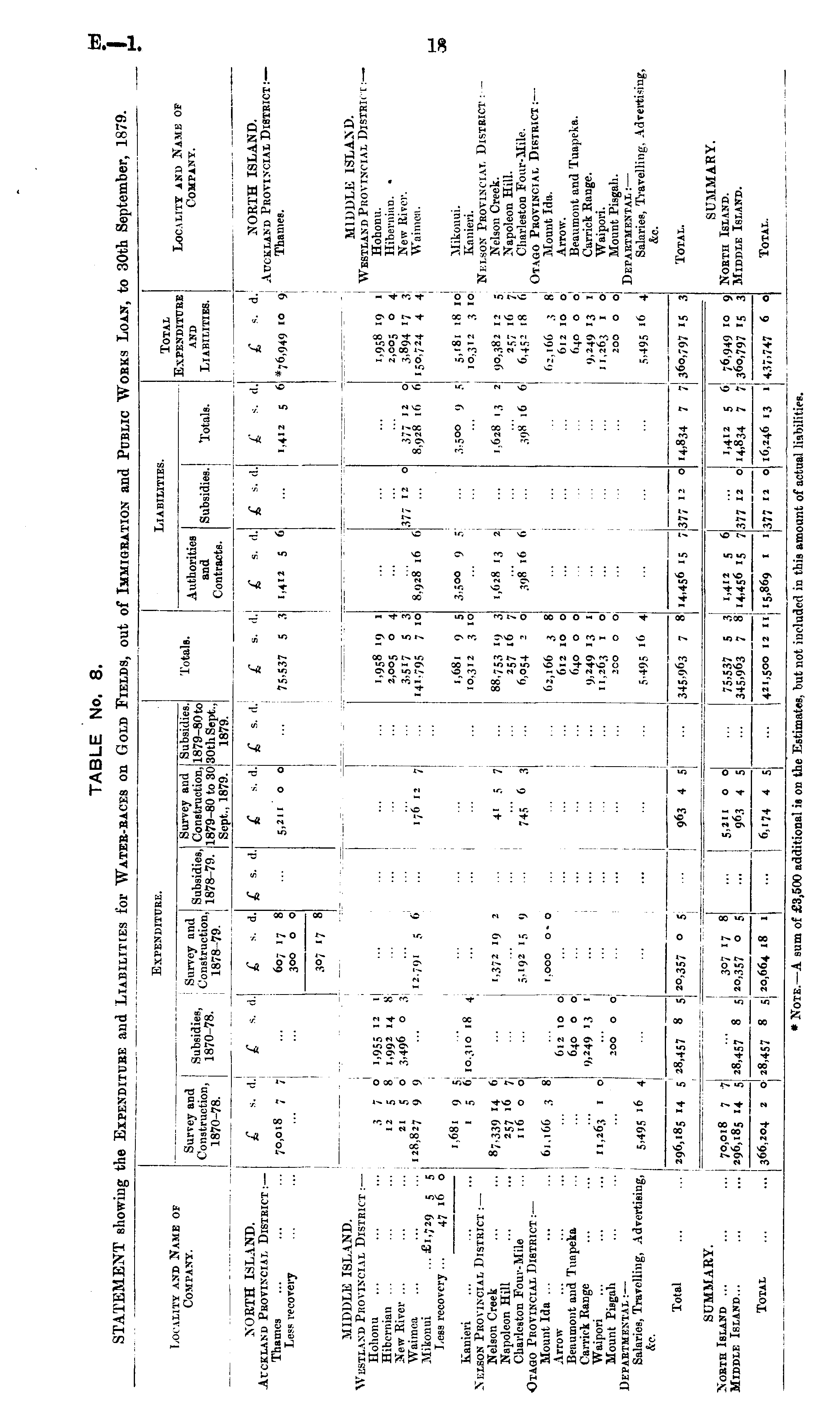 TABLE No. 8. STATEMENT showing the Expenditure aud Liabilities for Water-races on Gold Eields, out of Immigration and Public Works Loan, to 30th September, 1879.