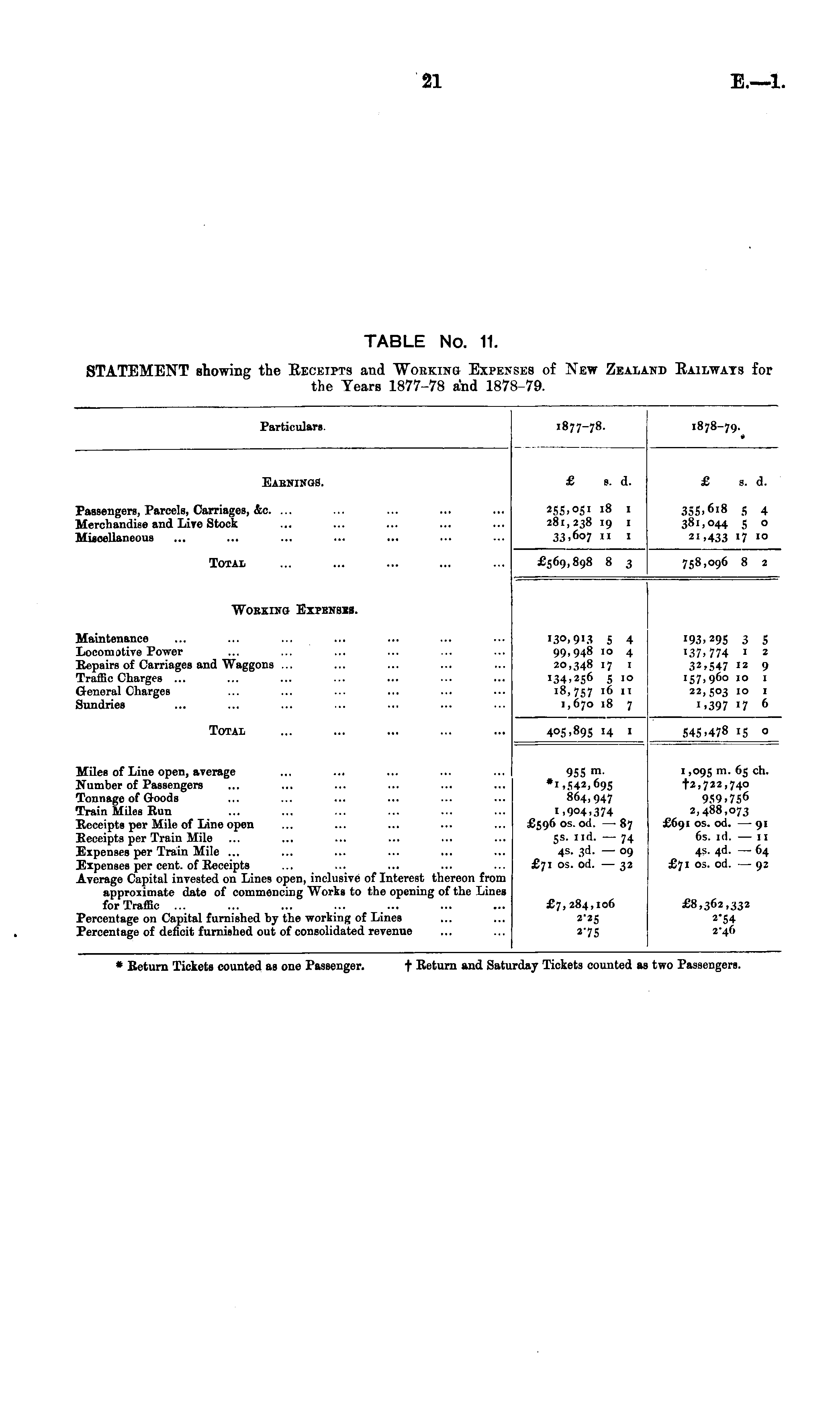 TABLE No. 11. STATEMENT showing the RECEIPTS and WORKING EXPENSES of NEW ZEALAND RAILWAYS for the Years 1877-78 and 1878-79.