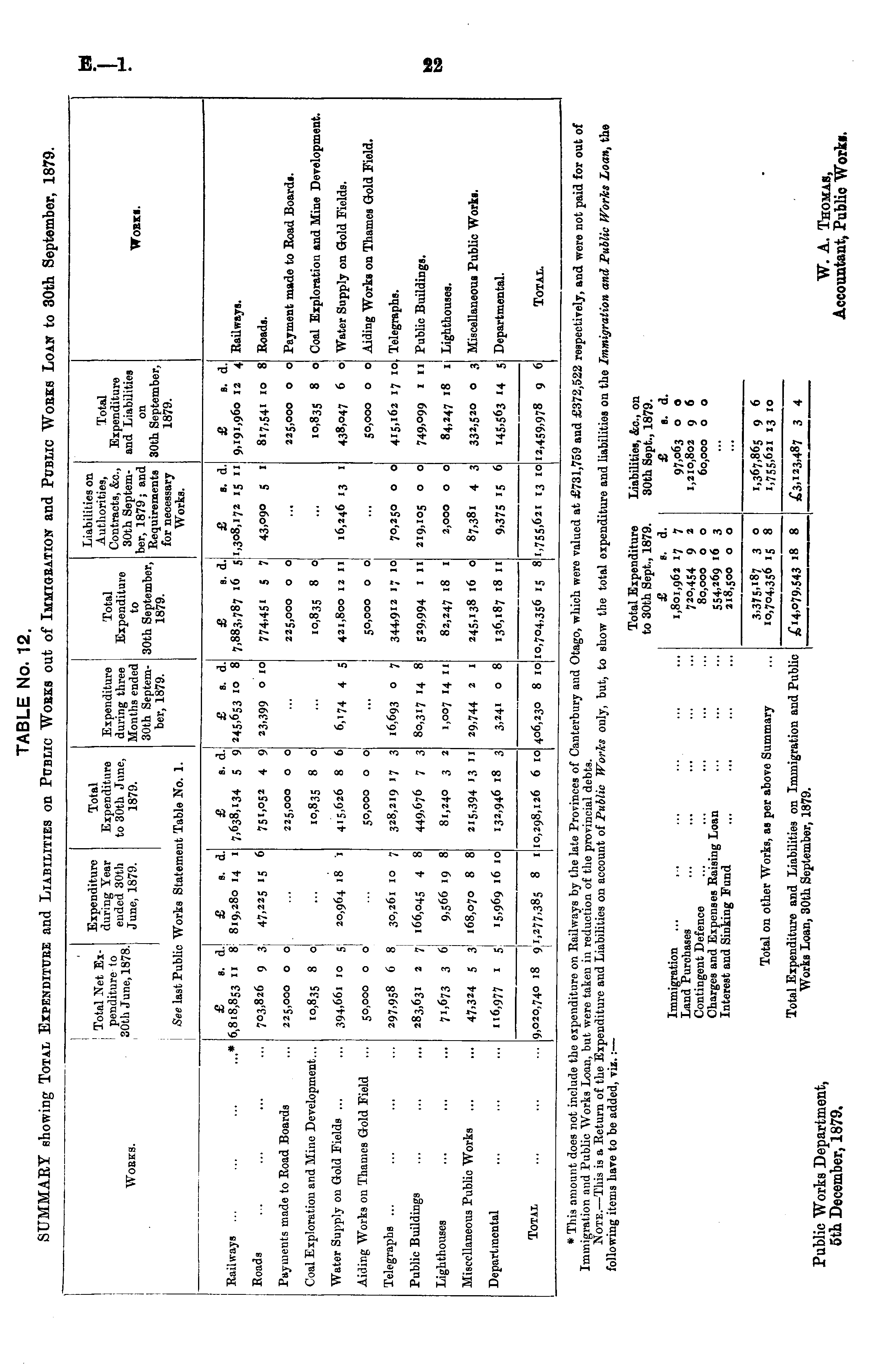 TABLE No. 12. SUMMARY showing TOTAL EXPENDITURE and LIABILITIES on PUBLIC WORKS out of IMMIGRATION and PUBLIC WORKS LOAN to 30th September, 1879.