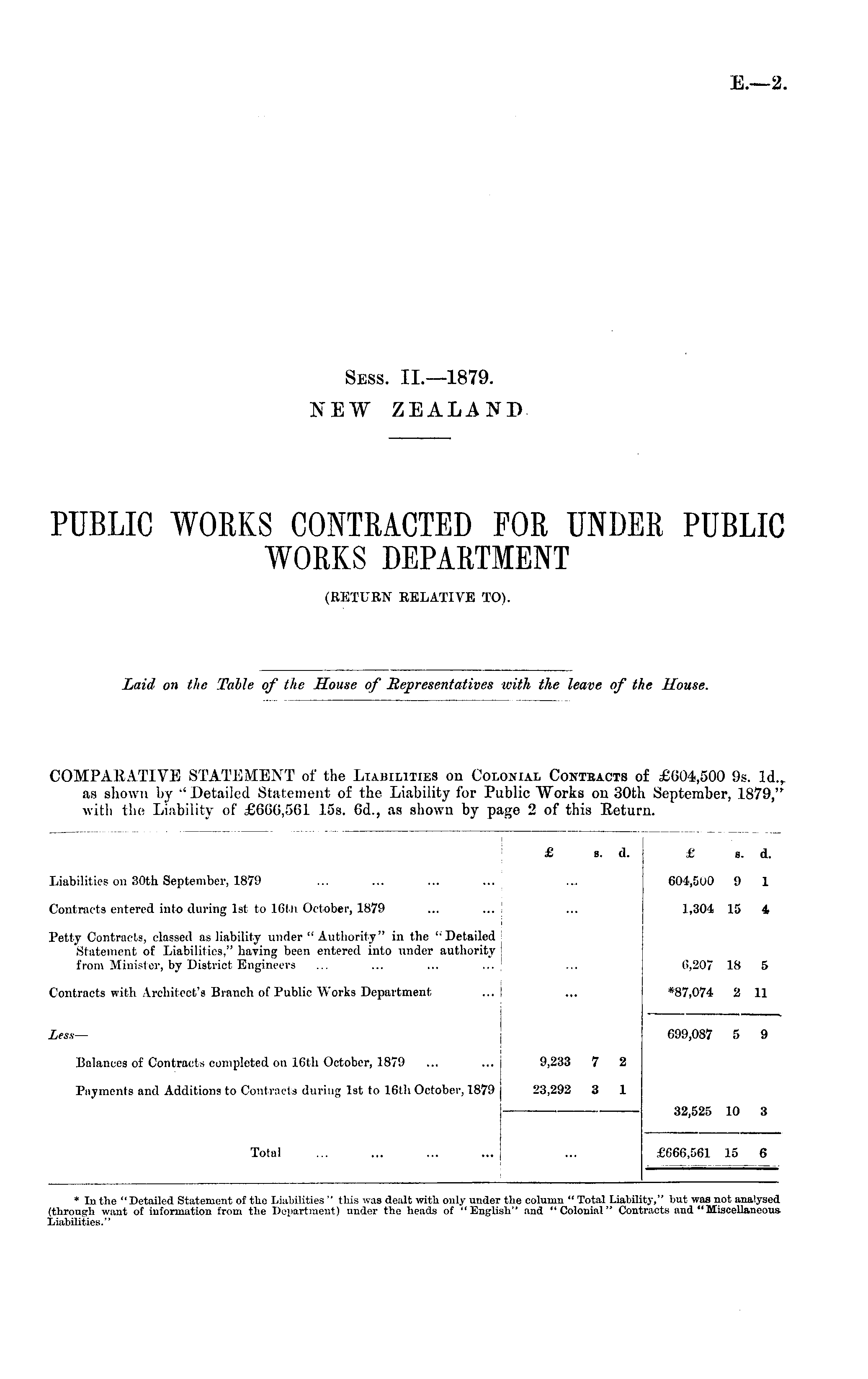 COMPARATIVE STATEMENT of the Liabilities on Colonial Contracts of £604,500 9s. Id., as shown by "Detailed Statement of the Liability for Public Works on 30th September, 1879," with the Liability of £666,561 15s. 6d., as shown by page 2 of this Return.