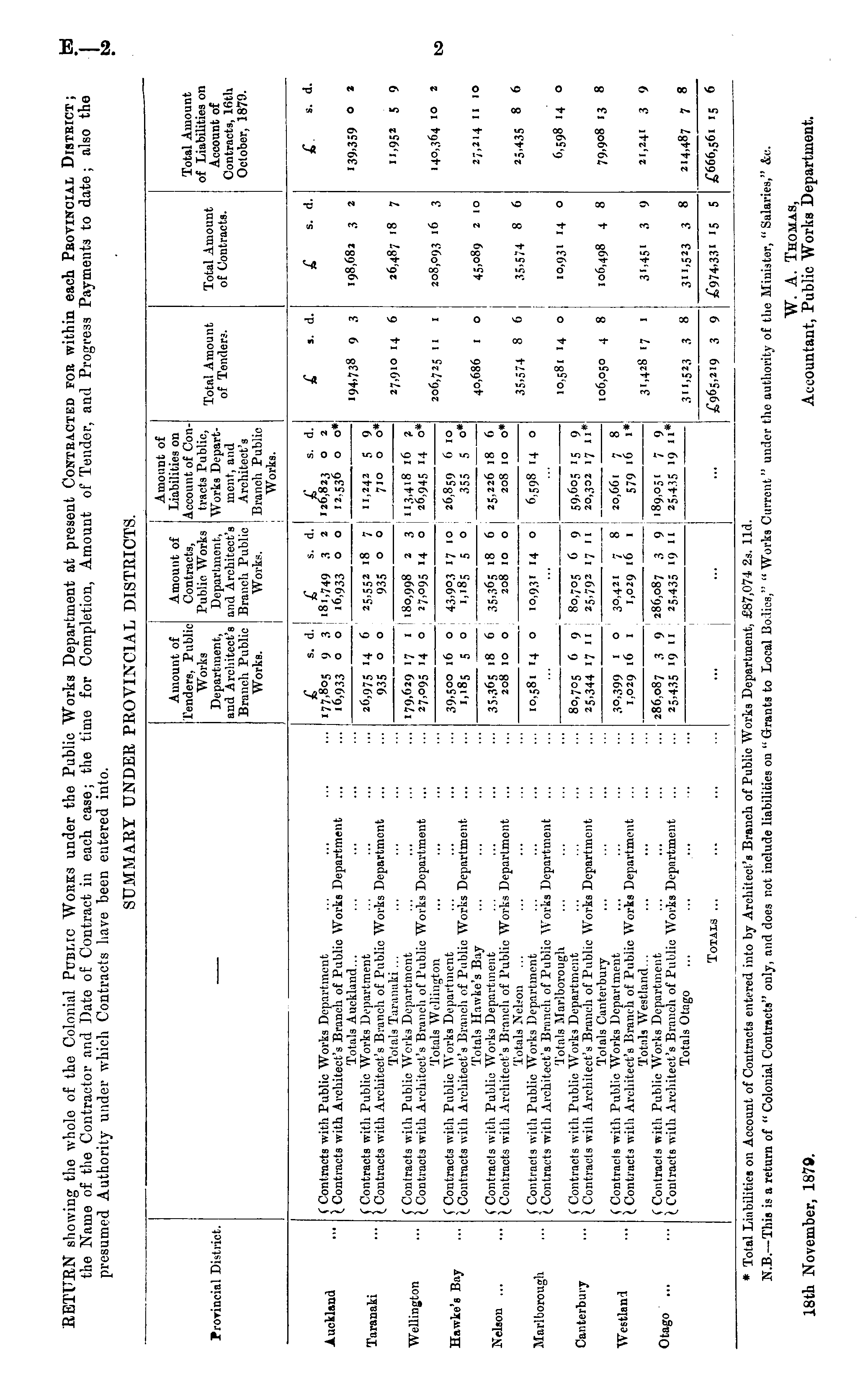 RETURN showing the whole of the Colonial Public Works under the Public Works Department at present Contracted for within each Provincial District; the Name of the Contractor and Date of Contract in each case; the time for Completion, Amount of Tender, and Progress Payments to date; also the presumed Authority under which Contracts have been entered into. SUMMARY UNDER PROVINCI AL DISTRICTS.