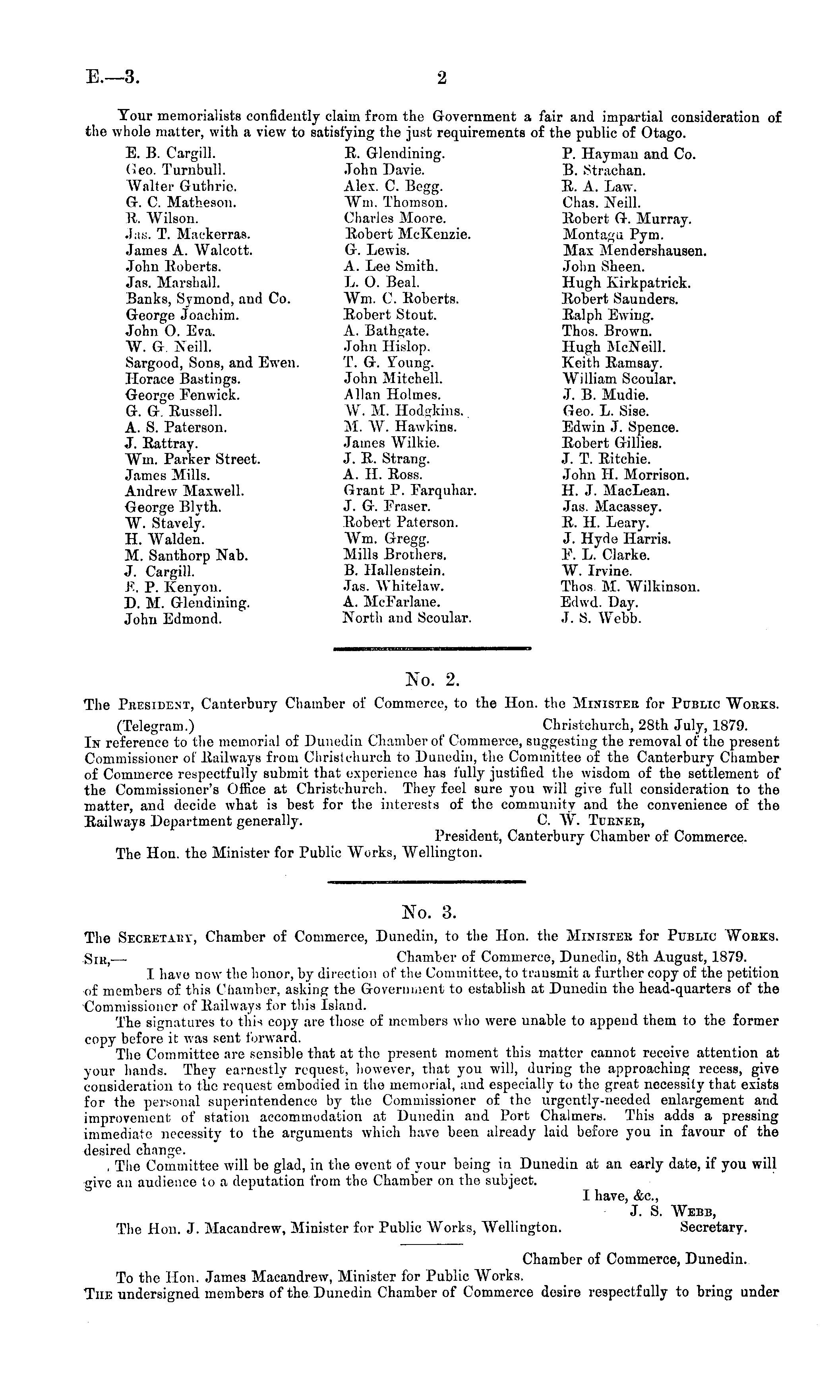 No. 3. The Secretary, Chamber of Commerce, Dunedin, to the Hon. the Minister for Public Works. Snj,— Chamber of Commerce, Dunedin, Bth August, 1579. I have now the honor, by direction of the Committee, to transmit a further copy of the petition of members of this Chamber, asking the Government to establish at Dunedin the head-quarters of the Commissioner of Railways for this Island. The signatures to this copy are those of members who were unable to append them to the former copy before it was sent forward. The Committee are sensible that at tho present moment this matter cannot receive attention at your hands. They earnestly request, however, that you will, during the approaching recess, give consideration to the request embodied in the memorial, and especially to the great necessity that exists for the personal superintendence by the Commissioner of the urgently-needed enlargement and improvement of station accommodation at Dunedin and Port Chalmers. This adds a pressing immediate necessity to the arguments which have been already laid before you in favour of the desired change. , The Committee will be glad, in the event of your being in Dunedin at an early date, if you will give an audience to a deputation from the Chamber on the subject. I have, &c., J. S. Webb, The Hon. J. Macandrew, Minister for Public Works, Wellington. Secretary. Chamber of Commerce, Dunedin. To the Hon. James Macandrew, Minister for Public Works. The undersigned members of tho Dunedin Chamber of Commerce desire respectfully to bring under