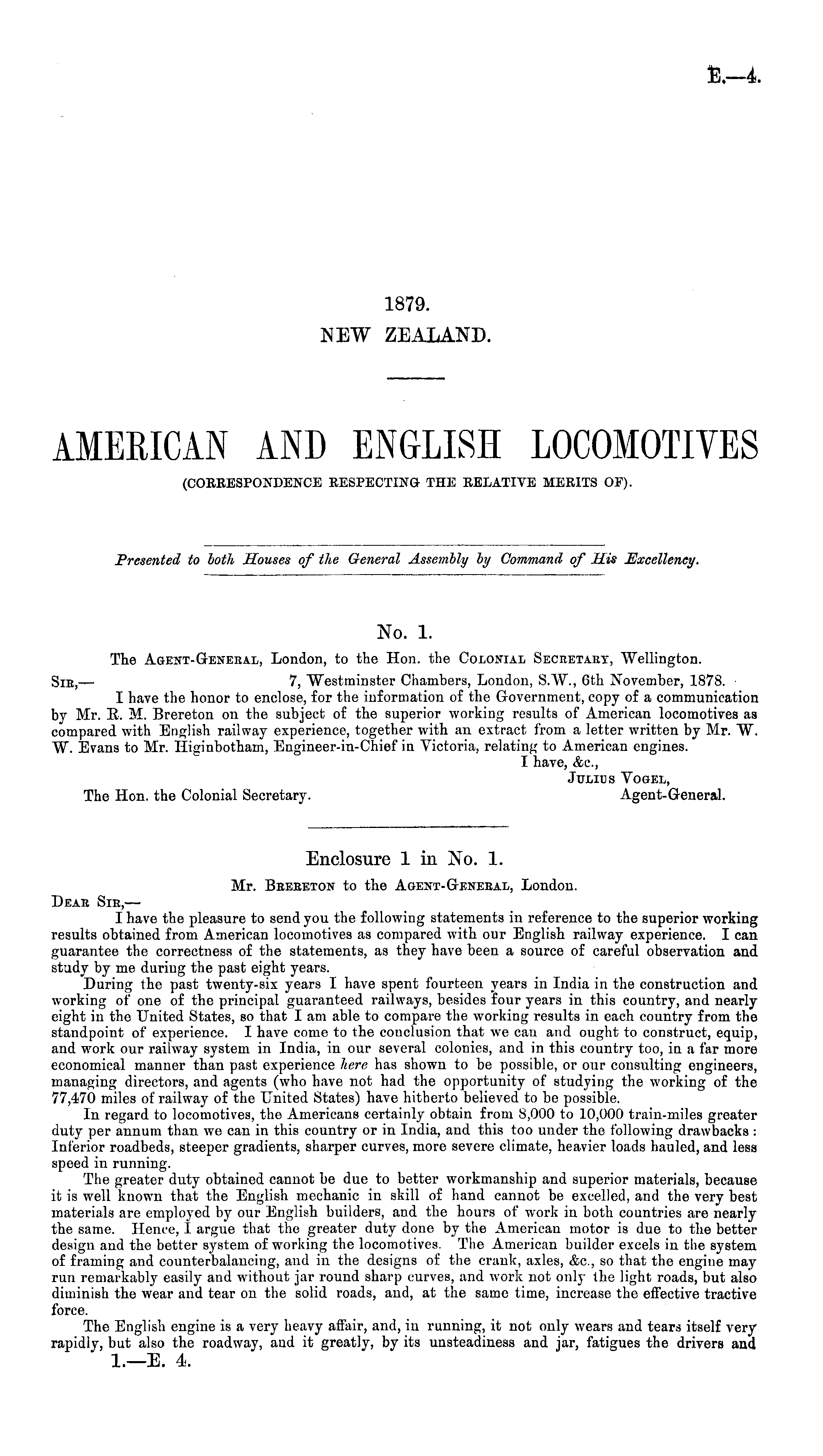 No. 1. The Agent-Geneeal, London, to the Hon. the Colonial Seceetaet, Wellington. Sic, — 7, Westminster Chambers, London, S.W., 6th November, 1878. ■ I have the honor to enclose, for the information of the Government, copy of a communication by Mr. E. M. Brereton on the subject of the superior working results of American locomotives as compared with English railway experience, together with an extract from a letter written by Mr. W. W. Evans to Mr. Higinbotham, Engineer-in-Chief in Victoria, relating to American engines. I have, &c, Julius Vogel, The Hon. the Colonial Secretary. Agent-General.