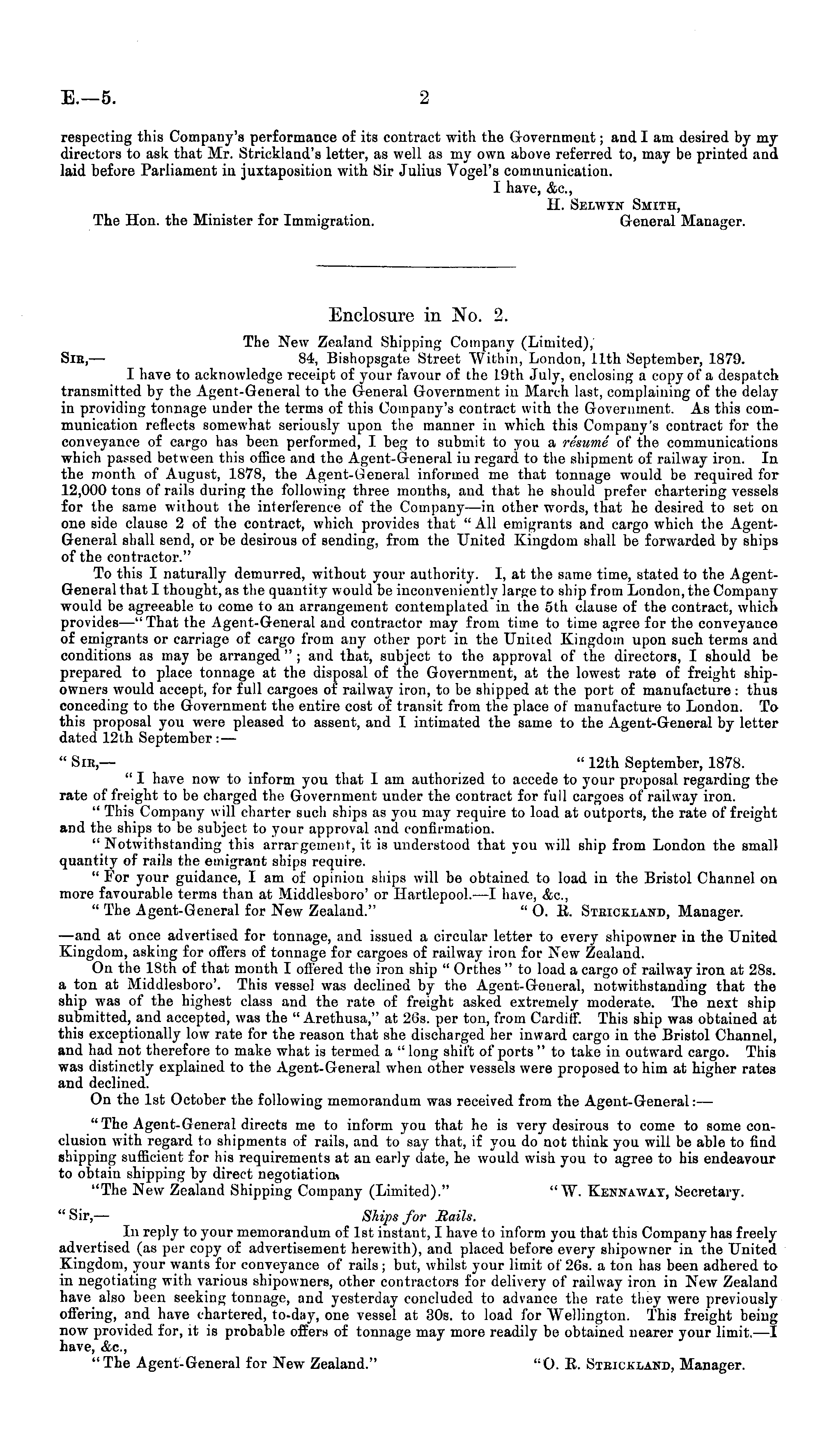 Enclosure in No. 2. The New Zealand Shipping Company (Limited), Sic, — 84, Bishopsgate Street Within, London, 11th September, 1879. I have to acknowledge receipt of your favour of the 19th July, enclosing a copy of a despatch transmitted by the Agent-General to the General Government in March last, complaining of the delay in providing tonnage under the terms of this Company's contract with the Government. As this communication reflects somewhat seriously upon the manner iv which this Company's contract for the conveyance of cargo lias been performed, I beg to submit to you a resume of the communications which passed between this office and the Agent-General in regard to the shipment of railway iron. In the month of August, 1878, the Agent-General informed me that tonnage would be required for 12,000 tons of rails during the following three mouths, and that he should prefer chartering vessels for the same without the interference of the Company —in other words, that he desired to set on one side clause 2 of the contract, which provides that " All emigrants and cargo which the AgentGeneral shall send, or be desirous of sending, from the United Kingdom shall be forwarded by ships of the contractor." To this I naturally demurred, without your authority. I, at the same time, stated to the AgentGeneral that I thought, as the quantity would be inconveniently large to ship from London, the Company would be agreeable to come to an arrangement contemplated in the sth clause of the contract, which provides —"That the Agent-General and contractor may from time to time agree for the conveyance of emigrants or carriage of cargo from any other port in the United Kingdom upon such terms and conditions as may be arranged " ; and that, subject to the approval of the directors, I should be prepared to place tonnage at the disposal of the Government, at the lowest rate of freight shipowners would accept, for full cargoes of railway iron, to be shipped at the port of manufacture : thus conceding to the Government the entire cost of transit from the place of manufacture to London. To this proposal you were pleased to assent, and I intimated the same to the Agent-General by letter dated 12th September: — " Sir— " 12th September, 1878. " I have now to inform you that I am authorized to accede to your proposal regarding the rate of freight to be charged the Government under the contract for full cargoes of railway iron. " This Company will charter such ships as you may require to load at outports, the rate of freight and the ships to be subject to your approval and confirmation. " Notwithstanding this arrargcinent, it is understood that you will ship from London the small quantity of rails the emigrant ships require. " For your guidance, I am of opinion ships will be obtained to load in the Bristol Channel on more favourable terms than at Middlesboro' or Hartlepool.—l have, &c, " The Agent-General for New Zealand." " 0. li. Strickland, Manager. —and at once advertised for tonnage, and issued a circular letter to every shipowner in the United Kingdom, asking for offers of tonnage for cargoes of railway iron for New Zealand. On the 18th of that month I offered the iron ship " Orthes " to load a cargo of railway iron at 28s. a ton at Middlesboro'. This vessel was declined by the Agent-General, notwithstanding that the ship was of the highest class and the rate of freight asked extremely moderate. The next ship submitted, and accepted, was the " Arethusa," at 265. per ton, from Cardiff. This ship was obtained at this exceptionally low rate for the reason that she discharged her inward cargo in the Bristol Channel, and had not therefore to make what is termed a " long shift of ports "to take in outward cargo. This was distinctly explained to the Agent-General when other vessels were proposed to him at higher rates and declined. On the Ist October the following memorandum was received from the Agent-General:— "The Agent-General directs me to inform you that he is very desirous to come to some conclusion with regard to shipments of rails, and to say that, if you do not think you will be able to find shipping sufficient for his requirements at an early date, he would wish you to agree to his endeavour to obtain shipping by direct negotiation* "The New Zealand Shipping Company (Limited)." "W. Kennaway, Secretary. "Sir,— Ships for Rath: In reply to your memorandum of Ist instant, I have to inform you that this Company has freely advertised (as pur copy of advertisement herewith), and placed before every shipowner in the United Kingdom, your wants for conveyance of rails ; but, whilst your limit of 265. a ton has been adhered to in negotiating with various shipowners, other contractors for delivery of railway iron in New Zealand have also been seeking tonnage, and yesterday concluded to advance the rate they were previously offering, and have chartered, to-day, one vessel at 30s. to load for Wellington. This freight being now provided for, it is probable offers of tonnage may more readily be obtained nearer your limit. —I have, &c, "The Agent-General for New Zealand."' "O. E. Stbickland, Manager.