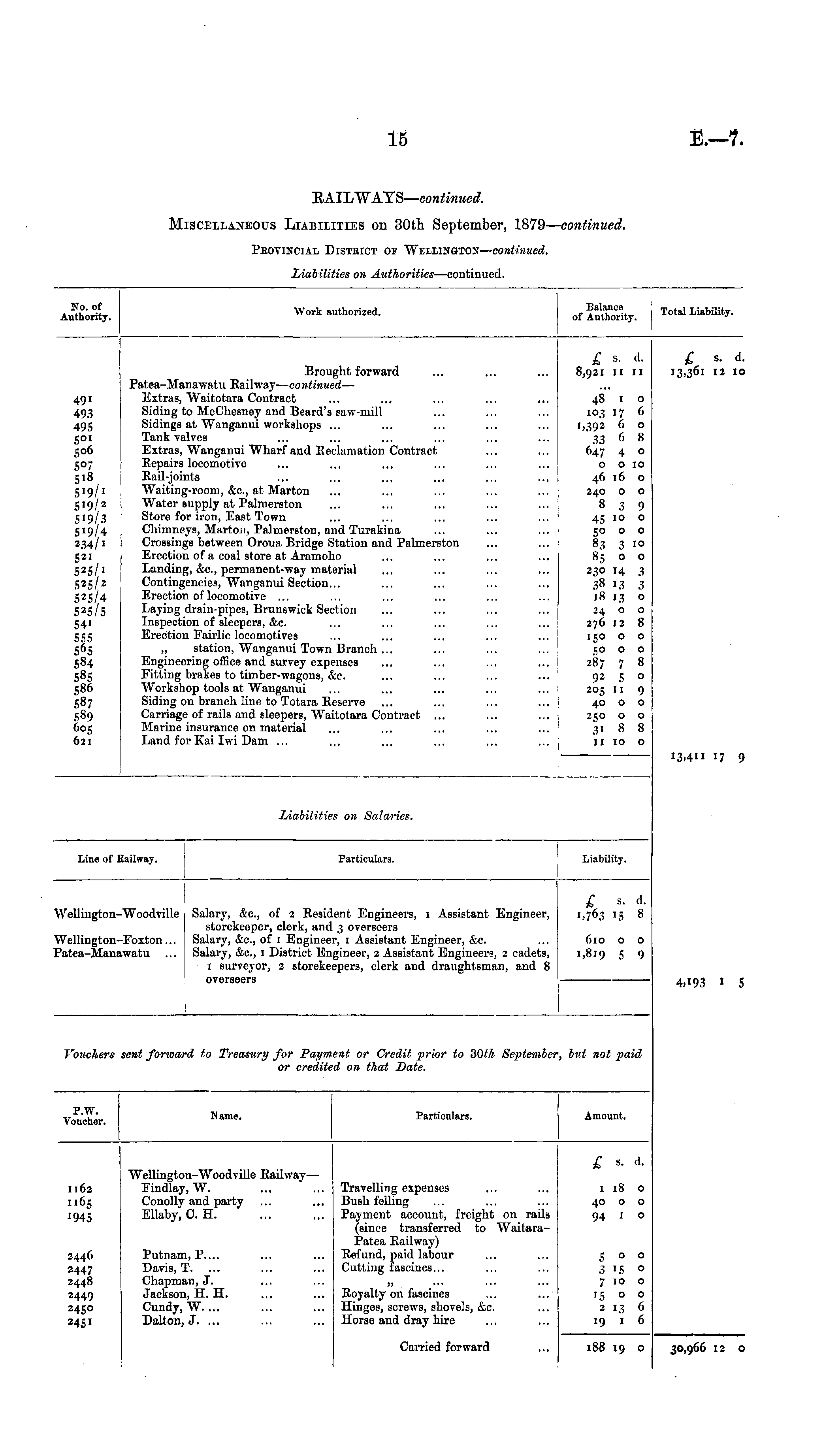 EAILWATS— continued. Miscellaneous Liabilities on 30th September, 1879 — continued. Provincial District of Wellington— continued. Liabilities on Authorities —continued. No. of Authority. Work authorized. Balance of Authority. Total Liability. £ »• J8,921 11 11 £ s. d. 13,361 12 10 491 493 495 S°l S o6 S°7 5«8 5J9/ 1 S'9/2 519/3 5'9/4 234/i 521 / 525/' 5 25/2 525/4 525/5 54' 555 565 584 585 586 587 589 605 621 Brought forward Patea-Mana-watu Railway— continued — Extras, Waitotara Contract Siding to McChesney and Beard's saw-mill Sidings at Wanganui workshops ... Tank valves Extras, Wanganui Wharf and Reclamation Contract Repairs locomotive Rail-joints Waiting-room, &c, at Marton Water Biipply at Palmerston Store for iron, East Town Chimneys, Marton, Palmerston, and Turakina Crossings between Oroua Bridge Station and Palmerston Erection of a coal store at Aramoho Landing, &c, permanent-way material Contingencies, Wanganui Section... Erection of locomotive ... Laying drain-pipes, Brunswick Section Inspection of sleepers, &c. Erection Fairlie locomotives „ station, Wanganui Town Branch ... Engineering office and survey expenses Fitting brakes to timber-wagons, &c. Workshop tools at Wanganui Siding on branch line to Totara Reserve Carriage of rails and sleepers, Waitotara Contract ... Marine insurance on material Land for Kai Iwi Dam ... 48 1 o 103 17 6 1,392 6 o '33 6 8 647 4 o o o 10 46 16 o 240 o o 839 45 10 o 5° ° o 83 3 10 85 o o 230 >4 3 38 13 3 18 13 o 24 o o 276 12 8 150 o o 50 o o 287 7 8 92 5 o 205 11 9 40 o o 250 o o 31 8 8 II 10 O '.Ml I I? 9 Liabilities on Salaries. Line of Railway. Particulars. Liability. Wellington-Woodville , Salary, &c, of 2 Resident Engineers, i Assistant Engineer, storekeeper, clerk, and 3 overseers Wellington-Foxton... Salary, &c, of 1 Engineer, 1 Assistant Engineer, &c. Patea-Manawatu ... Salary, &c, 1 District Engineer, 2 Assistant Engineers, 2 cadets, 1 surveyor, 2 storekeepers, clerk and draughtsman, and 8 overseers £ «• <*• 1,763 '5 8 610 o o 1,819 5 9 4.193 t S Vouchers sent forward to Treasury for Payn, or creditt tent or Credit prior to 30lh September, id on that Date. lut not paid P.W. Voucher. Name. Particulars. Amount. £ s. (i. 1162 1165 '945 Wellington-Woodville Railway— Findlay, W. Conolly and party Ellaby, C. H. Travelling expenses Bush felling Payment account, freight on rails (since transferred to WaitaraPatea Railway) Refund, paid labour Cutting fascines... 1 18 o 40 o o 94 1 0 2446 2447 2448 2 449 2450 2451 Putnam, P Davis, T. ... Chapman, J. Jackson, II. H. Cundy, W. ... Dalton, J. ... Royalty on fascines Hinges, screws, shovels, &c. Horse and dray hire 500 3 '5 ° 7100 15 o o 2 13 6 19 1 6 Carried forward 188 19 o 30,966 12 O