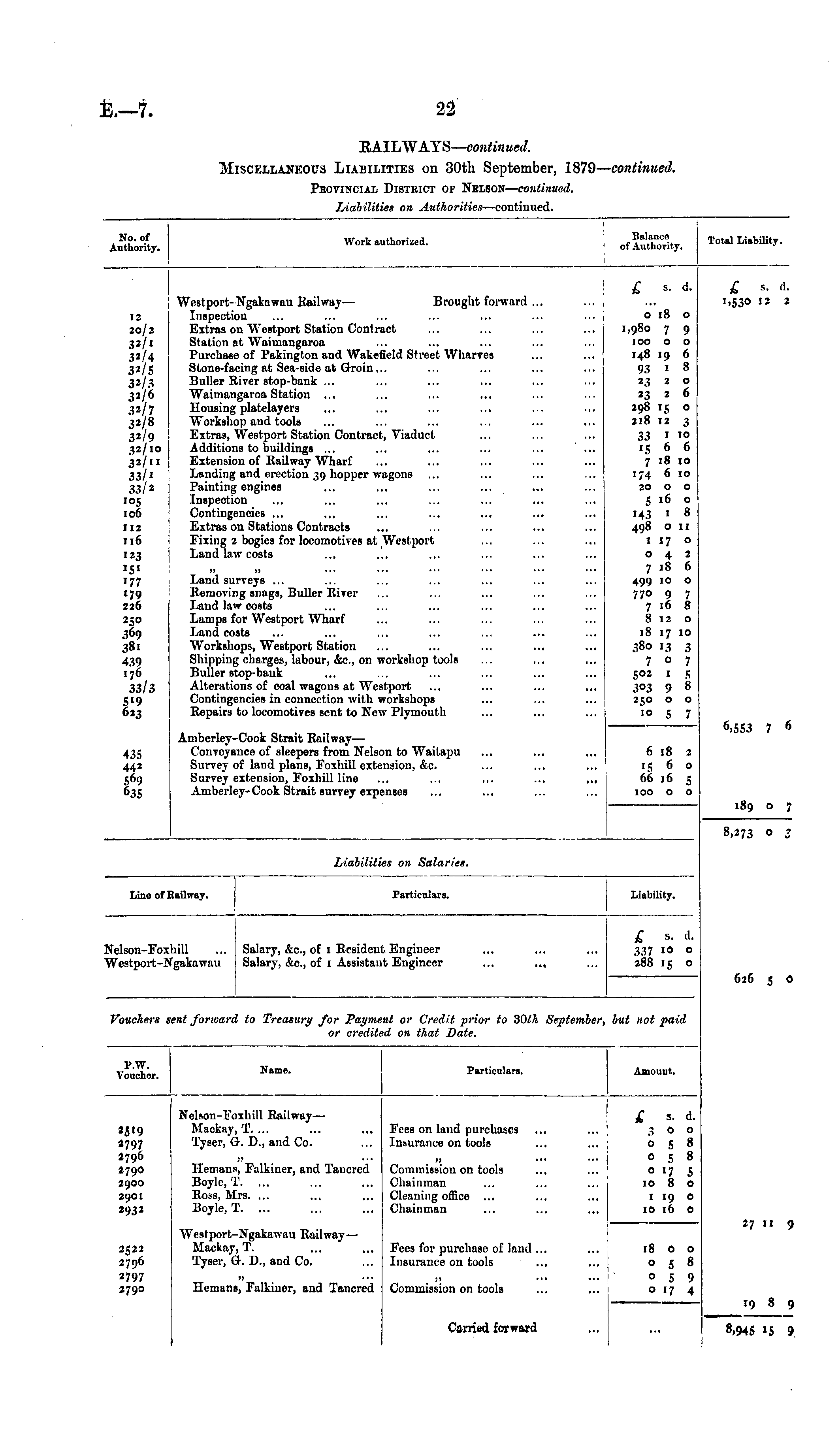 EAILWATS— continued. Miscellaneous Liabilities on 30th September, 1879 — continued. Provincial District of Nelson— continued. Liabilities on Authorities —continued. No. of Authority. Work authorized. Balance of Authority. Total Liability. £ s. d. £ *• <'■ 1.530 12 2 12 10 j 2 3»/« 3»/4 3Hl 32/6 32/7 3V8 32/9 32/10 32/" 33/1 33/2 106 Westport-Ngakawau Railway— Brought forward ... Inspection Extras on Westport Station Contract Station at Waimangaroa Purchase of Pakington and Wakefield Street Wharves Stone-facing at Sea-side at Groin... Buller River stop-bank ... Waimangaroa Station ... Housing platelayers Workshop and tools Extra?, Westport Station Contract, Viaduct Additions to buildings ... Extension of Railway Wharf Landing and erection 39 hopper wagons Painting engines Inspection Contingencies ... Extras on Stations Contracts Fixing 2 bogies for locomotives at Westport Land law costs 0 18 o 1,980 7 9 100 o o 148 ■9 6 93 1 8 23 2 o 23 2 6 298 15 o 218 12 3 33 ' »o 15 6 6 7 18 10 174 6 10 20 o o 5 16 o 143 " 8 498 on 1 17 o 042 7 18 6 499 10 o 77O 9 7 7 16 8 8 12 o 18 17 10 380 13 3 7 o 7 5°2 1 S 303 9 8 250 o o 'o 5 7 112 116 123 «5« 177 •79 226 369 38 > 439 ,76 33J3 519 623 Land surveys ... Removing snags, Buller River Land law costs Lamps for W Testport Wharf Land costs Workshops, Westport Station Shipping charges, labour, &c, on workshop tools Buller stop-bank Alterations of coal wagons at Westport Contingencies in connection with workshops Repairs to locomotives sent to New Plymouth 435 442 569 635 Amberley-Cook Strait Railway— Conveyance of sleepers from Nelson to Waitapu Survey of land plans, Foxhill extension, &c. Survey extension, Foxhill line Amberley-Cook Strait survey expenses 6,553 7 6 6 18 2 15 6 o 66 16 5 100 o o 189 o 7 8,273 o J Liabilities on Salaries. Line of Railway. Particulars. Liability. Nelson-Foxhill ... Salary, &c, of 1 Resident, Engineer Westport-Ngakawan Salary, &c, of 1 Assistant Engineer £ s. A. 337 10 o 288 15 o 626 5 0 Vouchers lent forward to Treasury for Pai/mei or credile lit or Credit prior to 30th September, but not paid 'd on that Date. P/W. Toucher. Name. Particulars. Amount. *{'9 1797 2796 2790 2900 2901 2932 Nelson-Foxhill Railway— Mackay, T. ... Tyser, G. D., and Co. Fees on land purchases Insurance on tools 300 058 058 0 !7 5 1080 1 19 o 10 16 o Heman?, Falkiner, and Tancrcd Boyle, T. ... Koss, Mrs. ... Boyle, T Commission on tooU Chaimnan Cleaning office ... Chainman 2522 2796 2797 2790 Westport-Ngakawau Railway— Mackay, T. Tyser, G. D., and Co. Fees for purchase of land ... Insurance on tools 27 II 9 18 o o o 5 8 o 17 4 19 8 9 8,945 '5 9 Henians, Falkiuer, and Tancred j) ... Commission on tools Carried forward