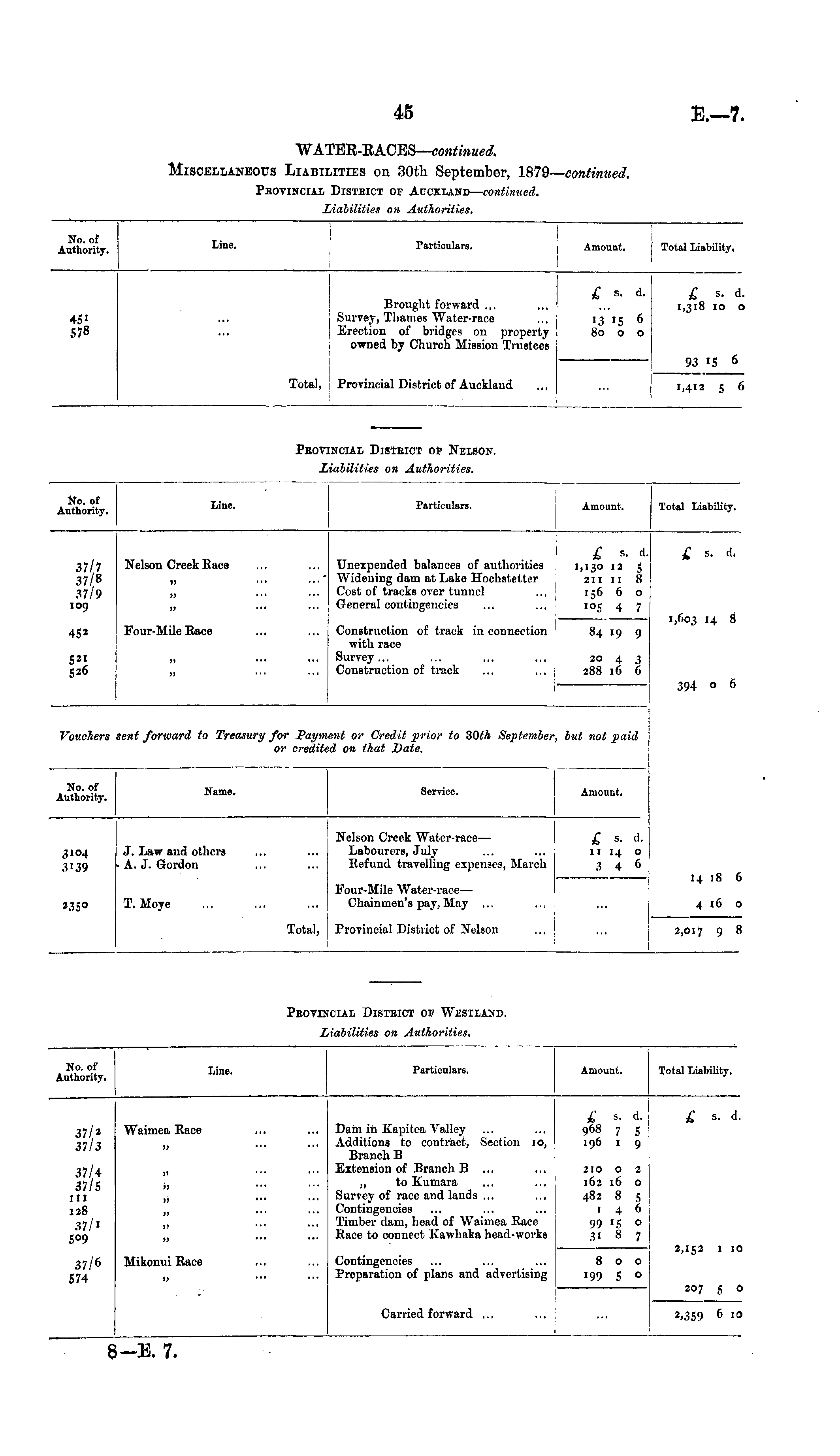 No. of Authority. Line. Particulars. Amount. Total Liability. 37/7 37/8 37/9 109 Nelson Creek Race », I Unexpended balances of authorities Widening dam at Lake Hochstetter Cost of tracks over tunnel General contingencies ... ... 1 £ «• d. 1,130 12 5 211 11 8 156 6 o 105 4 7 £ s- d. ,, ,, Four-Mile Race Construction of track in connection with race 84 19 9 1,603 14 8 452 521 526 ,, Survey... Construction of track 20 4 3 288 16 6 394 o 6 ,, |- i 7 rouchers :ent forward to Treasury for Paym or crediti ent or Credit prior to 30th Septembe, >,d on that Date. -, but not paid No. of Authority. Name. Nelson Creek Water-race — Labourers, July Refund travelling expenses, March Service. £ s. d. 11 14 o 3 4 6 Amount. 14 18 6 3'04 3'39 J. Law and others A. J. Gordon 2350 T. Moye Four-Mile Water-race— Chainmen's pay, May ... ... 4 16 o Total, Provincial District of Nelson 2,017 9 8