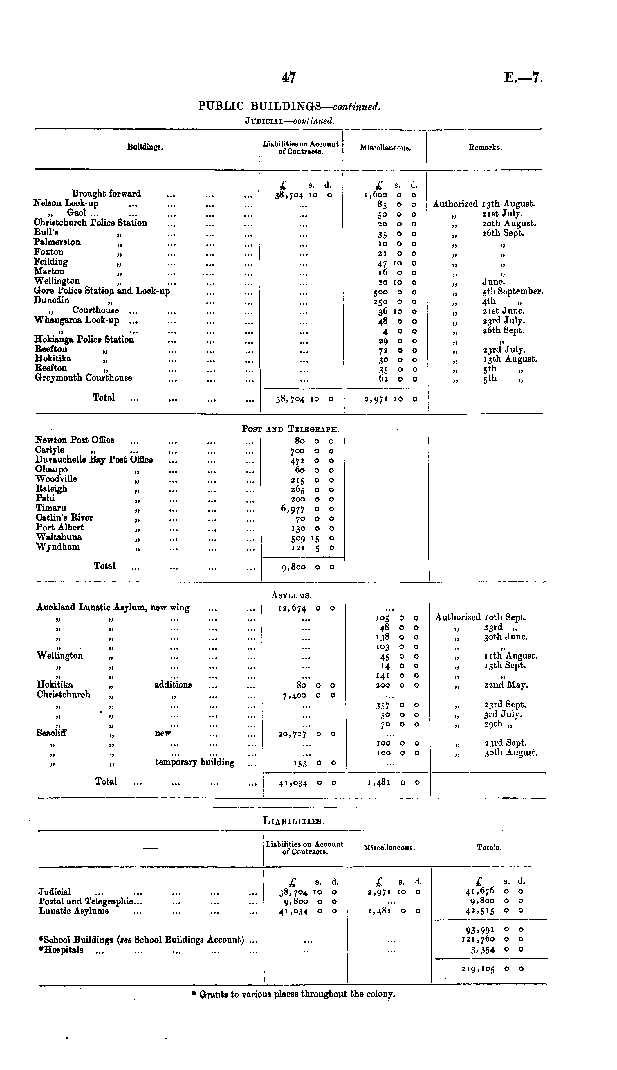 PUBLIC BUILDINGS—co, tinned. Judicial— continued. Buildings. Liabilities on Account of Contracts. Miscellaneous. Remarks. Brought forward Nelson Lock-up „ Gaol Christchurch Police Station Bull's Palmerston „ Foxton „ Feilding „ Marton „ Wellington „ Gore Police Statiou and Lock-up Danediu „ „ Courthouse Whangaroa Lock-up ... £ s. d. 38,704 10 o £ s. d. 1,600 o o 85 o o 50 o o 20 O O 35 ° ° 1000 21 0 0 47 10 o 16 o o 20 10 O 500 o o 250 o o 36 10 o 48 o o 400 29 o o 7200 30 o o 35 o ° 62 o o Authorized 13th August. „ 21st July. „ 20th August. „ 26th Sept. » 11 jj » tj » jj jj ,, June. ,, 5th September. 4th „ 21st June. „ 23rd July. „ 26th Sept. u ... ... Hokianga Police Station Reef ton „ Hokitika „ Reef ton „ Grey mouth Courthouse >j jj „ 23rd July. „ 13th August. 5th Total ... 38,704 10 o 2,971 10 o Pos' and Telegraph. 80 o o 700 o o 472 o o 60 o o 215 o o 265 o o 200 o o 6,977 o o 70 o o 130 o o 5°9 '5 ° 121 5 o Newton Post Office Carlyle „ Duvauchelle Bay Post Office Ohaupo „ Woodville „ Raleigh „ Pahi Tim aru „ Catlin's River „ Port Albert „ Waitalmna „ Wyndham „ Total 9,800 o o Auckland Lunatic Asylum, new wing Asylums. 12,674 o o » 1) ... •■• »> a ■ «« •■• i) a ... Wellington „ 105 o o 48 o o 138 o o 103 o o 45 o o 1400 141 o o 200 o o Authorized 10th Sept. „ 23rd ,, ,, 30th June. j. jj „ nth August. „ 13th Sept. ty )j «•• «•■ fi jj ... Hokitika „ additions Christchurch „ „ 80 o o 7,400 o o „ 22nd Slay. ,, ), ... ... 357 ° ° 5° o ° 70 o o „ 23rd Sept. „ 3rd July. „ 29th „ „ „ ... ... 11 jj ... ... Seacliff „ new 20,727 o o 100 o o 100 o o „ 23rd Sept. „ 30th August. ,, j, ... ... „ „ temporary building ' 53 ° o Total 1,481 o o 41,034 o o Liabilities. Liabilities on Account of Contracts. Miscellaneous. Totals. Judicial Postal and Telegraphic... Lunatic Asylums £ s. d. 38,704 10 o 9,800 o o 41,034 o o £ B. d. 2,971 10 o 1,481 o o £ s. d. 41,676 o o 9,800 o o 42.5"S ° ° •School Buildings (see School Buildings Account.) ... ♦Hospitals 93.991 ° o 121,760 o o 3,354 o o 219,105 o o * Grants to various places throughout the colony.