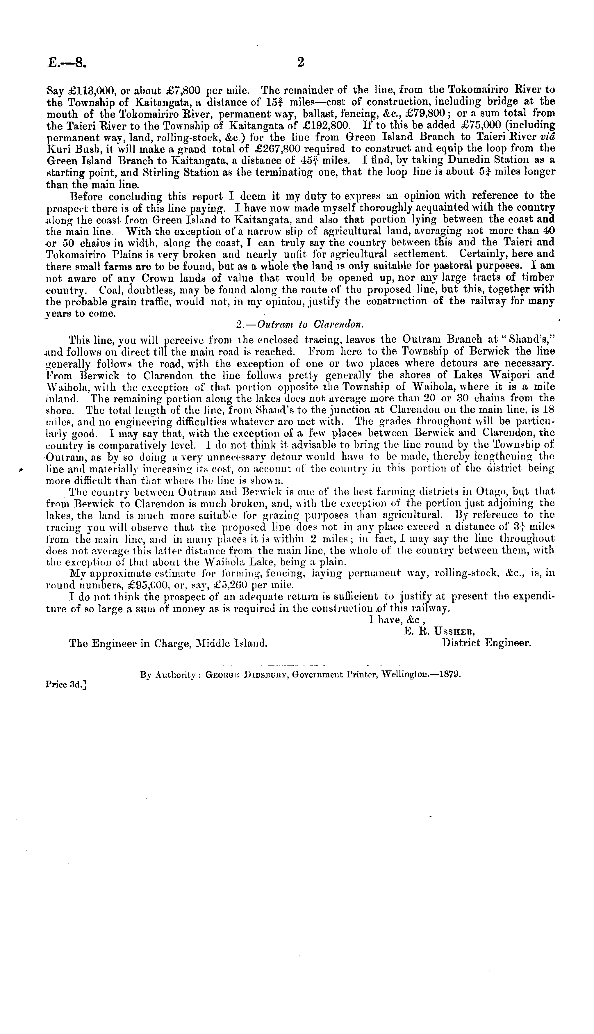 Say £113,000, or about £7,800 per mile. The remainder of the line, from the Tokomairiro River to the Township of Kaitangata, a distance of 15f miles —cost of construction, including bridge at the mouth of the Tokomairiro River, permanent way, ballast, fencing, &c, £79,800 ; or a sum total from the Taieri River to the Township of Kaitangata of £192,800. If to this be added £75,000 (including permanent way, land, rolling-stock, &c.) for the line from Green Island Branch to Taieri River via Kuri Bush, it will make a grand total of £267,800 required to construct and equip the loop from the Green Island Branch to Kaitangata, a distance of 45;; miles. I find, by taking Dunedin Station as a starting point, and Stirling Station as the terminating one, that the loop line is about 5} miles longer than the main line. Before concluding this report I deem it my duty to express an opinion with reference to the prospect there is of this line paying. I have now made myself thoroughly acquainted with the country along the coast from Green Island to Kaitangata, and also that portion lying between the coast and the main line. Witli the exception of a narrow 7 slip of agricultural land, averaging not more than 10 or 50 chains in width, along the coast, I can truly say the country between this and the Taieri and Tokomairiro Plains is very broken and nearly unfit for agricultural settlement. Certainly, here and there small farms are to be found, but as a whole the laud is only suitable for pastoral purposes. I am irot aware of any Crown lands of value that would be opened up, nor any large tracts of timber country. Coal, doubtless, may be found along the route of tho proposed line, but this, together with the probable grairr traffic, would not, in my opinion, justify the construction of the railway for many years to come. 2. — Oittram to Clarendon. This line, you will perceive from Ihe enclosed tracing, leaves the Outram Branch at " Shand's," and follows ou'direct till the main road is reached. From here to the Township of Berwick the line generally follows the road, with the exception of one or two places where detours are necessary. Prom Berwick to Clarendon tho line follows pretty generally the shores of Lakes Waipori and \\ ailrola, with the exception of that portion opposite the Township of Waihola, where it is a mile inland. The remaining portion along the lakes decs not average more tharr 20 or 30 chains from the shore. The total length of the line, from Shand's to the junction at Clarendon on the main line, is 18 miles, and no engineering difficulties whatever are met with. The grades throughout will be particularly good. I may say that, with the exception of a few places between Berwick and Clarendon, the country is comparatively level. Ido not think it advisable to bring the line round by the Township of Outram, as by so doing a very unnecessary detour worrld have to be made, thereby lengthening the line and materially increasing its cost, on account of the country iv this portion of the district being more difficult than that where the litre is shown. The country between Outram arrd Berwick is one of the best: fanning districts in Otago, but that from Berwick to Clarendon is much broken, and, with the exception of the portion just adjoining the lakes, the land is much more suitable for grazing purposes than agricultural. By reference to the tracing you will observe that the proposed line does not irr any place exceed a distance of 31 miles from the main line, and in many places it is within 2 miles; in fact, I may say the line throughout dues not average this latter distance from the main line, the whole of the country between them, with the exception of that about the Waihola Lake, being a plain. My approximate estimate for forming, fencing, laying permanent way, rolling-stock, &c, is, in round numbers, £95,000, or, say, £5,200 per mile. I do not think the prospect of an adequate return is sufficient to justify at present the expenditure of so large a sum of money as is required in the construction .of this railway. 1 have, &c, E. R. Ussher, The Engineer in Charge, Middle Island. District Engineer. By Authority : Gkorgk Diuseurv, Government Printer, Wellington.—lB79. Price 3d.]