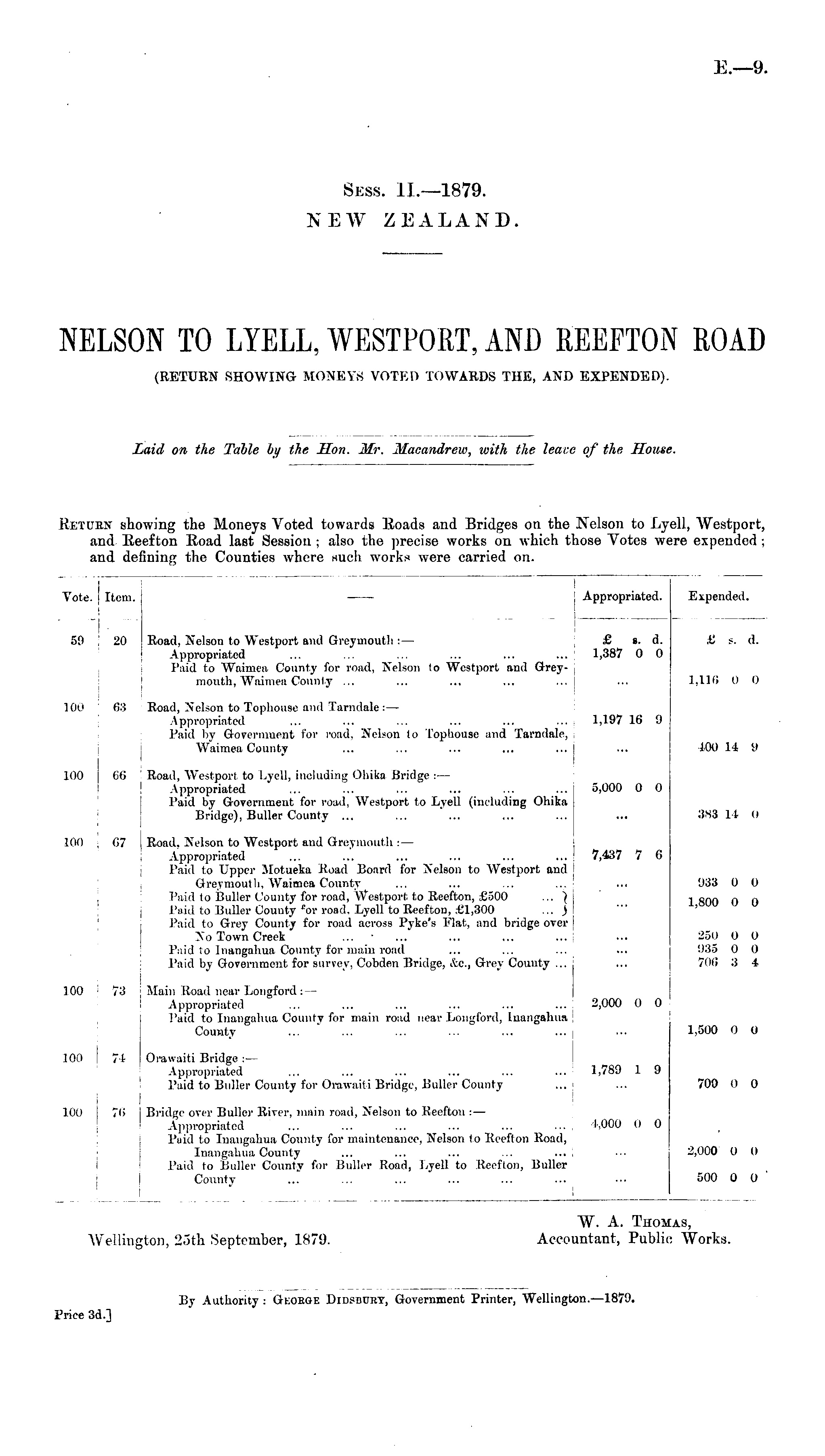 RETURN showing the Moneys Voted towards Roads and Bridges on the Nelson to Lyell, Westport, and Reefton Road last Session; also the precise works on which those Votes were expended; and defining the Counties where such works were carried on.