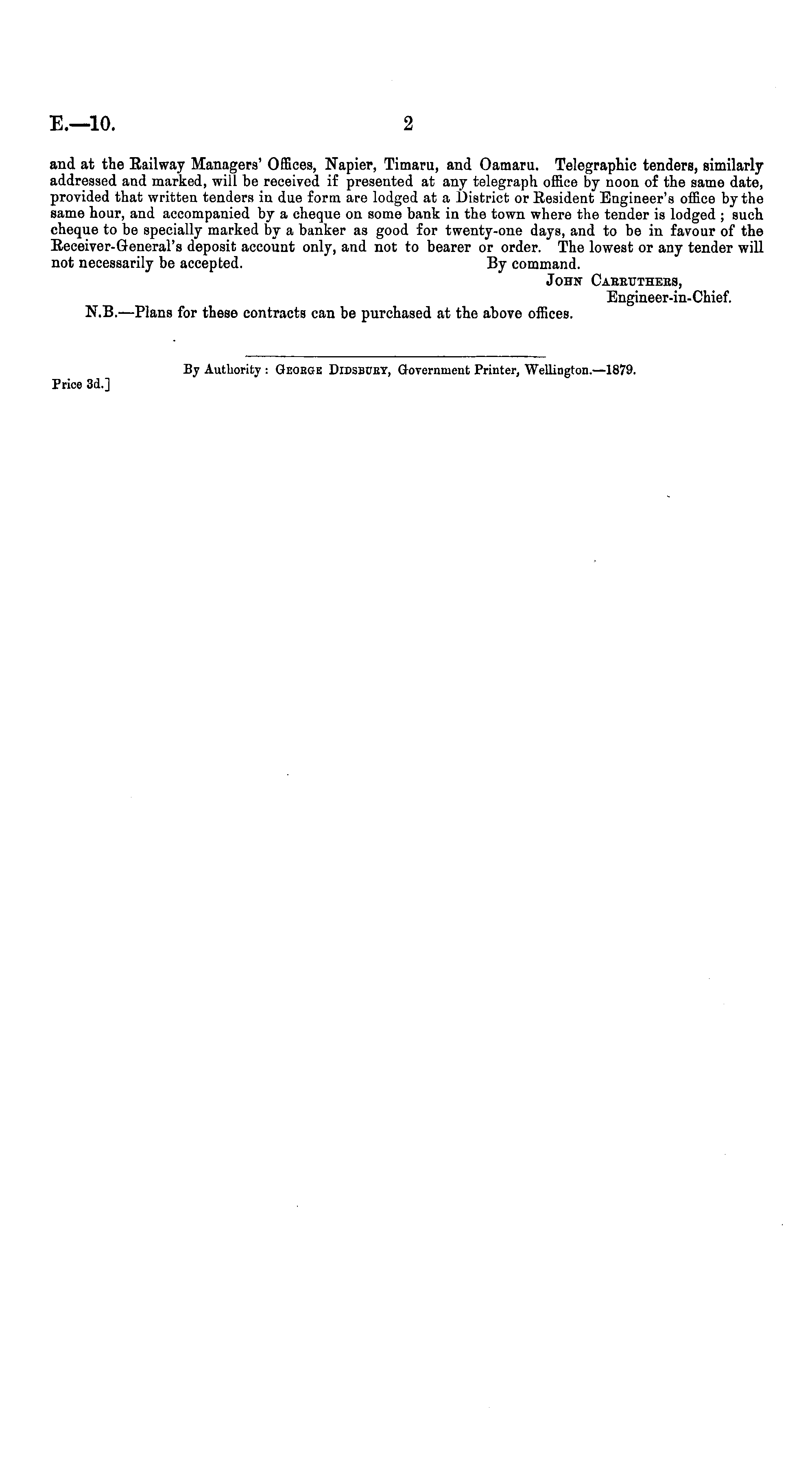 and at the Railway Managers' Offices, Napier, Timaru, and Oamaru. Telegraphic tenders, similarly addressed and marked, will be received if presented at any telegraph office by noon of the same date, provided that written tenders in due form are lodged at a .District or Resident Engineer's office by the same hour, and accompanied by a cheque ou some bank in the town where the tender is lodged ; such cheque to be specially marked by a banker as good for twenty-one days, and to be in favour of the Receiver-General's deposit account only, and not to bearer or order. The lowest or any tender will not necessarily be accepted. By command. John Carruthers, Engineer-in-Chief. N.B.—Plans for these contracts can be purchased at the above offices. By Authority : Geoege Didsbcby, Government Frinter, Wellington.—lB79. Brice 3d.]