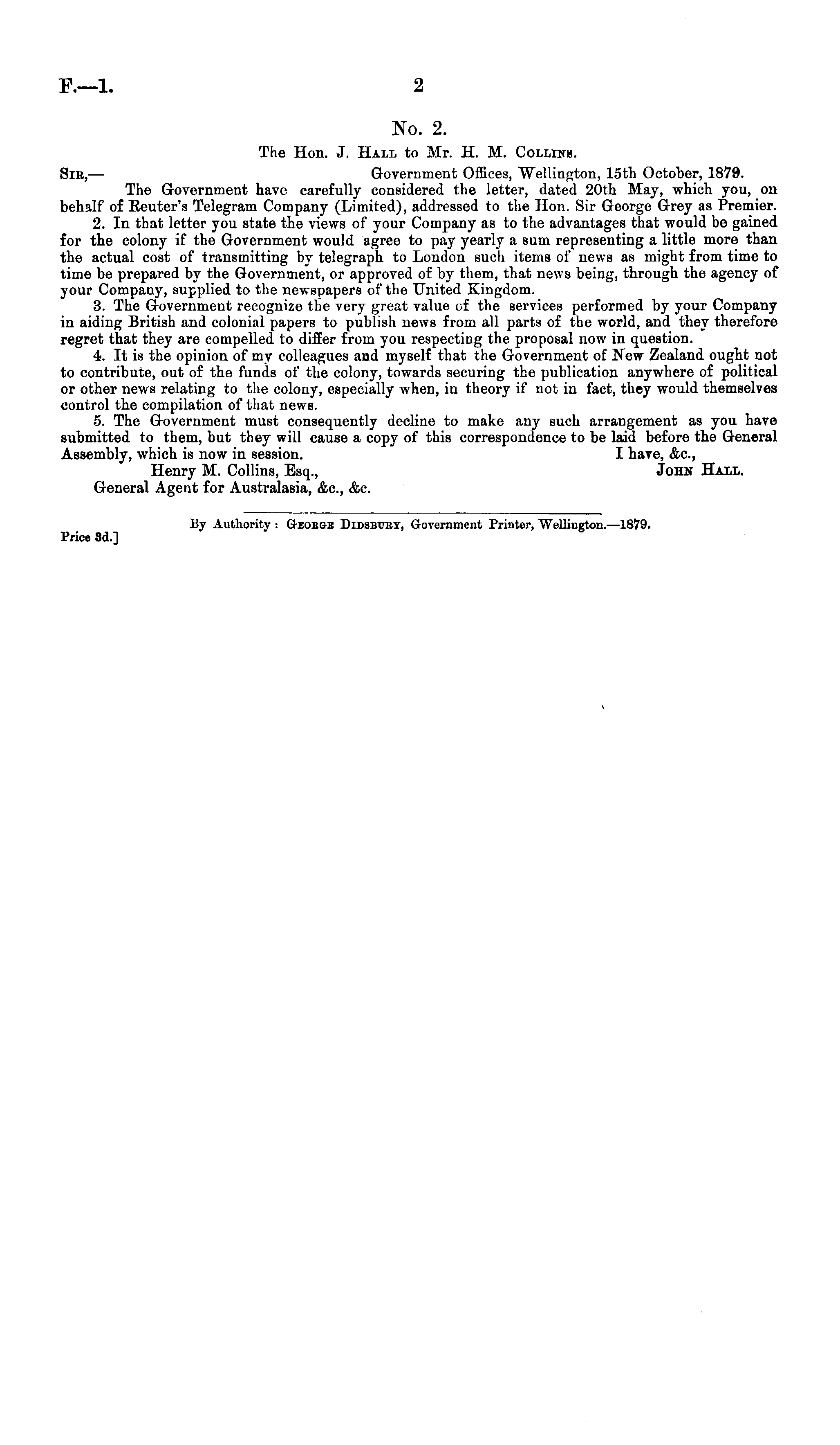 No. 2. The Hon. J. Hall to Air. H. M. Collinb. Sir, — Government Offices, Wellington, 15th October, 1879. The Government have carefully considered the letter, dated 20th May, which you, on behalf of Reuters Telegram Company (Limited), addressed to the Hon. Sir George Grey as Premier. 2. In that letter you state the views of your Company as to the advantages that would be gained for the colony if the Government would agree to pay yearly a sum representing a little more than the actual cost of transmitting by telegraph to London such items of news as might from time to time be prepared by the Government, or approved of by them, that news being, through the agency of your Company, supplied to the newspapers of the United Kingdom. 3. The Government recognize the very great value of the services performed by your Company in aiding British and colonial papers to publish news from all parts of the world, and they therefore regret that they are compelled to differ from you respecting the proposal now in question. 4. It is the opinion of my colleagues and myself that the Government of New Zealand ought uot to contribute, out of the funds of the colony, towards securing the publication anywhere of political or other news relating to the colony, especially when, in theory if not in fact, they would themselves control the compilation of that news. 5. The Government must consequently decline to make any such arrangement as you have submitted to them, but they will cause a copy of this correspondence to be laid before the General Assembly, which is now in session. I have, &c, Henry M. Collins, Esq., John Hall. General Agent for Australasia, &c, &c.