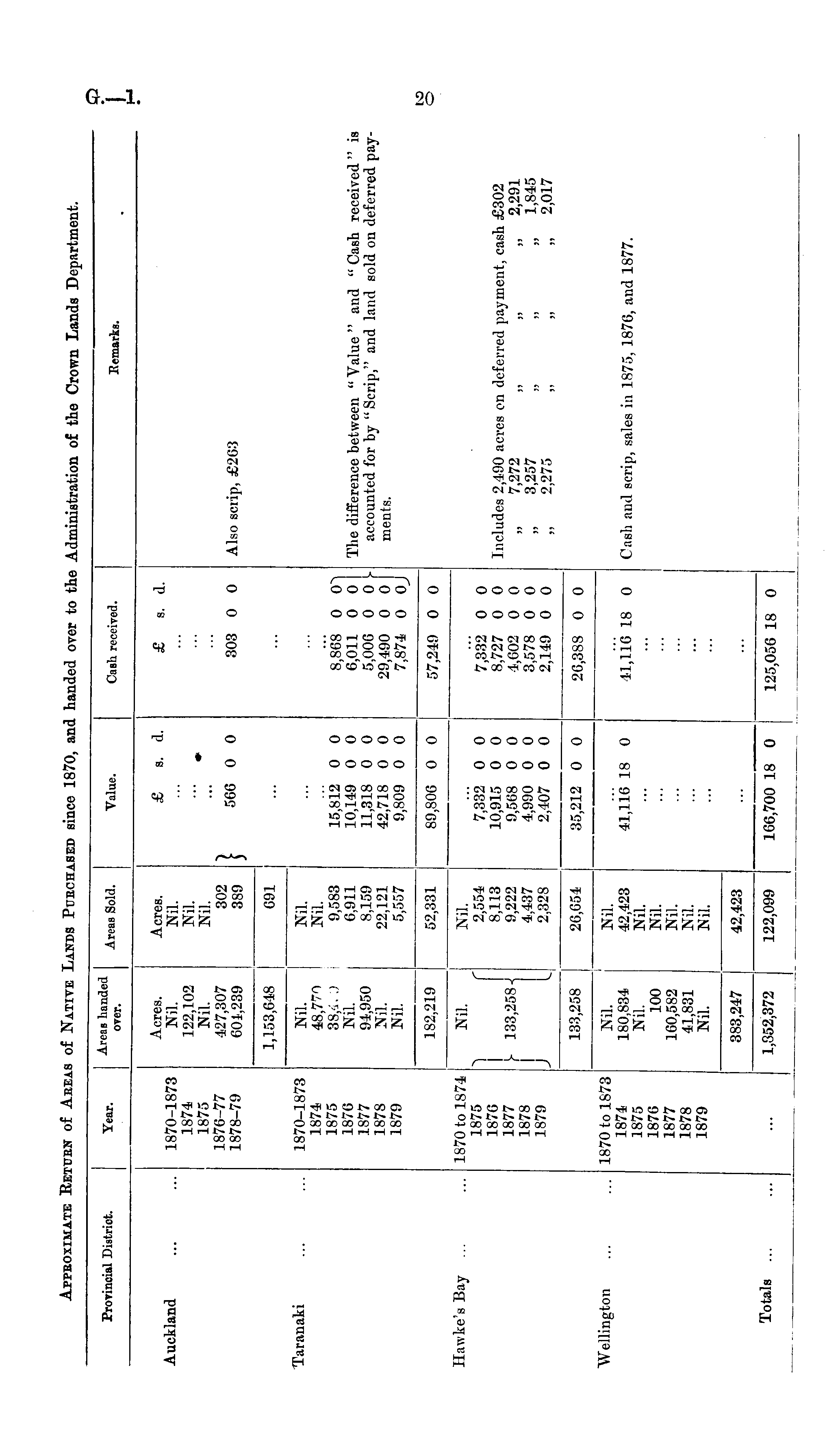 Provincial District. Year. Areas handed over. Areas Sold. Value. Cash received. Remarks. Auckland 1870-1873 1874 1875 1876-77 1878-79 Acres. Nil. 122,102 Nil. 427,307 601,239 Acres. Nil. Nil. Nil. 302 3S9 £ s. * d. £ s. d. Taranaki } 566 0 0 303 0 0 Also scrip, £263 1870-1873 1874 1875 1870 1877 1878 1879 1,153,618 691 Nil. 48,770 384-9 Nil. 91,950 Nil. Nil. Nil. Nil. 9,583 6,911 8,159 22,121 5,557 15,812 10,149 11,318 42,718 9,809 0 0 0 0 0 0 0 0 0 0 8,868 6,011 5,006 29,490 7,874 0 0"| 0 0 0 0 » 0 0 0 0_, The difference between "Value" and "Cash received" is accounted for by "Scrip," and land sold on deferred payments. Hawke's Bay 1870 to 1874 1875 1870 1877 1878 1879 Nil. 182,219 52,331 89,806 0 0 57,249 0 0 _ J f 133,258<| Nil. 2,554 8,113 9,222 4,437 2,328 7,332 10,915 9,568 4,990 2,407 0 0 0 0 0 0 0 0 0 0 7,332 8,727 4,602 3,578 2,149 0 0 0 0 0 0 0 0 0 0 Includes 2,490 acres on deferred payment, cash £302 „ 7,272 „ „ „ 2,291 „ 3,257 „ ,, „ 1,845 ° 975 2 017 JJ fl. ,W JJ ,1 JJ __.,VJJLI AVellington 1870 to 1873 1874 1875 1876 1877 1878 1879 133,258 Nil. 180,834 Nil. 100 160,582 41,831 Nil. 26,654 Nil. 42,423 Nil. Nil. Nil. Nil. Nil. 35,212 0 0 20,388 0 0 Cash aud scrip, sales in 1875, 1876, and 1877. 41,116 18 0 11,110 18 0 Totals 383,247 42,423 1,852,372 122,099 166,700 18 0 125,056 18 0