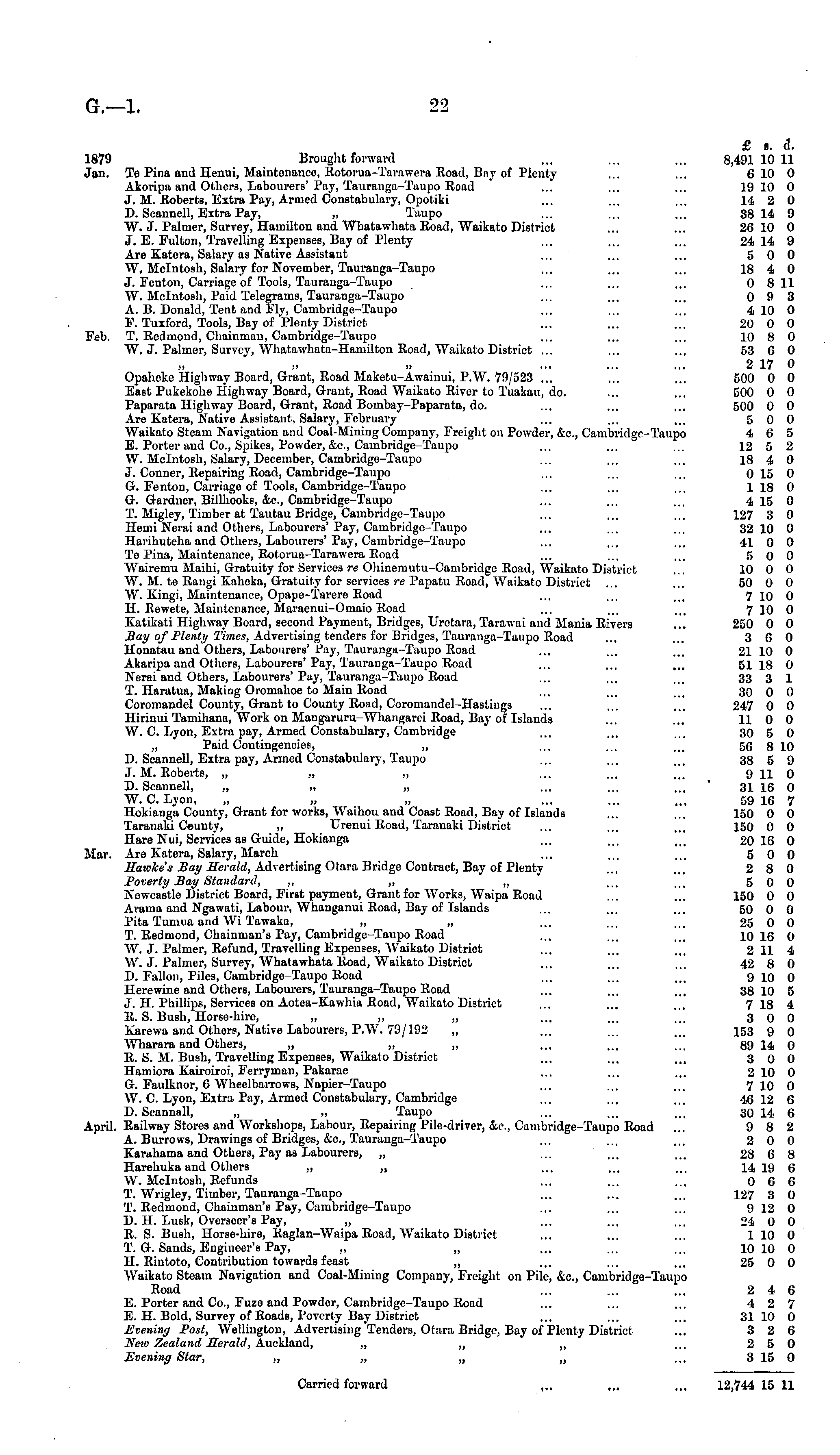 £ s. i. 1879 Brought forward ... ... ... 8,49110 11 Jan. Te Pina and Henui, Maintenance, Rotorua-Tarawcra Road, Bay of Plenty ... ... 610 0 Akoripa and Others, Labourers' Pay, Tauranga-Taupo Road ... ... ... 19 10 0 J. M. Roberts, Extra Pay, Armed Constabulary, Opotiki ... ... ... 14 2 0 D. Seannell, Extra Pay, „ Taupo ... ... ... 38149 W. J. Palmer, Survey, Hamilton and AVhatawhata Road, AVaikato District ... ... 26 10 0 J. E. Fulton, Travelling Expenses, Bay of Plenty ... ... ... 24 14 9 Are Katera, Salary as Native Assistant ... ... ... 500 W, Mcintosh, Salary for November, Tauranga-Taupo ... ... ... 18 4 0 J. Fenton, Carriage of Tools, Tauranga-Taupo ... ... ... 0 8 11 AY. Mcintosh, Paid Telegrams, Tauranga-Taupo ... ... ... 093 A. B. Donald, Tent and Fly, Cambridge-Taupo ... ... 4 10 0 F. Tuxford, Tools, Bay of Plenty District ... ... ... 20 0 0 Feb. T, Redmond, Chainman, Cambridge-Taupo ... ... ... 10 8 0 AY. J. Palmer, Survey, Whatawhata-Hamilton Road, Waikato District ... ... ... 53 6 0 2 17 0 Opaheke Highway Board, Grant, Road Maketu-Awainui, P.W. 79/523 ... ... ... 500 0 0 East Pukekohe Highway Board, Grant, Road Waikato River to Tuakau, do. ... ... 500 0 0 Paparata Highway Board, Grant, Road Bombay-Paparata, do. ... ... ... 500 0 0 Are Katera, Native Assistant. Salary, February ... ... ... 5 0 0 AVaikato Steam Navigation and Coal-Mining Company, Freight ou Powder, &c, Cambridge-Taupo 4 6 5 E. Porter and Co., Spikes, Powder, __c., Cambridge-Taupo ... ... ... 12 5 2 W. Mcintosh, Salary, December, Cambridge-Taupo ... ... ... 18 4 0 J. Conner, Repairing Road, Cambridge-Taupo ... ... ... 0150 G. Fenton, Carriage of Tools, Cambridge-Taupo ... ... ... 1 18 0 G. Gardner, Billhooks, &c., Cambridge-Taupo ... ... ... 4 15 0 T. Migley, Timber at Tautau Bridge, Cambridge-Taupo ... ... ... 127 3 0 Hemi Nerai and Others, Labourers' Pay, Cambridge-Taupo ... ... ... 32 10 0 Harihuteha and Others, Labourers' Pay, Cambridge-Taupo ... ... ... 41 0 0 Te Pina, Maintenance, Eotorua-Tarawera Road ... ... ... 5 o 0 Wairemu Maihi, Gratuity for Services re Ohinemutu-Cambridge Road, AVaikato District ... 10 0 0 W. M. te Rangi Kaheka, Gratuity for services re Papatu Road, AVaikato District ... ... 50 0 0 AA T. Kingi, Maintenance, Opape-Tarere Eoad ... ... ... 7 10 0 H. Eewete, Maintenance, Maraenui-Omaio Eoad ... ... ... 7 10 0 Katikati Highway Board, second Payment, Bridges, Uretara, Tarawai and Mania Eivers ... 250 0 0 _Z_ ay of Plenty Times, Advertising tenders for Bridges, Tauranga-Taupo Eoad ... ... 3 6 0 Honatau and Others, Labourers' Pay, Tauranga-Taupo Eoad ... ... ... 21 10 0 Akaripa and Others, Labourers' Pay, Tauranga-Taupo Road ... ... ... 51 18 0 Nerai aud Others, Labourers' Pay, Tauranga-Taupo Road ... ... ... 33 3 1 T. Haratua, Makiug Oromahoe to Main Road ... ... ... 30 0 0 Coromandel County, Grant to County Road, Coromandel-llastings ... ... ... 247 0 0 Hirinui Tamihana, AA'ork on Mangaruru-AVhangarei Road, Bay of Islands ... ... 11 0 0 W. C. Lyon, Extra pay, Armed Constabulary, Cambridge ... ... ... 30 5 0 „ Paid Contingencies, „ ... ... ... 56 8 10 D. Seannell, Extra pay, Armed Constabulary, Taupo ... ... ... 38 5 9 J. M. Eoberts, „ „ „ ... ... ... 9 11 0 D. Seannell, „ „ „ ... ... ... 31 16 O W.C.Lyon, „ „ „ ... ... ... 59 16 7 Hokianga County, Grant for works, AVaihou and Coast Road, Bay of Islands ... ... 150 0 0 Taranaki County, „ Lrenui Eoad, Taranaki District ... ... ... 150 0 0 Hare Nui, Services as Guide, Hokianga ... ... ... 20 16 0 Mar. Are Katera, Salary, March ... ... ... 500 Bawke's Pay Berald, Advertising Otara Bridge Contract, Bay of Plenty ... ... 2 8 0 Poverty Bay Standard, ~ „ „ ... ... 5 0 0 Newcastle District Board, First payment, Grant for Works, Waipa Road ... ... 150 0 0 Arama and Ngawati, Labour, AVhanganui Road, Bay of Islands ... ... ... 50 0 0 Pita Tumua and AVi Tawaka, „ „ ... ... ... 25 0 0 T. Redmond, Chainman's Pay, Cambridge-Taupo Road ... ... ... 10 16 0 AY. J. Palmer, Refund, Travelling Expenses, AVaikato District ... ... ... 2 11 4 AA r. J. Palmer, Survey, AVhatawhata Eoad, Waikato District ... ... ... 42 8 0 D. Fallon, Piles, Cambridge-Taupo Eoad ... ... ... y lo 0 Hercwine and Others, Labourers, Tauranga-Taupo Eoad ... ... ... 38 10 5 J. H Phillips, Services on Aotea-Kawhia Road, Waikato District ... ... ... 7 18 4 R. S. Bush, Horse-hire, „ „ „ ... ... ... 3 0 0 Karewa and Others, Native Labourers, P.W. 79/192 „ ... ... ... 153 9 0 AVTiarara and Others, „ „ „ ... ... ... 89 14 O E. S. il. Bush, Travelling Expenses, Waikato District ... ... ... 3 0 0 Hamiora Kairoiroi, Ferryman, Pakarac ... ... ... 2 10 0 G. Faulknor, 6 AVheelbarrows, Napier-Taupo ... ... ... 7 10 0 W. C. Lyon, Extra Pay, Armed Constabulary, Cambridge ... ... ... 46 12 6 D. Scannall, „ „ Taupo ... ... ... 30 14 6 April. Railway Stores and Workshops, Labour, Repairing Pile-driver, _c, Cambridge-Taupo Road ... 9 8 2 A. Burrows, Drawings of Bridges, &c, Tauranga-Taupo ... ... ... 200 Karahama and Others, Pay as Labourers, „ ... ... ... 28 6 8 Harehuka and Others „ „ ... ... ... 14 19 6 "W. Mcintosh, Eefunds ... ... ... 066 T. Wrigley, Timber, Tauranga-Taupo ... ... ... 127 3 0 T. Eedmond, Chainman's Pay, Cambridge-Taupo ... ... ... 9 12 O D. 11. Lusk, Overseer's Pay, „ ... ... ... 24 0 0 E. S. Bush, Horse-hire, Raglan-Waipa Road, AA'aikato District ... ... ... 1 10 0 T. G. Sands, Engineer's Pay, „ „ ... ... ... 10 10 0 11. Rintoto, Contribution towards feast „ ... ... ... 25 0 0 "Waikato Steam Navigation and Coal-Mining Company, Freight on Pile, &c, Cambridge-Taupo Eoad ... ... ... 2 4 6 E. Porter and Co., Fuze and Powder, Cambridge-Taupo Eoad ... ... ... 4 2 7 E. H. Bold, Survey of Roads, Poverty Bay District ... ... ... 3110 0 Evening Post, AVellington, Advertising Tenders, Otara Bridge, Bay of Plenty District ... 3 2 6 New Zealand Berald, Auckland, „ „ „ ... 2 5 0 Evening Star, „ „ „ „ ... 3 15 0 Carried 
