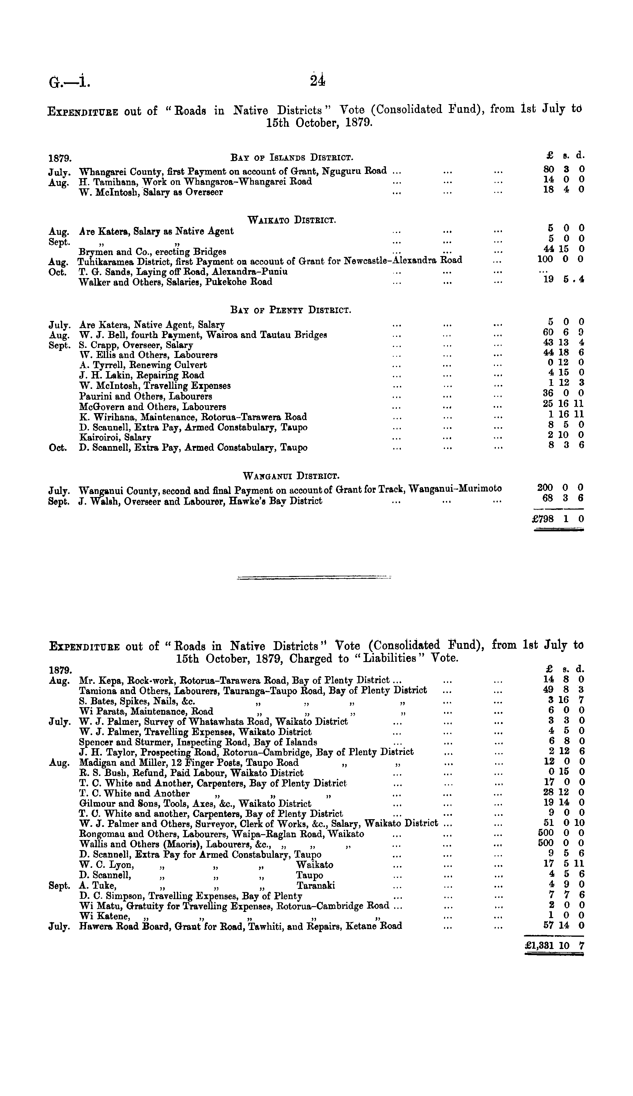 Expenditure out of "Roads in Native Districts" Vote (Consolidated Fund), from Ist July to 15th October, 1879, Charged to "Liabilities" Vote. 1879. £ s. d. Aug. Mr. Kepa, Eock-work, Eotorua-Tarawera Eoad, Bay of Plenty District... ... ... 14 8 0 Tamiona and Others, Labourers, Tauranga-Taupo Eoad, Bay of Plenty District ... ... 49 8 3 S. Bates, Spikes, Nails, &c. „ „ „ „ ... ... 3 16 7 Wi Parata, Maintenance, Eoad „ „ „ „ ••• ... 6 0 0 July. W. J. Palmer, Survey of Whatawhata Boad, Waikato District ... ... ... 3 3 0 W. J. Palmer, Travelling Expenses, Waikato District ... ... ... 450 Spencer and Stunner, Inspecting Eoad, Bay of Islands ... ... •■■ 680 J. H. Taylor, Prospecting Eoad, Eotorua-Cambridge, Bay of Plenty District ... ... 2 12 6 Aug. Madigan and Miller, 12 Finger Posts, Taupo Eoad „ „ ... ••• 12 0 0 E. S. Bush, Eefund, Paid Labour, Waikato District ... ... ••■ 0 15 0 T. C. White and Another, Carpenters, Bay of Plenty District ... ... ■•■ 17 0 0 T. C. White and Another „ „ „ ... ... ... 28 12 0 Gilmour and Sons, Tools, Axes, &c, Waikato District ... ... ••• 19 14 0 T. 0. White and another, Carpenters, Bay of Plenty District ... ... ... 9 0 0 W. J. Palmer and Others, Surveyor, Clerk of Works, &c, Salary, Waikato District ... ... 51 0 10 Eongomau aud Others, Labourers, Waipa-Eaglan Eoad, AVaikato ... ... ... 500 0 0 Wallis and Others (Maoris), Labourers, &c, „ „ „ ... ■•• ••■ 500 0 0 D. Seannell, Extra Pay for Armed Constabulary, Taupo ... ... ... 956 W.C.Lyon, „ ' „ „ Waikato ... ... ... 17 511 D. Seannell, „ „ „ Taupo ... ■•• ••• 456 Sept. A. Tuke, „ „ „ Taranaki ... ... ... 490 D. C. Simpson, Travelling Expenses, Bay of Plenty ... ... ■•■ 7 7 6 Wi Matu, Gratuity for Travelling Expenses, Eotorua-Cambridge Eoad ... ... ... 2 0 0 WiKatene, „ „ „ „ ... ... 10 0 July. Hawera Eoad Board, Grant for Eoad, Tawhiti, and Eepairs, Ketane Eoad ... ... 57 14 0 £1,331 10 7