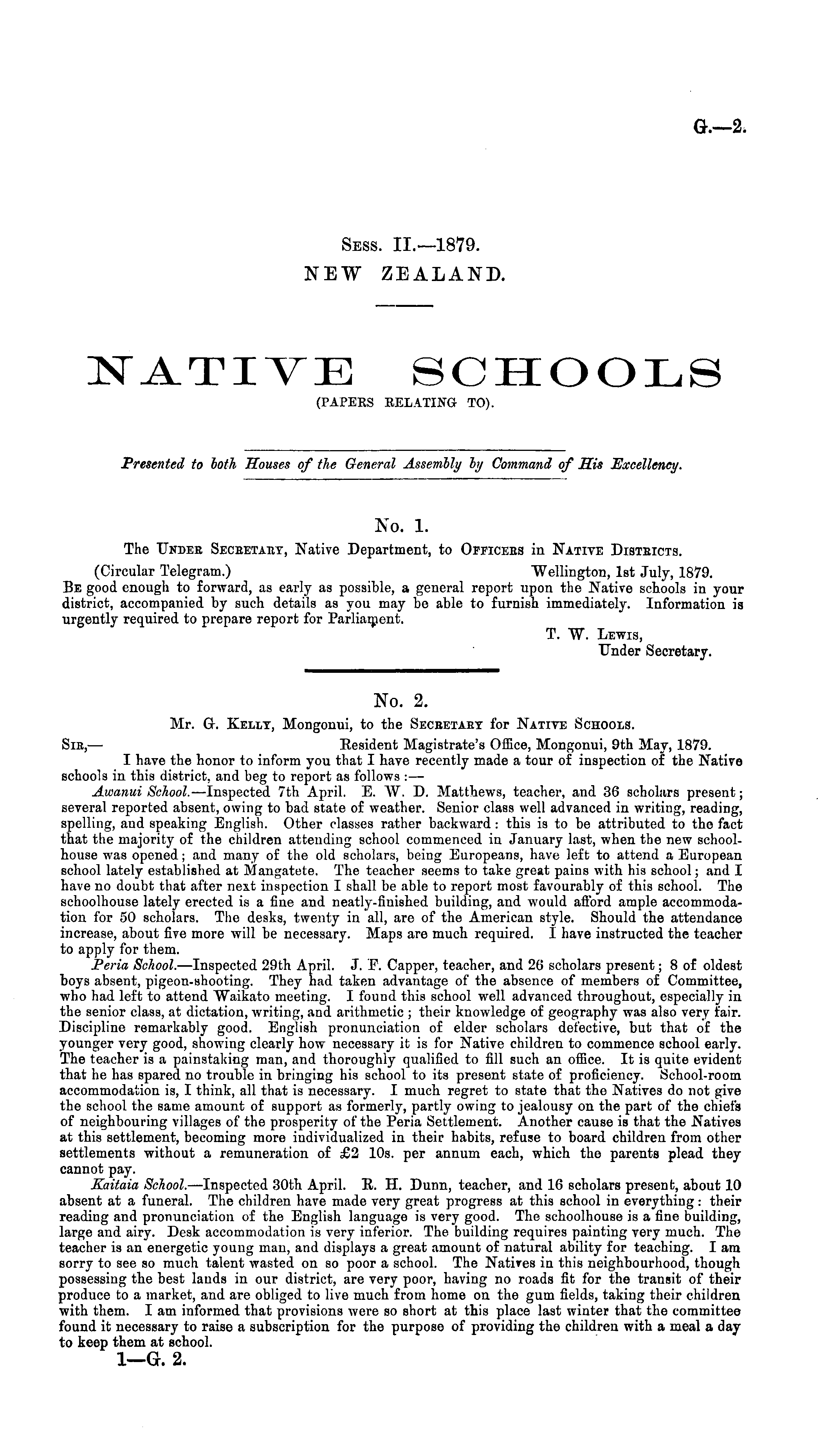 No. 1. The Under Seceetaey, Native Department, to Officers in Native Disteicts. (Circular Telegram.) Wellington, Ist July, 1879. Be good enough to forward, as early as possible, a general report upon the Native schools in your district, accompanied by such details as you may he able to furnish immediately. Information is urgently required to prepare report for Parliament. T. W. Lewis, Under Secretary.