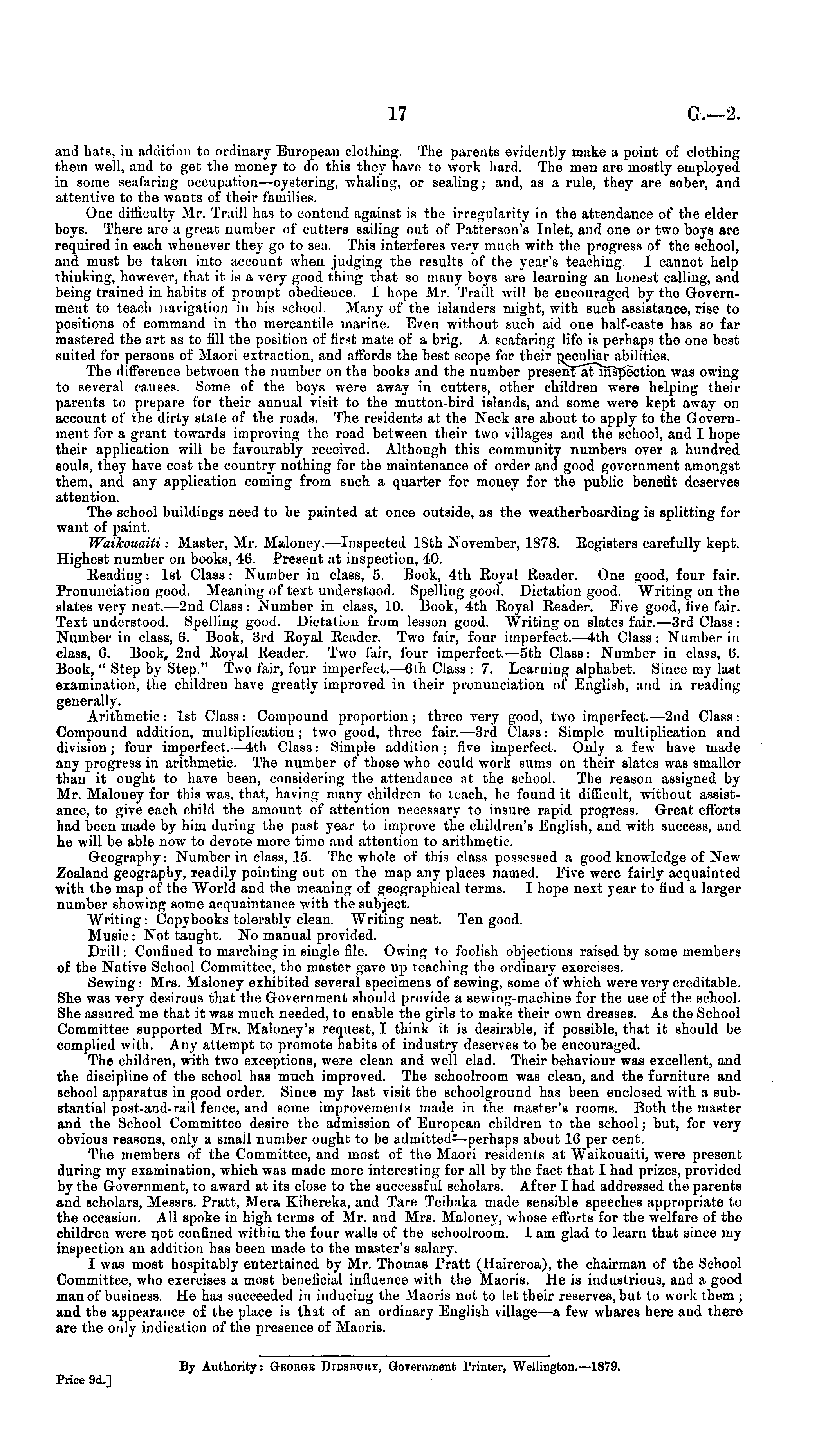 and hats, in addition to ordinary European clothing. The parents evidently make a point of clothirrg them well, and to get the money to do this they have to work hard. The men are mostly employed in some seafaring occupation—oystering, whaling, or sealing; and, as a rule, they are sober, and attentive to the wants of their families. One difficulty Mr. Traill has to contend against is the irregularity in the attendance of the elder boys. There are a great number of cutters sailing out of Patterson's Inlet, and one or two boys are required in each whenever they go to sea. This interferes very much with tho progress of the school, and must be taken into account when judging the results of the year's teaching. I cannot help thinking, however, that it is a very good thing that so rrrany boys are learning an honest calling, and being trained in habits of promot obedience. I hope Mr. Traill will be encouraged by the Government to teach navigation in his school. Many of the islanders might, with such assistance, rise to positions of command in the mercantile marine. Even without such aid one half-caste has so far mastered the art as to fill the position of first mate of a brig. A seafaring life is perhaps the one best suited for persons of Maori extraction, and affords the best scope for their peculiar abilities. The difference between the number on the books and the number presenTajTmsp'oction was owing to several causes. Some of the boys were away in cutters, other children were helping their parents to prepare for their annual visit to the mutton-bird islands, and some were kept away on account of the dirty state of the roads. The residents at the Neck are about to apply to the Government for a grant towards improving the road between their two villages aud the school, and I hope their application will be favourably received. Although this community numbers over a hundred souls, they have cost the country nothing for the maintenance of order and good government amongst them, and any application coming from such a quarter for money for the public benefit deserves attention. The school buildings need to be painted at once outside, as the weatherboarding is splitting for want of paint. Waikouaiti: Master, Mr. Maloney.—lnspected 18th November, 1878. Eegisters carefully kept. Highest number on books, 46. Present at inspection, 40. Eeading: Ist Class: Number in class, 5. Book, 4th Eoyal Eeader. One good, four fair. Pronuirciation good. Meaning of text understood. Spelling good. Dictation good. Writing on the slates very neat. —2nd Class: .Number in class, 10. Book, 4th Eoyal Eeader. Five good, five fair. Text understood. Spelling good. Dictation from lesson good. Writing on slates fair.—3rd Class : Number in class, 6. Book, 3rd Eoyal Eeader. Two fair, four imperfect. —4th Class: Number in class, 6. Book, 2nd Eoyal Eeader. Two fair, four imperfect.—sth Class: Number in class, 6. Book, " Step by Step." Two fair, four imperfect. —6th Class :7. Learning alphabet. Since my last examination, the children have greatly improved in their pronunciation of English, and in reading generally. Arithmetic: Ist Class: Compound proportion; three very good, two imperfect.—2nd Class: Compound addition, multiplication; two good, three fair. —3rd Class: Simple multiplication and division; four imperfect. —4th Class: Simple addition; five imperfect. Only a few have made any progress in arithmetic. The number of those who could work sums on their slates was smaller than it ought to have been, considering the attendance at the school. The reason assigned by Mr. Maloney for this was, that, having many children to teach, he found it difficult, without assistance, to give each child the amount of attention necessary to insure rapid progress. Great efforts had been made by him during the past year to improve the children's English, and with success, and he will be able now to devote more time and attention to arithmetic. Geography: Number in class, 15. The whole of this class possessed a good knowledge of New 7 Zealand geography, readily pointing out on the map any places named. Five were fairly acquainted with the map of the World and the meaning of geographical terms. I hope next year to find a larger number showing some acquaintance with the subject. Writing : Copybooks tolerably clean. Writing neat. Ten good. Music: Not taught. No manual provided. Drill: Confined to marching in single file. Owing to foolish objections raised by some members of the Native School Committee, the master gave up teaching the ordinary exercises. Sewing : Mrs. Maloney exhibited several specimens of sewing, some of which were very creditable. She was very desirous that the Government should provide a sewing-machine for the use of the school. She assured me that it was much needed, to enable the girls to make their own dresses. As the School Committee supported Mrs. Maloney's request, I thirrk it is desirable, if possible, that it should be complied with. Airy attempt to promote habits of industry deserves to be encouraged. The children, with two exceptions, were clean and well clad. Their behaviour was excellent, and the discipline of the school has much improved. The schoolroom was clean, and the furniture and school apparatus in good order. Since my last visit the schoolground has been enclosed with a substantial post-and-rail fence, and some improvements made in the master's rooms. Both the master and the School Committee desire the admission of Europearr children to the school; but, for very obvious reasons, only a small number ought to be admitted—perhaps about 16 per cent. The members of the Committee, and most of the Maori residents at Waikouaiti, were present during my examination, which was made more interesting for all by the fact that I had prizes, provided by the Government, to award at its close to the successful scholars. After I had addressed the parents and scholars, Messrs. Pratt, Mera Kihereka, and Tare Tei