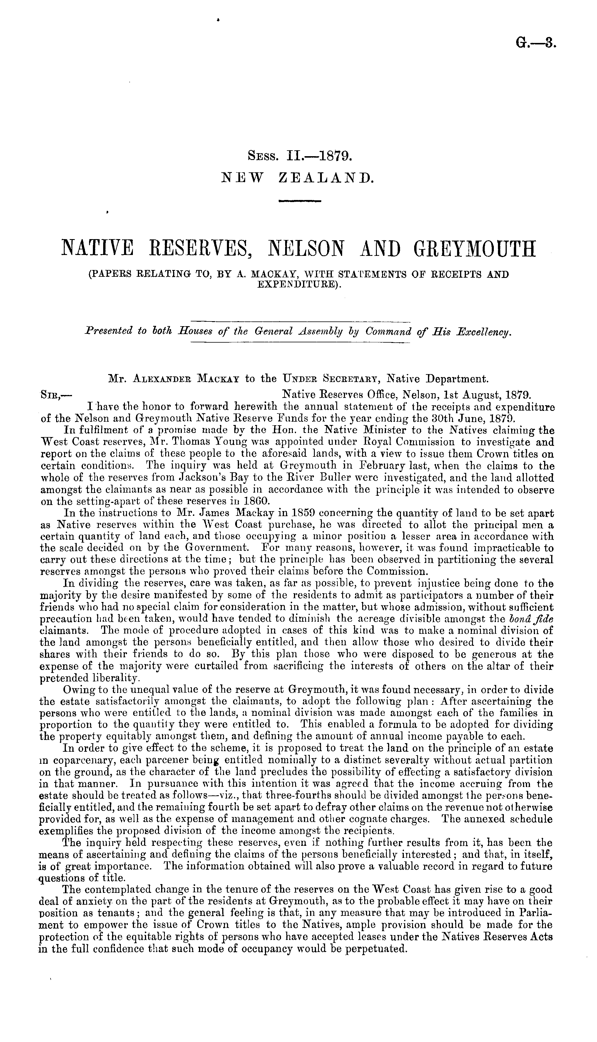 NATIVE RESERVES, NELSON AND GREYMOUTH (PAPERS RELATING TO, BY A. MACKAY, WITH STATEMENTS OF RECEIPTS AND EXPENDITURE).