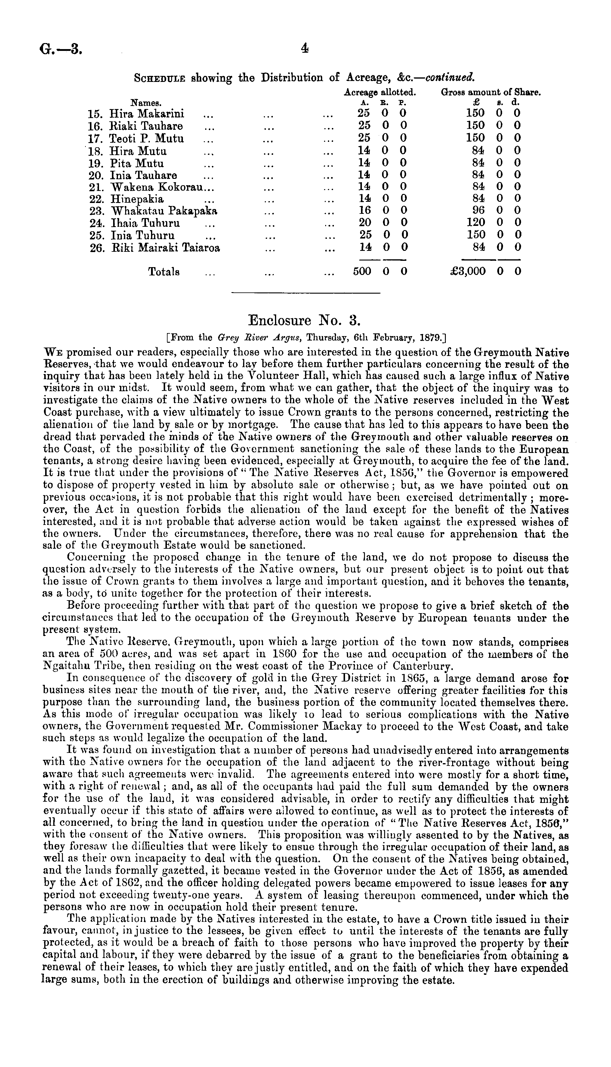 Enclosure No. 3. [From the Grey River Argus, Thursday, 6th February, 1879.] We promised our readers, especially those who are interested in the question of the Greyniouth Native "Reserves, that we would endeavour to lay before them further particulars concerning the result of the inquiry that has been lately held in the Volunteer Hall, which has caused such a large influx of Native visitors in our midst. It would seem, from what we can gather, that the object of the inquiry was to investigate the claims of the Native owners to the whole of the Native reserves included in the West Coast purchase, with a view ultimately to issue Crown grants to the persons concerned, restricting the alienation of the land by sale or by mortgage. The cause that has led to this appears to have been the dread that pervaded the minds of the Native owners of the Greymouth and other valuable reserves on the Coast, of the possibility of the Government sanctioning the sale of these lands to the European tenants, a strong desire having been evidenced, especially at Greymouth, to acquire the fee of the land. It is true that under the provisions of " The Native Reserves Act, 1856," the Governor is empowered to dispose of property vested in him by absolute sale or otherwise ; but, as we have pointed out on previous occasions, it is not probable that this right would have been exercised detrimentally ; moreover, the Act in question forbids the alienation of the laud except for the benefit of the Natives interested, and it is not probable that adverse action would be taken against the expressed wishes of the owners. Under the circumstances, therefore, there was no real cause for apprehension that the sale of the Greymouth Estate would be sanctioned. Concerning the proposed change in the tenure of the land, we do not propose to discuss the question adversely to the interests of the Native owners, but our present object is to point out that the issue of Crown grants to them involves a large and important question, and it behoves the tenants, as a body, to unite together for the protection of their interests. Before proceeding further with that part of the question we propose to give a brief sketch of the circumstances that led to the occupation of the Greymouth Reserve by European tenants under the present system. The Native Reserve, Greymouth, upon which a large portion of the town now stands, comprises an area of 500 acres, and was set apart in IS6O for the use and occupation of the members of the Ngaitahu Tribe, then residing on the west coast of the Province of Canterbury. In consequence of the discovery of gold in the Grey District in 1565, a large demand arose for business sites near the mouth of the river, and, the Native reserve offering greater facilities for this purpose than the surrounding land, the business portion of the community located themselves there. As this mode of irregular occupation was likely to lead to serious complications with the Native owners, the Government requested Mr. Commissioner Mackay to proceed to the West Coast, and take such steps as would legalize the occupation of the land. It was found on investigation that a number of persons had unadvisedly entered into arrangements with the Native owners for the occupation of the land adjacent to the river-frontage without being aware that such agreements were invalid. The agreements entered into were mostly for a short time, with a right of renewal; and, as all of the occupants had paid the full sum demanded by the owners for (he use of the laud, it was considered advisable, in order to rectify any difficulties that might eventually occur if this state of affairs were allowed to continue, as well as to protect the interests of all concerned, to bring the land in question under the operation of "The Native Reserves Act, 1858," with the consent of the Native owners. This proposition was willingly assented to by the Natives, as they foresaw the difficulties that were likely to ensue through the irregular occupation of their land, as well as their own incapacity to deal with the question. On the consent of the Natives being obtained, and the lands formally gazetted, it became vested in the Governor under the Act of 1850, as amended by the Act of 18G2, and the officer holding delegated powers became empowered to issue leases for any period not exceeding twenty-one years. A system of leasing thereupon commenced, under which the persons who are now in occupation hold their present tenure. The application made by the Natives interested in the estate, to have a Crown title issued in their favour, cannot, injustice to the lessees, be given effect to until the interests of the tenants are fully protected, as it would be a breach of faith to those persons who have improved the property by their capital and labour, if they were debarred by the issue of a grant to the beneficiaries from obtaining a renewal of their leases, to which they are justly entitled, and on the faith of which they have expended large sums, both in the erection of buildings and otherwise improving the estate.