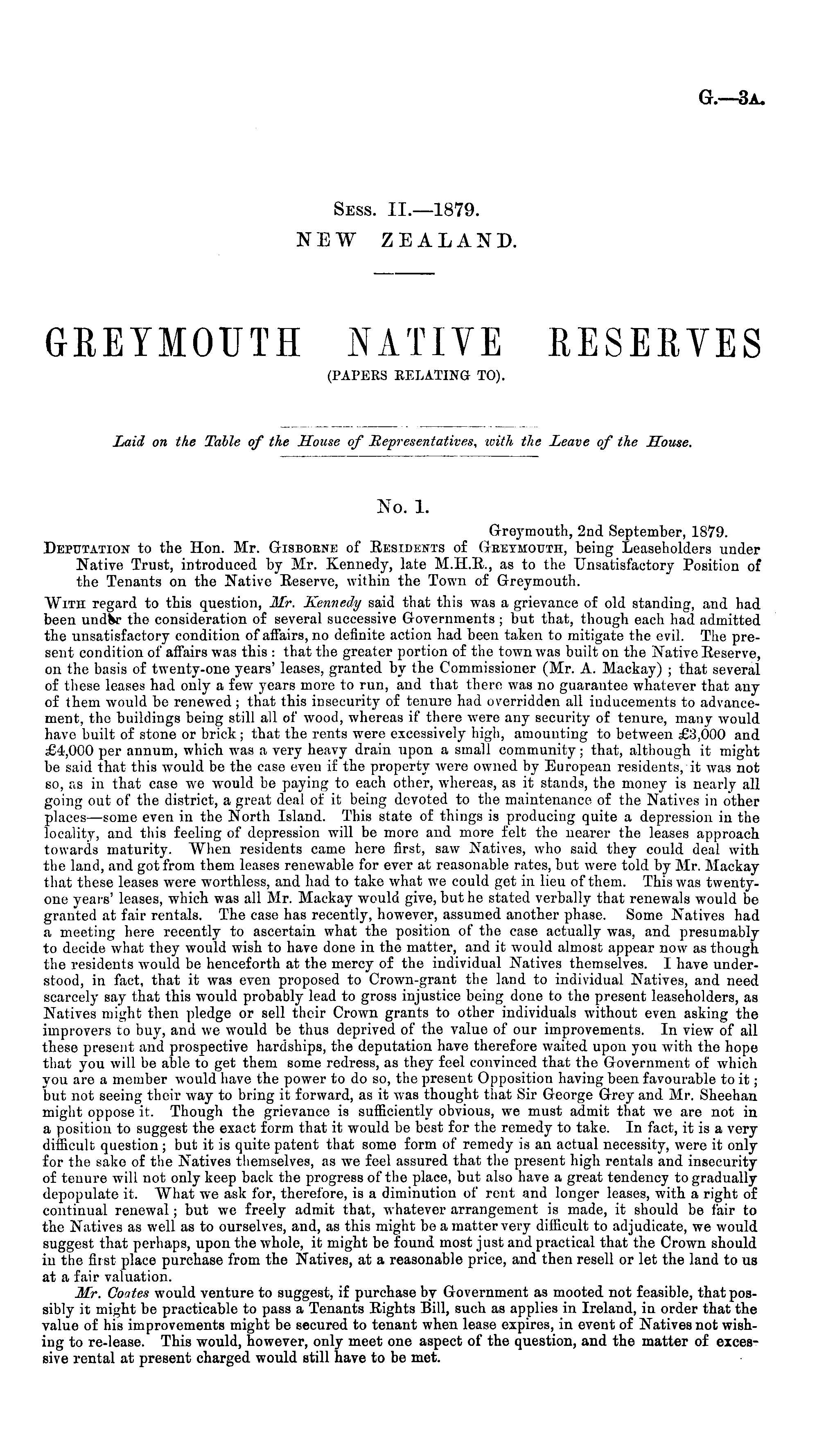 No. 1. G-reymouth, 2nd September, 1879. Deputation to the Hon. Mr. G-isboene of Residents of (teetmouth, being Leaseholders under Native Trust, introduced by Mr. Kennedy, late M.H.E., as to the Unsatisfactory Position of the Tenants on the Native Reserve, within the Town of Greymouth. With regard to this question, Mr. Kennedy said that this was a grievance of old standing, and had been undbr the consideration of several successive Governments ; but that, though each had admitted the unsatisfactory condition of affairs, no definite action had been taken to mitigate the evil. The present condition of affairs was this : that the greater portion of the town was built on the Native Reserve, on the basis of twenty-one years' leases, granted by the Commissioner (Mr. A. Mackay) ; that several of these leases had only a few years more to run, and that there was no guarantee whatever that any of them would be renewed ; that this insecurity of tenure had overridden all inducements to advancement, the buildings being still all of wood, whereas if there were any security of tenure, many would have built of stone or brick; that the rents were excessively high, amounting to between £3,000 and £4,000 per annum, which was a very heavy drain upon a small community; that, although it might be said that this would be the case even if the property were owned by European residents, it was not so, as in that case we would be paying to each other, whereas, as it stands, the money is nearly all going out of the district, a great deal of it being devoted to the maintenance of the Natives in other places—some even in the North Island. This state of things is producing quite a depression in the locality, and this feeling of depression will be more and more felt the nearer the leases approach towards maturity. When residents came here first, saw Natives, who said they could deal with the land, and got from them leases renewable for ever at reasonable rates, but were told by Mr. Mackay that these leases were worthless, and had to take what we could get in lieu of them. This was twentyone vears' leases, which was all Mr. Mackay would give, but he stated verbally that renewals would be granted at fair rentals. The case has recently, however, assumed another phase. Some Natives had a. meeting here recently to ascertain what the position of the case actually was, and presumably to decide what they would wish to have done in the matter, and it would almost appear now as though, the residents would be henceforth at the mercy of the individual Natives themselves. I have understood, in fact, that it was even proposed to Crown-grant the land to individual Natives, and need scarcely say that this would probably lead to gross injustice being done to the present leaseholders, as Natives might then pledge or sell their Crown grants to other individuals without even asking the improvers to buy, and we would be thus deprived of the value of our improvements. In view of all these present and prospective hardships, the deputation have therefore waited upon you with the hope that you will be able to get them some redress, as they feel convinced that the Government of which you are a member would have the power to do so, the present Opposition having been favourable to it; but not seeing their way to bring it forward, as it was thought that Sir George Grey and Mr. Sheehan might oppose it. Though the grievance is sufficiently obvious, we must admit that we are not in a position to suggest the exact form that it would be best for the remedy to take. In fact, it is a very difficult question ; but it is quite patent that some form of remedy is an actual necessity, were it only for the sake of the Natives themselves, as we feel assured that the present high rentals and insecurity of tenure will not only keep back the progress of the place, but also have a great tendency to gradually depopulate it. What we ask for, therefore, is a diminution of rent and longer leases, with a right of continual renewal; but we freely admit that, whatever arrangement is made, it should be fair to the Natives as well as to ourselves, and, as this might be a matter very difficult to adjudicate, we would suggest that perhaps, upon the whole, it might be found most just and practical that the Crown should in the first place purchase from the Natives, at a reasonable price, and then resell or let the land to us at a fair valuation. Mr. Coates would venture to suggest, if purchase by Government as mooted not feasible, that possibly it might be practicable to pass a Tenants Rights Bill, such as applies in Ireland, in order that the value of his improvements might be secured to tenant when lease expires, in event of Natives not wishing to re-lease. This would, however, only meet one aspect of the question, and the matter of excessive rental at present charged would still have to be met.