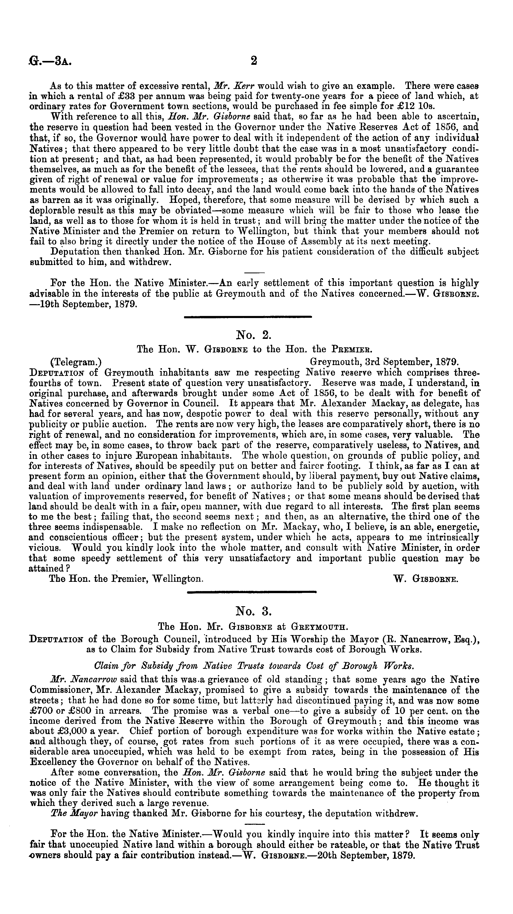 No. 2. The Hon. W. Gisboene to the Hon. the Peemiee. (Telegram.) Greymouth, 3rd September, 1879. Deputation of Greymouth inhabitants saw me respecting Native reserve which comprises threefourths of town. Present state of question very unsatisfactory. Reserve was made, I understand, in original purchase, and afterwards brought under some Act of 1856, to be dealt with for benefit of Natives concerned by Governor in Council. It appears that Mr. Alexander Mackay, as delegate, has had for several years, and has now, despotic power to deal with this reserve personally, without any publicity or public auction. The rents are now very high, the leases are comparatively short, there is no right of renewal, and no consideration for improvements, which are, in some cases, very valuable. The effect may be, in some cases, to throw back part of the reserve, comparatively useless, to Natives, and in other cases to injure European inhabitants. The whole question, on grounds of public policy, and for interests of Natives, should be speedily put on better and fairer footing. I think, as far as I can at present form an opinion, either that the Government should, by liberal payment, buy out Native claims, and deal with land under ordinary land laws ; or authorize land to be publicly sold by auction, with valuation of improvements reserved, for benefit of Natives ; or that some means should be devised that land should be dealt with in a fair, open manner, with due regard to all interests. The first plan seems to me the best; failing that, the second seems next; and then, as an alternative, the third one of the three seems indispensable. I make no reflection on Mr. Mackay, who, I believe, is an able, energetic, and conscientious officer; but the present system, under which he acts, appears to me intrinsically vicious. Would you kindly look into the whole matter, and consult with Native Minister, in order that some speedy settlement of this very unsatisfactory and important public question may be attained ? The Hon. the Premier, Wellington. W. Gisboene.