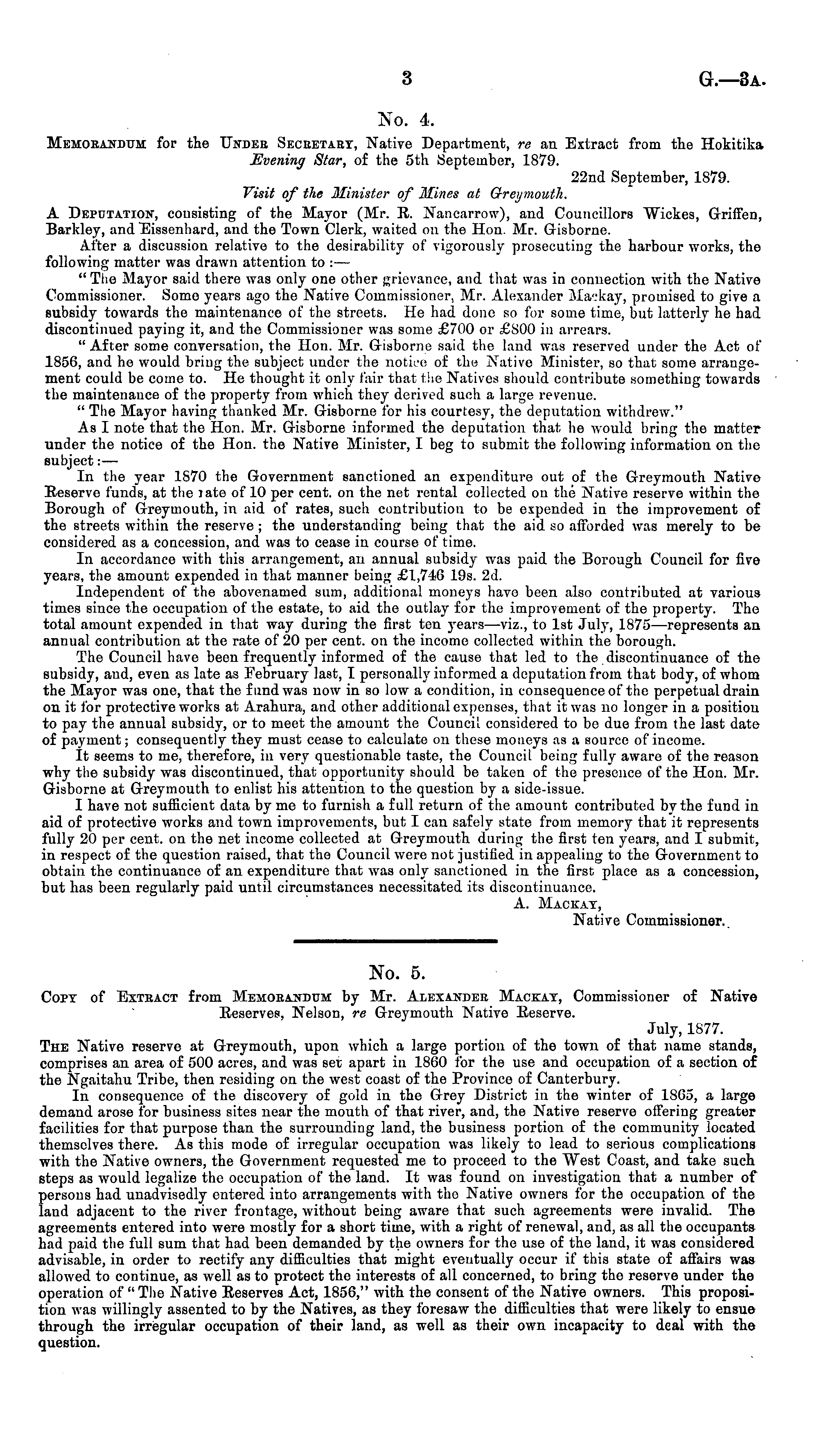 No. 5. Copt of Extract from Memorandum by Mr. Alexander Mackat, Commissioner of Native Reserves, Nelson, re Greymouth Native Reserve. July, 1877. Tiie Native reserve at Greymouth, upon which a large portion of the town of that name stands, comprises an area of 500 acres, and was ser apart in 1860 for the use and occupation of a section of the Ngaitahu Tribe, then residing on the west coast of the Province of Canterbury. In consequence of the discovery of gold in the Grey District in the winter of 18G5, a large demand arose for business sites near the mouth of that river, and, the Native reserve offering greater facilities for that purpose than the surrounding land, the business portion of the community located themselves there. As this mode of irregular occupation was likely to lead to serious complications with the Native owners, the Government requested me to proceed to the West Coast, and take such steps as would legalize the occupation of the land. It was found on investigation that a number of persons had unadvisedly entered into arrangements with the Native owners for the occupation of the land adjacent to the river frontage, without being aware that such agreements were invalid. The agreements entered into were mostly for a short time, with a right of renewal, and, as all the occupants bad paid the full sum that had been demanded by the owners for the use of the land, it was considered advisable, in order to rectify any difficulties that might eventually occur if this state of affairs was allowed to continue, as well as to protect the interests of all concerned, to bring the reserve under the operation of "The Native Reserves Act, 1856," with the consent of the Native owners. This proposition was willingly assented to by the Natives, as they foresaw the difficulties that were likely to ensue through the irregular occupation of their land, as well as their own incapacity to deal with the question.