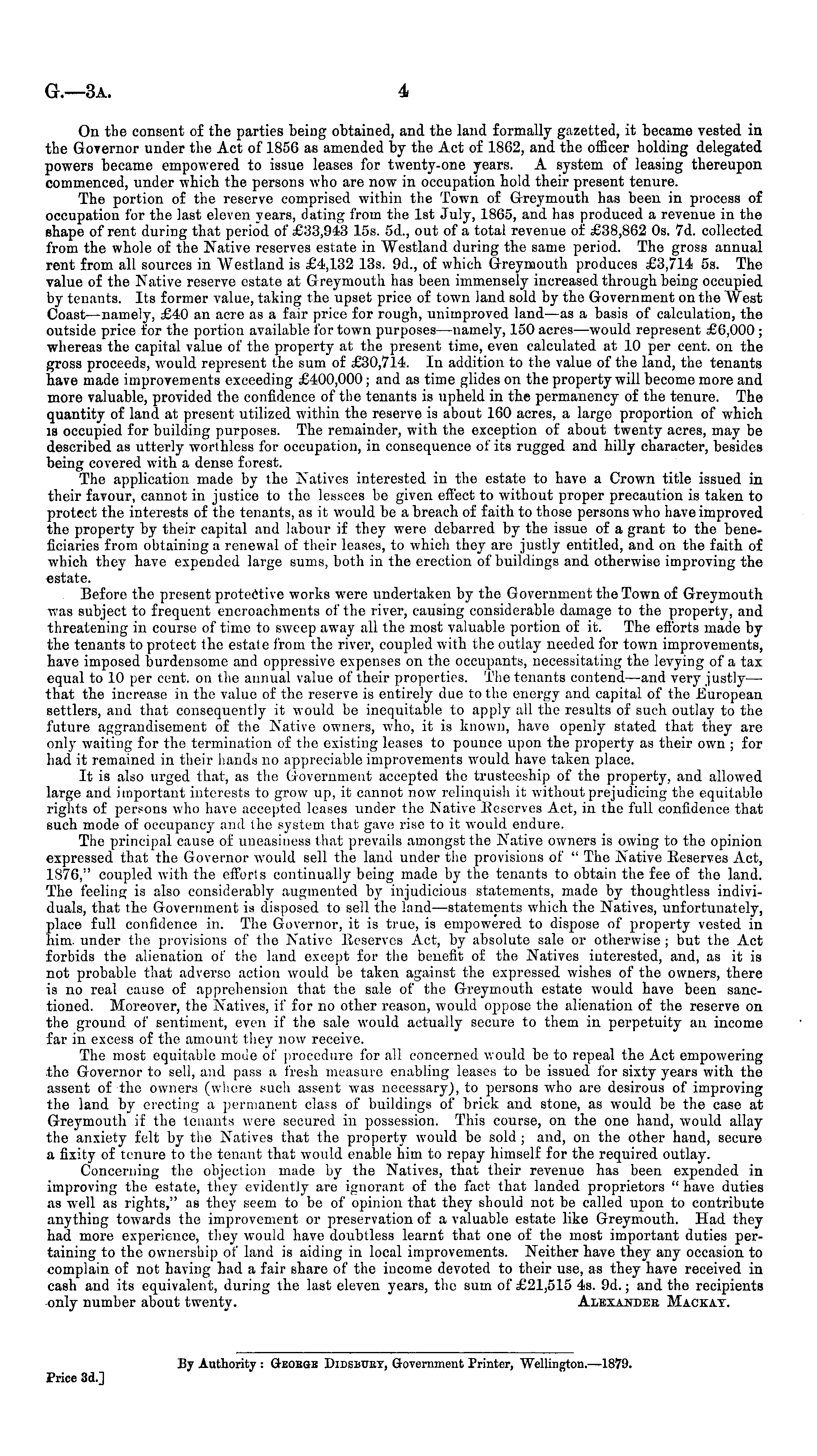 On the consent of the parties being obtained, and the land formally gazetted, it became vested in the Governor under the Act of 1856 as amended by the Act of 1862, and the officer holding delegated powers became empowered to issue leases for twenty-one years. A system of leasing thereupon commenced, under which the persons who are now in occupation hold their present tenure. The portion of the reserve comprised within the Town of Greymouth has been in process of occupation for the last eleven vears, dating from the Ist July, 1865, and has produced a revenue in the shape of rent during that period of £33,943 15s. 5d., out of a total revenue of £38,862 Os. 7d. collected from the whole of the Native reserves estate in Westland during the same period. The gross annual rent from all sources in "Westland is £4,132 13s. 9d., of which Greymouth produces £3,714 ss. The value of the Native reserve estate at Greymouth has been immensely increased through being occupied by tenants. Its former value, taking the upset price, of town land sold by the Government on the West Coast—namely, £40 an acre as a fair price for rough, unimproved land —as a basis of calculation, the outside price for the portion available for town purposes —namely, 150 acres —would represent £6,000 ; whereas the capital value of the property at the present time, even calculated at 10 per cent, on the gross proceeds, would represent the sum of £30,714. In addition to the value of the land, the tenants nave made improvements exceeding £400,000; and as time glides on the property will become more and more valuable, provided the confidence of the tenants is upheld in the permanency of the tenure. The quantity of land at present utilized within the reserve is about 160 acres, a large proportion of which is occupied for building purposes. The remainder, with the exception of about twenty acres, may be described as utterly worthless for occupation, in consequence of its rugged and hilly character, besides being covered with a dense forest. The application made by the Natives interested in the estate to have a Crown title issued in their favour, cannot in justice to the lessees be given effect to without proper precaution is taken to protect the interests of the tenants, as it would be a breach of faith to those persons who have improved the property by their capital and labour if they were debarred by the issue of a grant to the beneficiaries from obtaining a renewal of their leases, to which they are justly entitled, and on the faith of which thev have expended large sums, both in the erection of buildings and otherwise improving the estate. Before the present protective works were undertaken by the Government the Town of Greymouth was subject to frequent encroachments of the river, causing considerable damage to the property, and threatening in course of time to sweep away all the most valuable portion of it. The efforts made by the tenants to protect the estate from the river, coupled with the outlay needed for town improvements, have imposed burdensome and oppressive expenses on the occupants, necessitating the levying of a tax equal to 10 per cent, on the annual value of their properties. The tenants contend—and very justly — that the increase in the value of the reserve is entirely due to the energy and capital of the European settlers, and that consequently it would be inequitable to apply all the results of such outlay to the future aggrandisement of the Native owners, who, it is known, have openly stated that they are only waiting for the termination of the existing leases to pounce upon the property as their own ; for had it remained in their hands no appreciable improvements would have taken place. It is also urged that, as the Government accepted the trusteeship of the property, and allowed large and important interests to grow up, it cannot now relinquish it without prejudicing the equitable rights of persons who have accepted leases under the Native Eeserves Act, in the full confidence that such mode of occupancy and the system that gave rise to it would endure. The principal cause of uneasiness that prevails amongst the Native owners is owing to the opinion expressed that the Governor would sell the land under the provisions of " The Native Reserves Act, 1576," coupled with the efforts continually being made by the tenants to obtain the fee of the land. The feeling is also considerably augmented by injudicious statements, made by thoughtless individuals, that the Government is disposed to sell the land —statements which, the Natives, unfortunately, place full confidence in. The Governor, it is true, is empowered to dispose of property vested in him under the provisions of the Native Reserves Act, by absolute sale or otherwise ; but the Act forbids the alienation of the land except for the benefit of the Natives interested, and, as it is not probable that adverse action would be taken against the expressed wishes of the owners, there is no real cause of apprehension that the sale of the Greymouth estate would have been sanctioned. Moreover, the Natives, if for no other reason, would oppose the alienation of the reserve on the ground of sentiment, even if the sale would actually secure to them in perpetuity an income far in excess of the amount they now receive. The most equitable moiie of procedure for all concerned would be to repeal the Act empowering the Governor to sell, and pass a fresh measure enabling leases to be issued for sixty years with the assent of the owners (where such assent was necessary), to persons who are desirous of improving the land by erecting a permanent class of buildings of brick and stone, as would be the case at Greymouth if the tenants were secured in possession. This course, on the one hand, would allay the anxiety felt by the Natives that the property would be sold ; and, on the other hand, secure a fixity of tenure to the tenant that would enable him to repay himself 