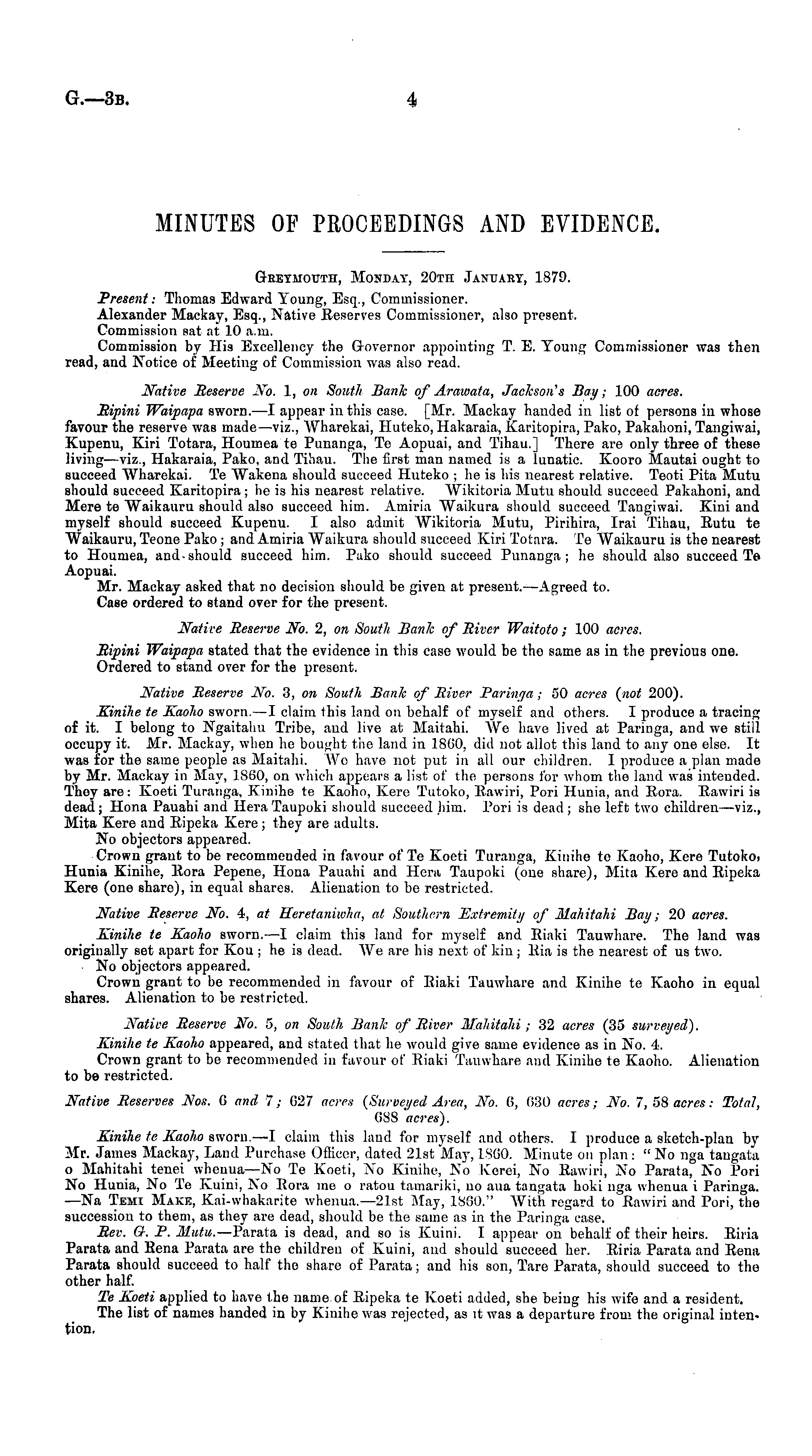 Greymouth, Monday, 20Tn January, 1879. Present: Thomas Edward Young, Esq., Commissioner. Alexander Mackay, Esq., Native Reserves Commissioner, also present. Commission sat at 10 a.m. Commission by His Excellency the Governor appointing T. E. Young Commissioner was then read, and Notice of Meeting of Commission was also read. Native Reserve No. 1, on South Bank of Arawata, Jackson's Bay; 100 acres. Ripini Waipapa sworn. —I appear in this case. [Mr. Mackay handed in list of persons in whose favour the reserve was made —viz., Wharckai, Huteko, Hakaraia, Karitopira, Pako, Pakahoni.Tangiwai, Kupenu, Kiri Totara, Houmea te Punanga, Te Aopuai, and Tihau.] There are only three of these living—viz., Hakaraia, Pako, and Tihau. The first man named is a lunatic. Kooro Mautai ought to succeed Wharekai. Te Wakena should succeed Huteko ;he is his nearest relative. Teoti Pita Mutu should succeed Karitopira ;he is his nearest relative. Wikitoria Mutu should succeed Pakahoni, and Mere te Waikauru should also succeed him. Amiria Waikura should succeed Tangiwai. Kini and myself should succeed Kupenu. I also admit Wikitoria Mutu, Pirihira, Irai Tihau, Rutu te Waikauru, Teone Pako ; and Amiria AVaikura should succeed Kiri Totara. Te Waikauru is the nearest to Houmea, and should succeed him. Pako should succeed Punanga; he should also succeed Te Aopuai. Mr. Mackay asked that no decision should be given at present.—Agreed to. Case ordered to stand over for the present. Native Reserve No. 2, on South Bank of River Waitoto; 100 acres. Ripini Waipapa stated that the evidence in this case would be the same as in the previous one. Ordered to stand over for the present. Native Reserve No. 3, on South Bank of River Paringa; 50 acres (not 200). Kinihe te Kaoho sworn. —I claim this land on behalf of myself and others. I produce a tracing of it. I belong to Ngaitahu Tribe, aud live at Maitahi. AYe have lived at Paringa, and we still occupy it. Mr. Mackay, when he bought the land in 1860, did not allot this land to any one else. It was for the same people as Maitahi. Wo have not put in all our children. I produce a plan made by Mr. Mackay in May, IS6O, on which appears a list of the persons for whom the land was intended. They are: Koeti Turanga, Kinihe to Kaoho, Kere Tutoko, Rawiri, Pori Hunia, and Rora. Rawiri is dead; Hona Pauahi and Hera Taupoki should succeed him. Pori is dead; she left two children —viz., Mita Kere and Ripeka Kere; they are adults. No objectors appeared. Crown grant to be recommended in favour of Te Koeti Turanga, Kinihe to Kaoho, Kero Tutoko, Hunia Kinibe, Rora Pepene, Hona Pauahi and Hera Taupoki (one share), Mita Kere and Ripeka Kere (one share), in equal shares. Alienation to be restricted. Native Reserve No. 4, at Heretaniwha, at Southern Extremity of Mahitahi Bay; 20 acres. Kinihe te Kaoho sworn.—l claim this land for myself and Riaki Tauwhare. The land was originally sot apart for Kou ;he is dead. AYe are his next of kin ; Ria is the nearest of us two. No objectors appeared. Crown grant to be recommended in favour of Riaki Tauwhare and Kinihe te Kaoho in equal shares. Alienation to be restricted. Native Reserve No. 5, on South Bank of River Mahitahi; 32 acres (35 surveyed). Kinihe te Kaoho appeared, and stated that he would give same evidence as in No. 4. Crown grant to be recommended in favour of Riaki Tauwhare and Kinihe te Kaoho. Alienation to be restricted. Native Reserves Nos. 6 and 7; 627 acres (Surveyed Area, No. 6, 630 acres; No. 7, 58 acres: Total, 688 acres). Kinihe te Kaoho sworn.—l claim this land for myself and others. I produce a sketch-plan by Mr. James Mackay, Land Purchase Officer, dated 21st May, 1860. Minute on plan :" No nga tangata o Mahitahi tenei wheuua—No Te Koeti, No Kinihe, No Kerei, No Rawiri, No Parata, No Pori No Hunia, No Te Kuini, No Rora me o ratou tamariki, no aua tangata hoki nga whenua i Paringa. —Na Temi Make, Kai-whakarite whenua. —21st May, 1860." AVith regard to Rawiri and Pori, the succession to them, as they are dead, should be the same as in the Paringa case. Rev. G. P. Mutu. —Parata is dead, and so is Kuini. I appear on behalf of their heirs. Riria Parata and Rena Parata are the children of Kuini, and should succeed her. Riria Parata and Rena Parata should succeed to half the share of Parata; and his son, Tare Parata, should succeed to the other half. Te Koeti applied to have the name of Ripeka te Koeti added, she being his wife and a resident. The list of names handed in by Kinihe was rejected, as it was a departure from the original intention,