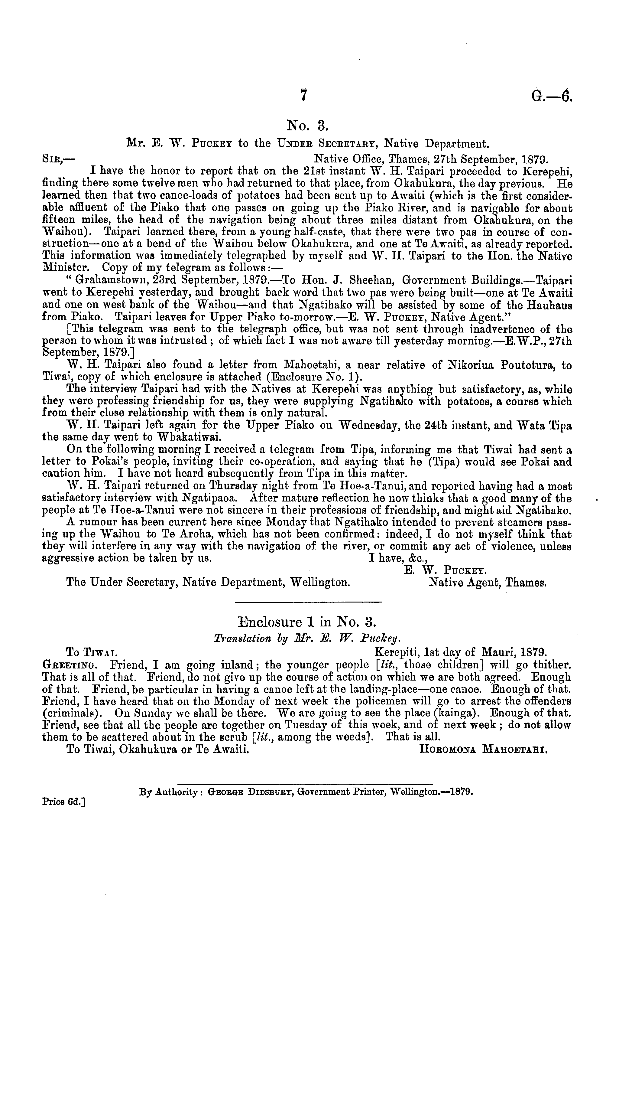 No. 3. Mr. E. W. Puckey to the Under Secretary, Native Department. Sir, — Native Office, Thames, 27th September, 1879. I have the honor to report that on the 21st instant AY. H. Taipari proceeded to Kerepehi, finding there some twelve men who had returned to that place, from Okahukura, the day previous. He learned then that two canoe-loads of potatoes had been sent up to Awaiti (which is the first considerable affluent of the Piako that one passes on going up the Piako River, and is navigable for about fifteen miles, the head of the navigation being about three miles distant from Okahukura, on the Waihou). Taipari learned there, from a young half-caste, that there were two pas in course of construction—one at a bend of the Waihou below Okahukura, and ono at Te Awaiti, as already reported. This information was immediately telegraphed by myself and W. H. Taipari to the Hon. the Native Minister. Copy of my telegram as follows :— " Grahamstown, 23rd September, 1879. —To Hon. J. Sheehan, Government Buildings.—Taipari went to Kerepehi yesterday, and brought back word that two pas were being built —one at Te Awaiti and one on west bank of the Waihou —and that Ngatihako will be assisted by some of the Hauhaus from Piako. Taipari leaves for Upper Piako to-morrow. —E. W. Puckey, Native Agent." [This telegram was sent to the telegraph office, but was not sent through inadvertence of the person to whom it was intrusted ; of which fact I was not aware till yesterday morning.—E.W.P., 27th September, 1879.] W. 11. Taipari also found a letter from Mahoetahi, a near relative of Nikoriua Poutotura, to Tiwai, copy of which enclosure is attached (Enclosure No. 1). The interview Taipari had with the Natives at Kerepehi was anything but satisfactory, as, while they were professing friendship for us, they were supplying Ngatihako with potatoes, a course which from their close relationship with them is only natural. W. H. Taipari left again for the Upper Piako on Wednesday, the 24th instant, and Wata Tipa the same day went to Whakatiwai. On the following morning I received a telegram from Tipa, informing me that Tiwai had sent a letter to Pokai's people, inviting their co-operation, and saying that he (Tipa) would sec Pokai and caution him. I have not heard subsequently from Tipa in this matter. W. H. Taipari returned on Thursday night from To Hoe-a-Tanui, and reported having had a most satisfactory interview with Ngatipaoa. After mature reflection ho now thinks that a good many of the people at Te Hoe-a-Tanui were not sincere in their professions of friendship, and might aid Ngatihako. A rumour has been current here since Monday that Ngatihako intended to prevent steamers passing up the Waihou to Te Aroha, which has not been confirmed: indeed, I do not myself think that they will interfere iv any way with the navigation of the river, or commit any act of violence, unless aggressive action be taken by us. I have, &c, E. W. Puckey. The Under Secretary, Native Department, Wellington. Native Agent, Thames. Enclosure 1 in No. 3. Translation by Mr. E. W. Puckey. To Tiwat. Kerepiti, Ist day of Mauri, 1879. Greeting. Friend, I am going inland; the younger people [lit., those children] will go thither. That is all of tlrat. Friend, do not give up the course of action on which wo are both agreed. Enough of that. Friend, be particular iv having a canoe left at the landing-place—one canoe. Enough of that. Friend, I have heard that on the Monday of next week the policemen will go to arrest the offenders (criminals). On Sunday wo shall be there. We arc going to see the place (kainga). Enough of that. Friend, see that all the people are together on Tuesday of this week, and of next week ; do not allow them to be scattered about in the scrub [lit., among the weeds]. That is all. To Tiwai, Okahukura or Te Awaiti. Horomona Mauoetahi. By Authority : Oeobge Didsbuet, Government Printer, Wellington.—lB79. Brico 6d.]