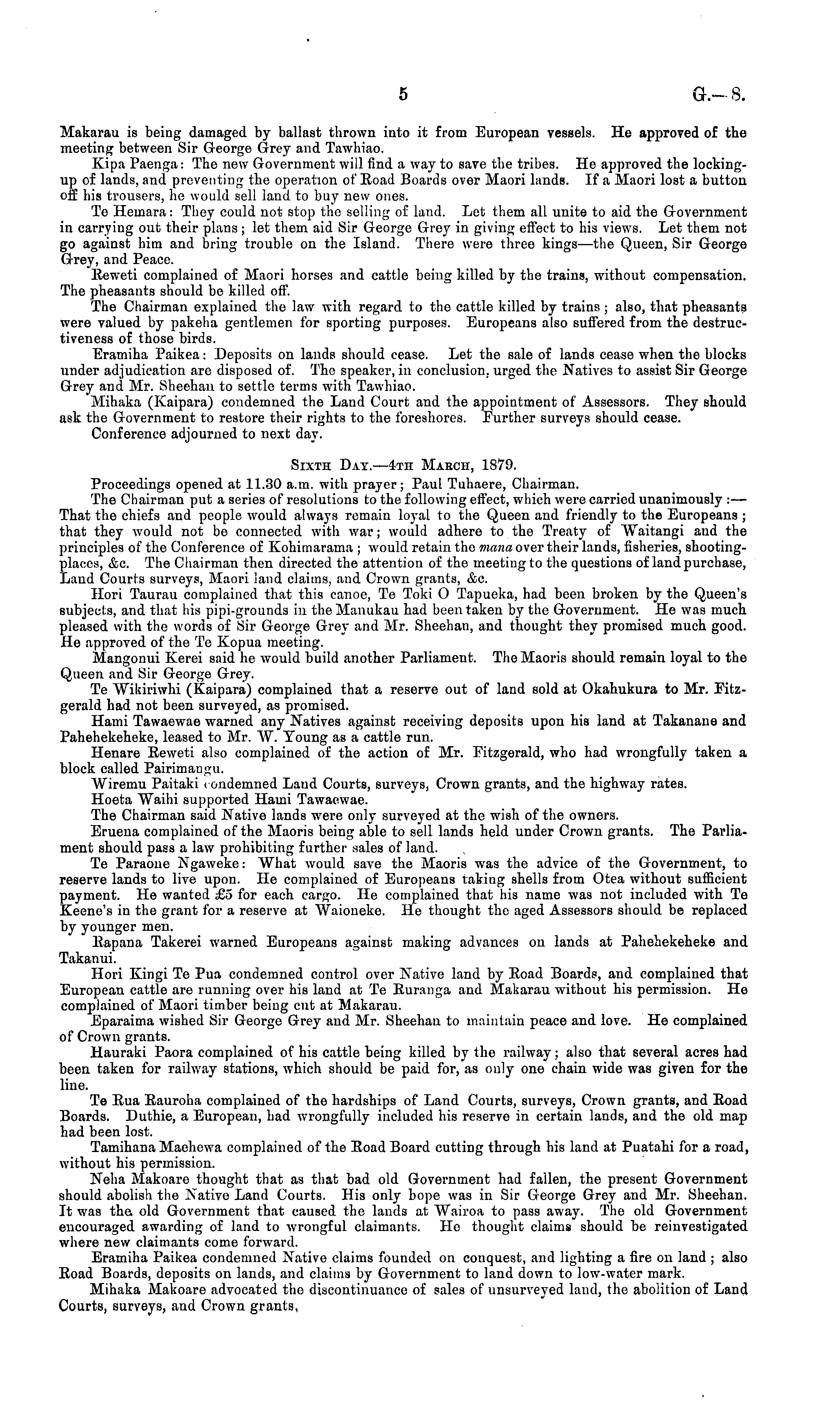 Makarau is being damaged by ballast thrown into it from European vessels. He approved of the meeting between Sir George Grey and Tawhiao. Kipa Paenga: The new Government will find a way to save the tribes. He approved the lockingup of lands, and preventing the operation of Eoad Boards over Maori lands. If a Maori lost a button off his trousers, he would sell land to buy new ones. Te Hemara: They could not stop tho selling of land. Lot them all unite to aid the Government in carrying out their plans ; let them aid Sir George Grey in giving effect to his views. Let them not go against him and bring trouble on the Island. There were three kings—the Queen, Sir George Grey, and Peace. Eewcti complained of Maori horses and cattle being killed by the trains, without compensation. The pheasants should be killed off. The Chairman explained the law with regard to the cattle killed by trains ; also, that pheasants were valued by pakeha gentlemen for sporting purposes. Europeans also suffered from the destructiveness of those birds. Eramiba Paikea: Deposits on lands should cease. Let the sale of lands cease when the blocks under adjudication are disposed of. The speaker, in conclusion, urged the Natives to assist Sir George Grey and Mr. Sheehan to settle terms with Tawhiao. Mihaka (Kaipara) condemned the Land Court and the appointment of Assessors. They should ask the Government to restore their rights to the foreshores. Further surveys should cease. Conference adjourned to next day. Sixth Day.—4th March, 1879. Proceedings opened at 11.30 a.m. with prayer; Paul Tuhaere, Chairman. The Chairman put a series of resolutions to the following effect, which were carried unanimously : — That the chiefs and people would always remain loyal to the Queen and friendly to the Europeans ; that they would not be connected with war; would adhere to the Treaty of Waitangi aud the principles of the Conference of Kohimarama ; would retain the mana over their lands, fisheries, shootingplaces, etc. The Cliairman then directed the attention of the meeting to the questions of land purchase, Laud Courts surveys, Maori land claims, and Crown grants, &c. Hori Taurau complained that this canoe, Te Toki O Tapueka, had been broken by the Queen's subjects, and that his pipi-grounds in the Manukau had been taken by the Government. He was much pleased with the words of Sir George Grey and Mr. Sheehan, and thought they promised much good. He approved of the Te Kopua meeting. Mangonui Kerei said he would build another Parliament. The Maoris should remain loyal to the Queen and Sir George Grey. Te Wikiriwhi (Kaipara) complained that a reserve out of land sold at Okahukura to Mr. Fitzgerald had not been surveyed, as promised. Hami Tawaewae warned any Natives against receiving deposits upon his land at Takanane and Pahehekeheke, leased to Mr. W. Young as a cattle run. Henare Eeweti also complained of the action of Mr. Fitzgerald, who had wrongfully taken a block called Pairimangu. Wiremu Paitaki i ondemned Land Courts, surveys, Crown grants, and the highway rates. Hoeta Waihi supported Hami Tawaewae. The Chairman said Native lands were only surveyed at the wish of the owners. Eruena complained of the Maoris being able to sell lands held under Crown grants. The Parliament should pass a law prohibiting further sales of land. Te Paraone Ngaweke: What would save the Maoris was the advice of the Government, to reserve lands to live upon. He complained of Europeans taking shells from Otea without sufficient payment. He wanted £5 for each cargo. He complained that his name was not included with Te Keene's in the grant for a reserve at Waioneke. He thought the aged Assessors should be replaced by younger men. Eapana Takerei warned Europeans against making advances on lands at Pahehekeheke and Takanui. Hori Kingi To Pua condemned control over Nativo land by Eoad Boards, and complained that European cattle are running over his land at Te Euranga and Makarau without his permission. He complained of Maori timber being cut at Makarau. Eparaima wished Sir George Grey and Mr. Sheehan to maintain peace and love. He complained of Crown grants. Hauraki Paora complained of his cattle being killed by the railway; also that several acres had been taken for railway stations, which should be paid for, as only one chain wide was given for the line. Te Eva Bauroha complained of the hardships of Laud Courts, surveys, Crown grants, and Eoad Boards. Duthie, a European, had wrongfully included his reserve in certain lands, and the old map had been lost. Tamihana Maehewa complained of the Eoad Board cutting through his land at Puatahi for a road, without his permission. Neha Makoare thought that as that bad old Government bad fallen, the present Government should abolish the Native Land Courts. His only hope was in Sir George Grey and Mr. Sheehan. It was tha old Government that caused the lands at Wairoa to pass away. The old Government encouraged awarding of land to wrongful claimants. He thought claims should be reinvestigated where new claimants come forward. Eramiha Paikea condemned Native claims founded on conquest, and lighting a fire on land ; also Eoad Boards, deposits on lands, and claims by Government to land down to low-water mark. Mihaka Makoare advocated the discontinuance of sales of unsurveyed laud, the abolition of Land Courts, surveys, and Crown grants,