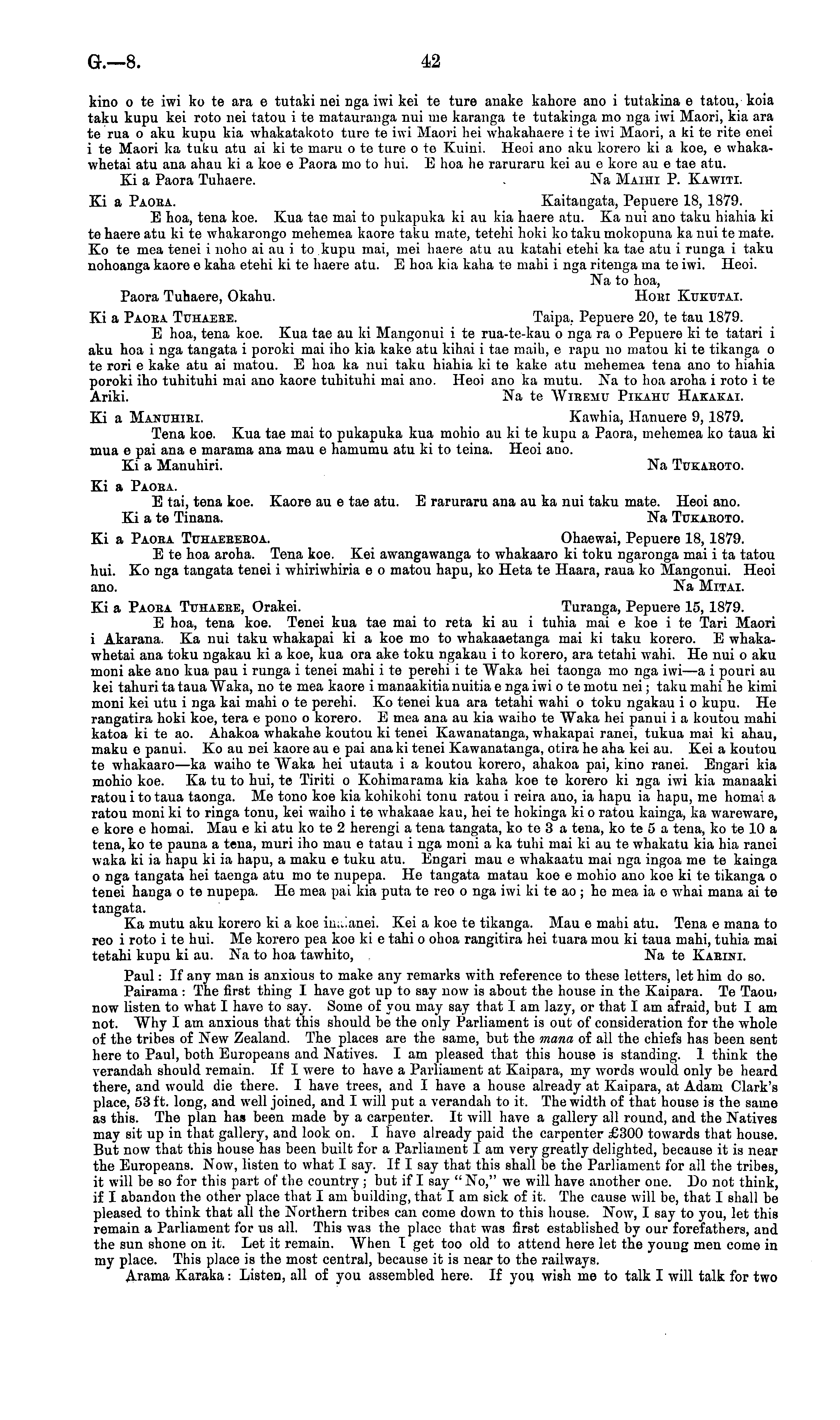 kino o te iwi ko te ara c tutaki nei nga iwi kei te ture anake kahore ano i tutakina c tatou, koia taku kupu kei roto nei tatou i te matauranga nui vie karanga te tutakinga mo nga iwi Maori, kia ara te rua o aku kupu kia whakatakoto ture te iwi Maori hei whakahaere ite iwi Maori, a kite rite enei ite Maori ka tuku atu ai kite maru ote ture ote Kuini. Heoi ano aku korero ki a koe, c whakawhetai atu ana ahau ki a koe c Paora mo to hui. E hoa he raruraru kei au c kore au c tae atu. Xi a Paora Tuhaere. - Na Maihi P. Kawiti. Xi a Paora. Kaitangata, Pepuere 18,1879. E hoa, tena koe. Kua tae mai to pukapuka ki au kia haere atu. Ka nui ano taku hiahia ki te haere atu kite whakarongo mehemea kaore taku mate, tetehi hoki ko taku mokopuna ka nui te mate. Ko te mea tenei i noho ai au i to kupu mai, mci haere atu au katahi etehi ka tae atu i runga i taku nohoanga kaore c kaha etehi kite haere atu. E hoa kia kaha te mahi i nga ritenga ma te iwi. Heoi. Na to hoa, Paora Tuhaere, Okahu. Hoitt Kukutai. Xi a Paora Tuhaere. Taipa. Pepuere 20, te tau 1879. E hoa, tena koe. Kua tae au ki Mangonui ite rua-te-kau o nga ra o Pepuere kite tatari i aku hoa i nga tangata i poroki mai iho kia kake atu kihai i tae maih, c rapu no matou kite tikanga o te rori c kake atu ai matou. E hoa ka nui taku hiahia kite kake atu mehemea tena ano to hiahia poroki iho tuhituhi mai ano kaore tuhituhi mai ano. Heoi ano ka mutu. Na to hoa aroha i roto ite Ariki. Na te AViremu Pikahu Hakaeai. Xi a Manuhiri. Kawhia, Hanuere 9, 1879. Tena koe. Kua tae mai to pukapuka kua mohio au kite kupu a Paora, mehemea ko taua ki mua c pai ana c marama ana mau c hamumu atu ki to teina. Heoi ano. Xi a Manuhiri. Na Tujcaroto. Xi a Paora. E tai, tena koe. Kaore au c tae atu. E raruraru ana au ka nui taku mate. Heoi ano. Xi a te Tinana. Na Tukaroto. Xi a Paora Tuhaereroa. Ohaewai, Pepuere 18, 1879. Etc hoa aroha. Tena koe. Kei awangawanga to whakaaro ki toku ngaronga mai ita tatou hui. Ko nga tangata tenei i whiriwhiria c o matou hapu, ko Heta te Haara, raua ko Mangonui. Heoi ano. Na Mitai. Xi a Paora Tuhaere, Orakei. Turanga, Pepuere 15, 1879. E hoa, tena koe. Tenei kua tae mai to reta ki au i tuhia mai c koe i te Tari Maori i Akarana. Ka nui taku whakapai ki a koe mo to whakaaetanga mai ki taku korero. E whakawhetai ana toku ngakau ki a koe, kua ora ake toku ngakau ito korero, ara tetahi wahi. He nui o aku moni ake ano kua pau i runga i tenei mahi ite perehi i te Waka hei taonga mo nga iwi—a i pouri au kei tahuri ta taua AVaka, no te mea kaore i manaakitia nuitia c nga iwi ote motu nei; taku mahi he kimi moni kei utu i nga kai mahi ote perehi. Ko tenei kua ara tetahi wahi o toku ngakau i o kupu. He rangatira hoki koe, tera c pono o korero. E mea ana au kia waiho te AVaka hei panui i a koutou mahi katoa kite ao. Ahakoa whakahe koutou ki tenei Kawanatanga, whakapai ranei, tukua mai ki ahau, maku c panui. Ko au nei kaore au c pai ana ki tenei Kawanatanga, otira he aha kei au. Kei a koutou te whakaaro —ka waiho te AVaka hei utauta i a koutou korero, ahakoa pai, kino ranei. Engari kia mohio koe. Ka tv to hui, te Tiriti o Kohimarama kia kaha koe te korero ki nga iwi kia manaaki ratou ito taua taonga. Me tono koe kia kohikohi tonu ratou i reira ano, ia hapu ia hapu, me homai a ratou moni ki to ringa tonu, kei waiho i te whakaae kau, hei te hokinga ki o ratou kainga, ka wareware, c kore c homai. Mau eki atu ko te 2 herengi a tena tangata, ko te 3 a tena, ko te 5 a tena, ko te 10 a tena, ko te pauna a tena, muri iho mau c tatau i nga moni a ka tuhi mai ki au te whakatu kia hia ranei waka ki ia hapu ki ia hapu, a maku c tuku atu. Engari mau c whakaatu mai nga ingoa me te kainga o nga tangata hei taenga atu mo te nupepa. He tangata matau koe c mohio ano koe kite tikanga o tenei hanga ote nupepa. He mea pai kia puta te reo o nga iwi kite ao ;he mea ia c whai mana ai te tangata. Ka mutu aku korero ki a koe im.ianei. Kei a koe te tikanga. Mau c mahi atu. Tena c mana to reo i roto ite hui. Me korero pea koe ki c tahi o ohoa rangitira hei tuara mou ki taua mahi, tuhia mai tetahi kupu ki au. Na to hoa tawhito, Na te Karini. Paul: If any man is anxious to make any remarks with reference to these letters, let him do so. Pairama : The first thing I have got up to say now is about the house in the Kaipara. Te Taou. now listen to what I have to say. Some of you may say that lam lazy, or that lam afraid, but lam not. Why lam anxious that this should be the only Parliament is out of consideration for the whole of the tribes of New Zealand. The places are the same, but the mana of all the chiefs has been sent here to Paul, both Europeans and Natives. I am pleased that this house is standing. 1 think the verandah should remain. If I were to have a Parliament at Kaipara, my words would only be heard there, and would die there. I have trees, and I have a house already at Kaipara, at Adam Clark's place, 53 ft. long, and well joined, and I will put a verandah to it. The width of that house is the same as this. The plan has been made by a carpenter. It will have a gallery all round, and the Natives may sit up in that gallery, and look on. I have already paid the carpenter £300 towards that house. But now that this house has been built for a Parliament I am very greatly delighted, because it is near the Europeans. Now, listen to what I say. If I say that this shall be the Parliament for all the tribes, it will be so for this part of the country ; but if I say " No," we will have another one. Do not think, if I abandon the other place that lam building, that lam sick of it. The cause will be, that I shall be pleased to think that all the Northern tribes can come down to this house. Now, I say to you, let this remain a Parliament for us all. This was the place that was first established by our forefathers, and the sun shone on it. Let it remain. AVhen I get too old to attend here let the youug men come in my place. This place is the most central, because it is near to the railway