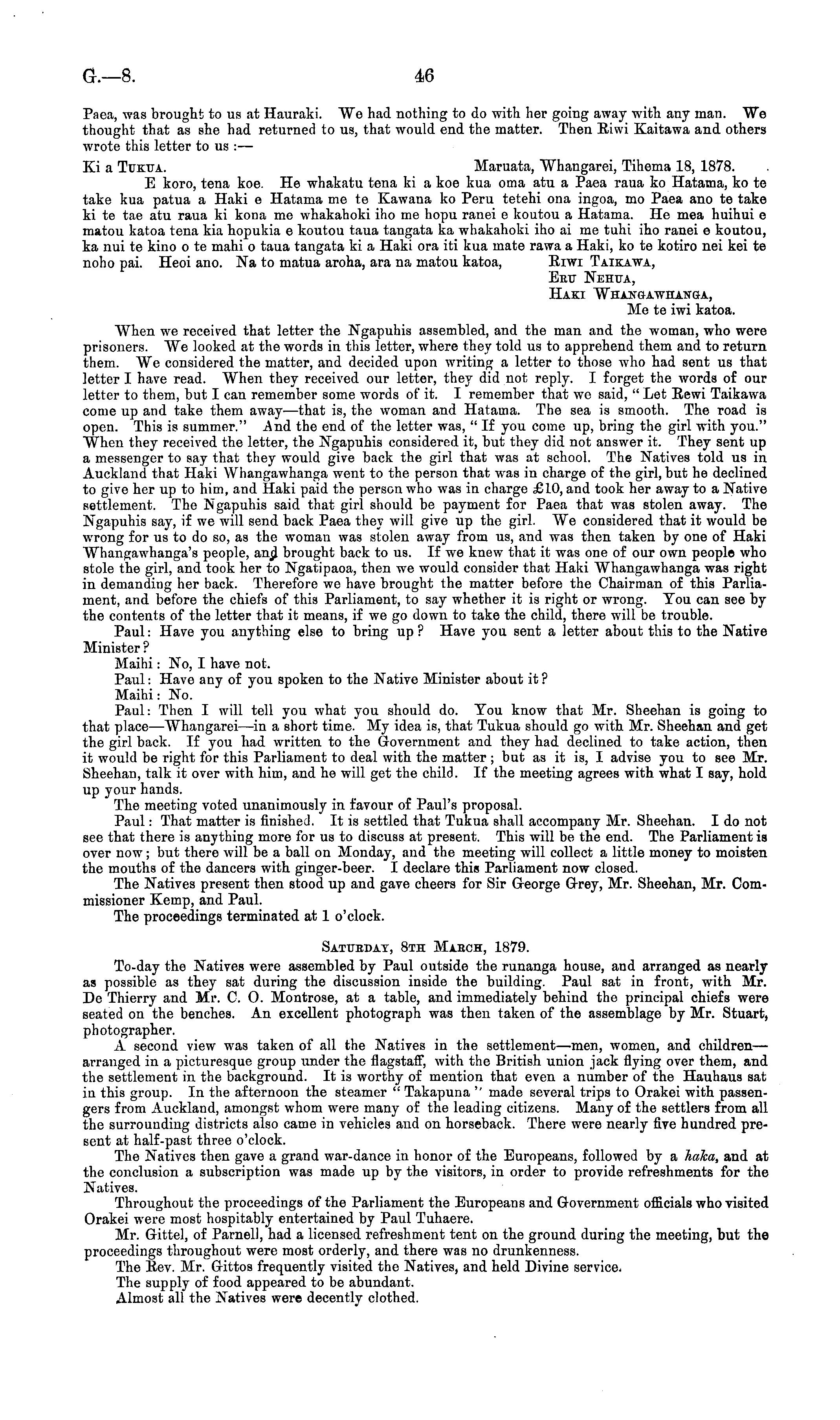 Paea, was brought to us at Hauraki. AVo had nothing to do with her going away with any man. Wo thought that as she had returned to us, that would end the matter. Then Eiw-i Kaitawa and others wrote this letter to us :— Xi a Tukua. Maruata, Whangarei, Tihema 18, 1878. E koro, tena koe. He whakatu tena ki a koe kua oma atu a Paea raua ko Hatama, ko te take kua patua a Haki c Hatama me te Kawana ko Peru tetehi ona ingoa, mo Paea ano te take kite tae atu raua ki kona me whakahoki iho me hopu ranei c koutou a Hatama. He mea huihui c matou katoa tena kia hopukia c koutou taua tangata ka whakahoki iho ai me tuhi iho ranei c koutou, ka nui te kino o te mahi o taua tangata ki a Haki ora iti kua mate rawa a Haki, ko te kotiro nei kei te noho pai. Heoi ano. Na to matua aroha, ara na matou katoa, Eiwi Taikawa, Eru Nehua, Haki Whangawhanga, Me te iwi katoa. When we received that letter the Ngapuhis assembled, and the man and the woman, who were prisoners. AYe looked at the words in this letter, where they told us to apprehend them and to return them. We considered the matter, and decided upon writing a letter to those who had sent us that letter I have read. When they received our letter, they did not reply. I forget the words of our letter to them, but I can remember some words of it. I remember that we said, " Let Eewi Taikawa come up and take them away—that is, the woman and Hatama. The sea is smooth. The road is open. This is summer." And the end of the letter was, "If you come up, bring the girl with you." When they received the letter, the Ngapuhis considered it, but they did not answer it. They sent up a messenger to say that they wrould give back the girl that was at school. The Natives told us in Auckland that Haki Whangawhanga went to the person that was in charge of the girl, but he declined to give her up to him, and Haki paid the person who was in charge £10, and took her away to a Nativo settlement. The Ngapuhis said that giri should be payment for Paea that was stolen away. The Ngapuhis say, if we will send back Paea they will give up the girl. AYe considered that it would be wrong for us to do so, as the woman was stolen away from us, and was then taken by one of Haki Whangawhanga's people, ans brought back to us. If we knew that it was one of our own people who stole the girl, and took her to Ngatipaoa, then we would consider that Haki Whangawhanga was right in demanding her back. Therefore we have brought the matter before the Chairman of this Parliament, and before the chiefs of this Parliament, to say whether it is right or wrong. You can see by the contents of the letter that it means, if we go down to take the child, there will be trouble. Paul: Have you anything else to bring up? Have you sent a letter about this to the Native Minister ? Maihi: No, I have not. Paul: Have any of you spoken to the Native Minister about it? Maihi: No. Paul: Then I will tell you what you should do. You know that Mr. Sheehan is going to that place —AVhangarei —in a short time. My idea is, that Tukua should go with Mr. Sheehan and get the girl back. If you had written to the Government and they had declined to take action, then it would be right for this Parliament to deal with the matter ; but as it is, I advise you to see Mr. Sheehan, talk it over with him, and he will get the child. If the meeting agrees with what I say, hold up your hands. The meeting voted unanimously in favour of Paul's proposal. Paul: That matter is finished. It is settled that Tukua shall accompany Mr. Sheehan. Ido not see that there is anything more for us to discuss at present. This will be the end. The Parliament is over now; but there will be a ball on Monday, and the meeting will collect a little money to moisten the mouths of the dancers with ginger-beer. I declare this Parliament now closed. The Natives present then stood up and gave cheers for Sir George Grey, Mr. Sheehan, Mr. Commissioner Kemp, and Paul. The proceedings terminated at 1 o'clock. Saturday, Bth March, 1879. To-day the Natives were assembled by Paul outside the runanga house, and arranged as nearly as possible as they sat during the discussion inside the building. Paul sat in front, with Mr. De Thierry and Mr. C. 0. Montrose, at a table, and immediately behind the principal chiefs were seated on the benches. An excellent photograph was then taken of the assemblage by Mr. Stuart, photographer. A second view was taken of all the Natives in the settlement—men, women, and childrenarranged in a picturesque group under the flagstaff, with the British union jack flying over them, and the settlement in the background. It is worthy of mention that even a number of the Hauhaus sat in this group. In the afternoon the steamer " Takapuna " made several trips to Orakei with passengers from Auckland, amongst whom were many of the leading citizens. Many of the settlers from all the surrounding districts also came in vehicles and on horseback. There were nearly five hundred present at half-past three o'clock. The Natives then gave a grand war-dauce in honor of the Europeans, followed by a haka, and at the conclusion a subscription was made up by the visitors, in order to provide refreshments for the Natives. Throughout the proceedings of the Parliament the Europeans and Government officials who visited Orakei were most hospitahly entertained by Paul Tuhaere. Mr. Gittel, of Parnell, had a licensed refreshment tent on the ground during the meeting, but the proceedings throughout were most orderly, and there was no drunkenness. The Eev. Mr. Gittos frequently visited the Natives, and held Divine service. The supply of food appeared to be abundant. Almost all the Natives were decently clothed.