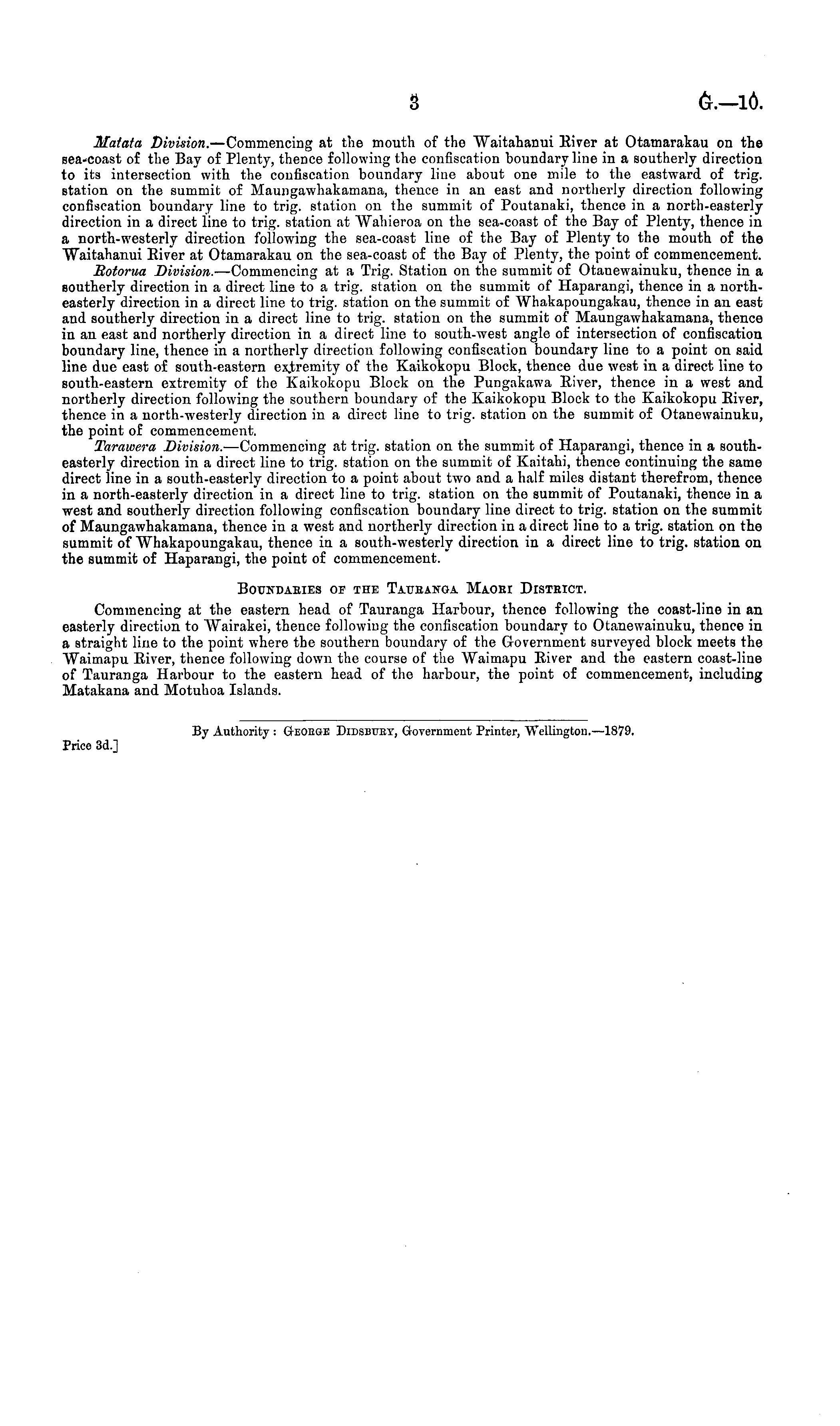 Matata Division. —Commencing at the mouth of the Waitahanui River at Otamarakau on the sea-coast of the Bay of Plenty, thence following the confiscation boundary line in a southerly direction to its intersection with the confiscation boundary line about one mile to the eastward of trig, station on the summit of Maungawhakamana, thence in an east and northerly direction following confiscation boundary line to trig, station on the summit of Poutanaki, thence in a north-easterly direction in a direct line to trig, station at Wahieroa on the sea-coast of the Bay of Plenty, thence in a north-westerly direction following the sea-coast line of the Bay of Plenty to the mouth of the Waitahanui River at Otamarakau on the sea-coast of the Bay of Plenty, the point of commencement. Botorua Division. —Commencing at a Trig. Station on the summit of Otanewainuku, thence in a southerly direction in a direct line to a trig, station on the summit of Haparangi, thence in a northeasterly direction in a direct line to trig, station on the summit of Whakapoungakau, thence in an east and southerly direction in a direct line to trig, station on the summit of Maungawhakamana, thence in an east and northerly direction in a direct line to south-west angle of intersection of confiscation boundary line, thence in a northerly direction following confiscation boundary line to a point on said line due east of south-eastern extremity of the Kaikokopu Block, thence due west in a direct line to south-eastern extremity of the Kaikokopu Block on the Pungakawa River, thence in a west and northerly direction following the southern boundary of the Kaikokopu Block to the Kaikokopu River, thence in a north-westerly direction in a direct line to trig, station on the summit of Otanewainuku, the point of commencement. Tarawera Division.- —Commencing at trig, station on the summit of Haparangi, thence in a southeasterly direction in a direct line to trig, station on the summit of Kaitahi, thence continuing the same direct line in a south-easterly direction to a point about two and a half miles distant therefrom, thence in a north-easterly direction in a direct line to trig, station on the summit of Poutanaki, thence in a west and southerly direction following confiscation boundary line direct to trig, station on the summit of Maungawhakamana, thence in a west and northerly direction in a direct line to a trig, station on the summit of Whakapoungakau, thence in a south-westerly direction in a direct line to trig, station on the summit of Haparangi, the point of commencement. Boundaries of the Taueanga Maobi District. Commencing at the eastern head of Tauranga Harbour, thence following the coast-line in an easterly direction to Wairakei, thence following the confiscation boundary to Otanewainuku, thence in a straight line to the point where the southern boundary of the Government surveyed block meets the Waimapu River, thence following down the course of the Waimapu River and the eastern coast-line of Tnuranga Harbour to the eastern head of the harbour, the point of commencement, including Matakana and Motuhoa Islands. By Authority : GrEOKGE Didsbuet, Government Printer, Wellington.—lB79. Price 3d.]