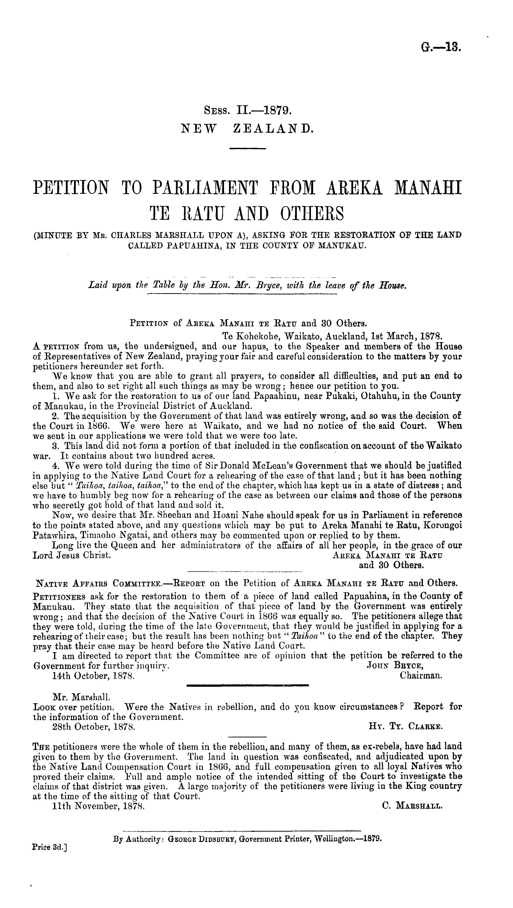 PETITION TO PARLIAMENT FROM AREKA MANAHI TE RATU AND OTHERS (MINUTE BY MR. CHARLES MARSHALL UPON A), ASKING FOR THE RESTORATION OF THE LAND CALLED PAPUAHINA, IN THE COUNTY OF MANUKAU.