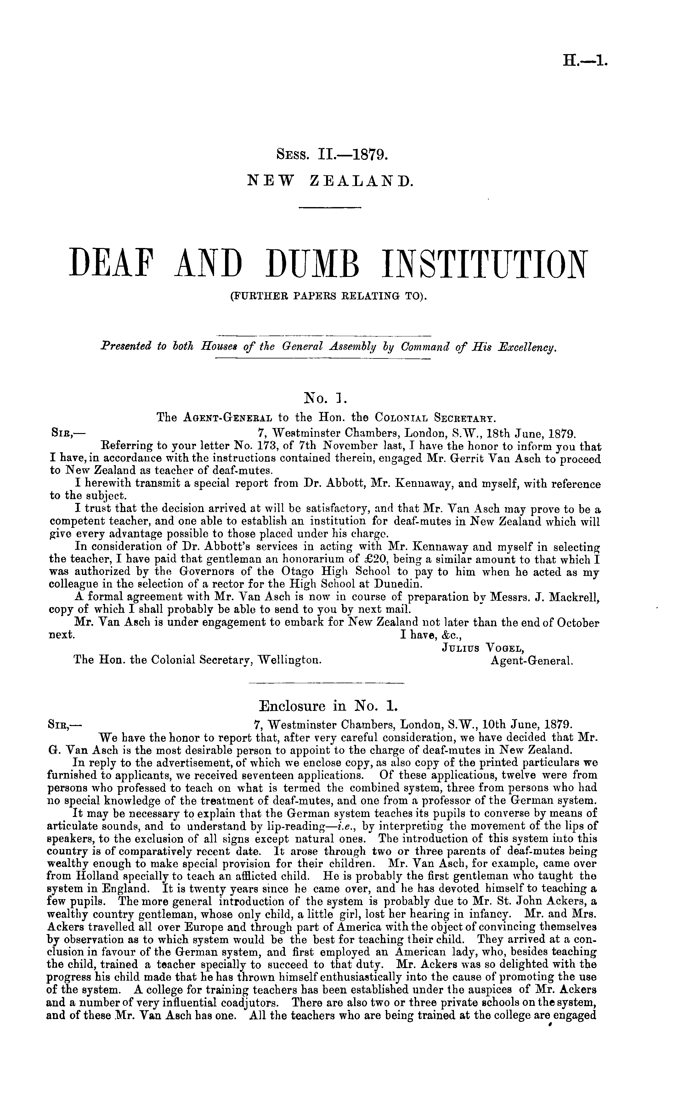 Presented to both Houses of the General Assembly by Command of His Excellency. No. ]. The Agent-Geneeal to the Hon. the Colonial Seceetaey. Sib, — 7, Westminster Chambers, London, S.W., 18th June, 1879. Referring to your letter No. 173, of 7th November last, I have the honor to inform you that I have, in accordance with the instructions contained therein, engaged Mr. Gerrit Van Asch to proceed to New Zealand as teacher of deaf-mutes. I herewith transmit a special report from Dr. Abbott, Mr. Kennaway, and myself, with reference to the subject. I trust that the decision arrived at will be satisfactory, and that Mr. Van Asch may prove to be a competent teacher, and one able to establish an institution for deaf-mutes in New Zealand which will give every advantage possible to those placed under his charge. In consideration of Dr. Abbott's services in acting with Mr. Kennaway and myself in selecting the teacher, I have paid that gentleman an honorarium of £20, being a similar amount to that which I was authorized by tho Governors of the Otago High School to pay to him when he acted as my colleague in the selection of a rector for the High School at Dunedin. A formal agreement with Mr. Van Asch is now in course of preparation by Messrs. J. Mackrell, copy of which I shall probably be able to send to you by next mail. Mr. Van Asch is under engagement to embark for New Zealand not later than the end of October next. I have, &c, Julius Vogel, The Hon. the Colonial Secretary, Wellington. Agent-General.