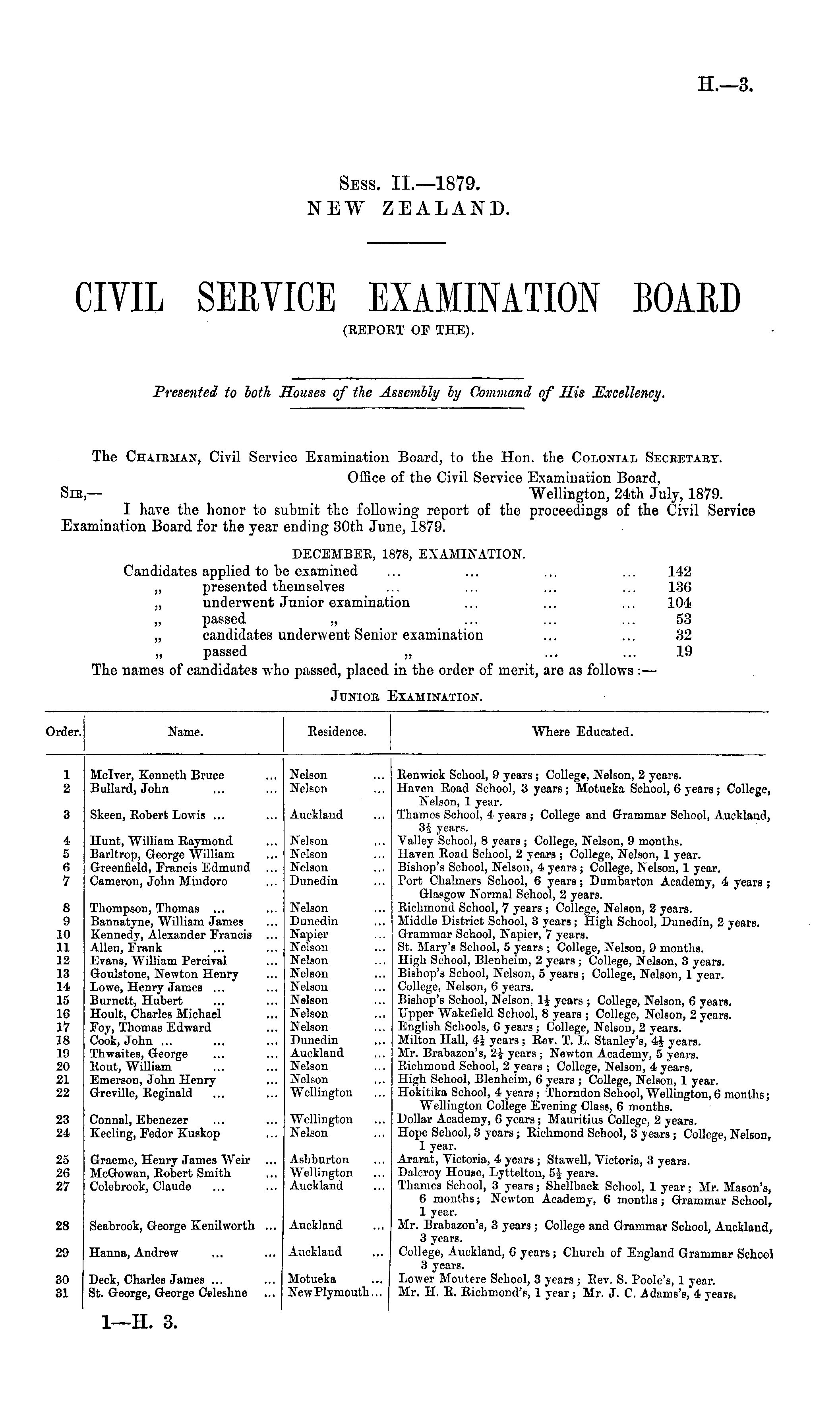 The Chaiemau, Civil Service Examination Board, to the Hon. the Colonial Secretaey. Office of the Civil Service Examination Board, Sib,— Wellington, 24th July, 1879. I have the honor to submit the following report of the proceedings of the Civil Service Examination Board for the year ending 30th June, 1879. DECEMBER, 1878, EXAMINATION. Candidates applied to be examined ... ... ... ... 142 „ presented themselves ... ... ... ... 136 „ underwent Junior examination ... ... ... 104 „ passed „ ... ... ... 53 „ candidates underwent Senior examination ... ... 32 „ passed „ ... ... 19 The names of candidates who passed, placed in the order of merit, are as follows : —