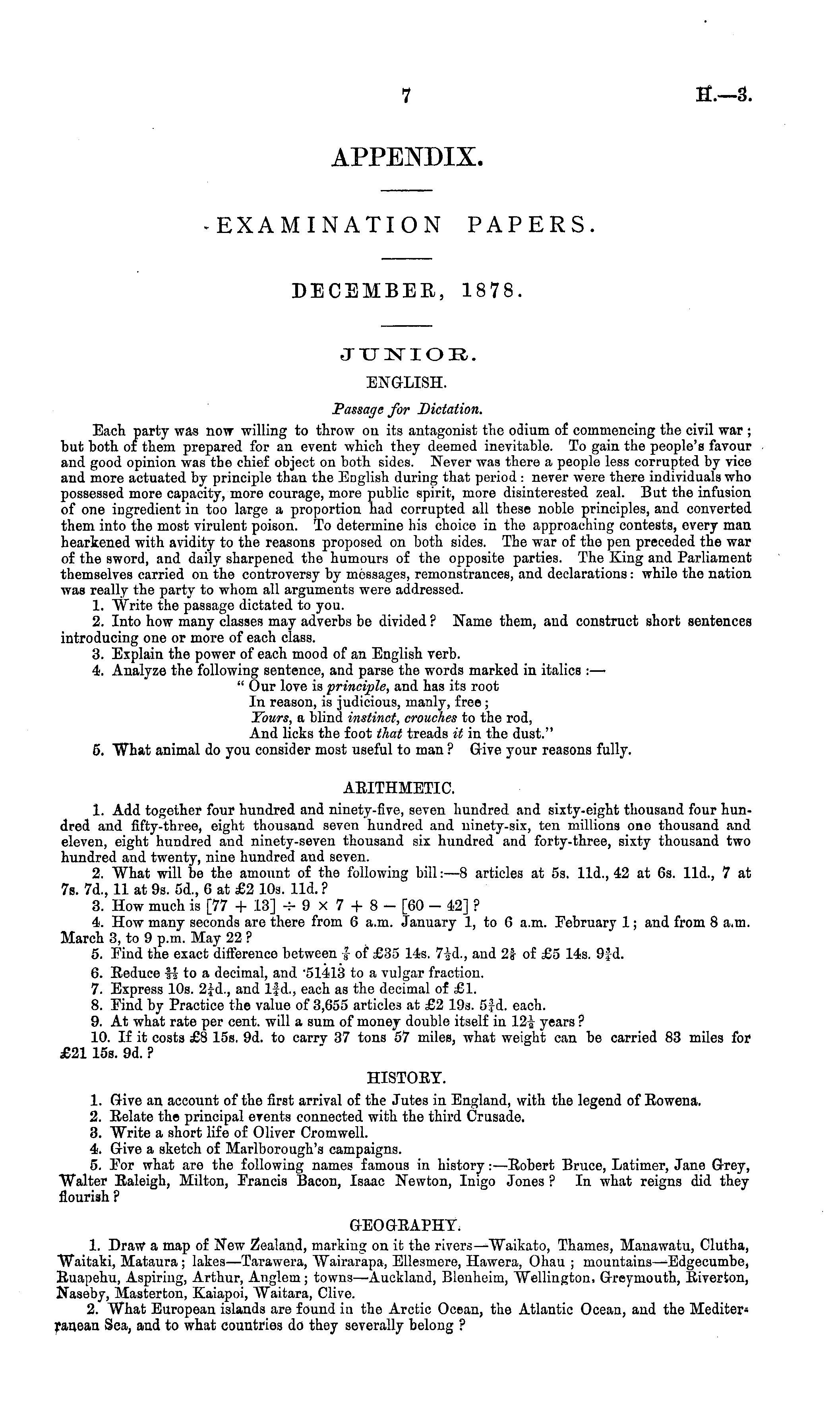 JTJIsriOIR. ENGLISH. Passage for Dictation. Each party was now willing to throw ou its antagonist the odium of commencing the civil war ; but both of them prepared for an event which they deemed inevitable. To gain the people's favour and good opinion was the chief object on both sides. Never was there a people less corrupted by vice and more actuated by principle thau the English during that period : never were there individuals who possessed more capacity, more courage, more public spirit, more disinterested zeal. But the infusion of one ingredient in too large a proportion had corrupted all these noble principles, and converted them into the most virulent poison. To determine his choice in the approaching contests, every man hearkened with avidity to the reasons proposed on both sides. The war of the pen preceded the war of the sword, and daily sharpened the humours of the opposite parties. The King and Parliament themselves carried on the controversy by messages, remonstrances, and declarations: while the nation was really the party to whom all arguments were addressed. 1. Write the passage dictated to you. 2. Into how many classes may adverbs be divided ? Name them, and construct short sentences introducing one or more of each class. 3. Explain the power of each mood of an English verb. 4. Analyze the following sentence, and parse the words marked in italics : — " Our love is principle, and has its root In reason, is judicious, manly, free; Yours, a blind instinct, crouches to the rod, And licks the foot that treads it in the dust." 5. What animal do you consider most useful to man ? Give your reasons fully. AEITHMETIC. 1. Add together four hundred and ninety-five, seven hundred and sixty-eight thousand four hundred and fifty-three, eight thousand seven hundred and ninety-sis, ten millions one thousand and eleven, eight hundred and ninety-seven thousand six hundred and forty-three, sixty thousand two hundred and twenty, nine hundred and seven. 2. What will be the amount of the following bill: —8 articles at ss. lid., 42 at 6s. lid., 7 at 7s. 7d., 11 at 9s. 5d., 6 at £2 10s. lid. ? 3. How much is [77 + 13] 4- 9 x 7 + 8 - [60 - 42] ? 4. How many seconds are there from 6 a.m. January 1, to 6 a.m. February 1; and from 8 a,tn. March 3, to 9 p.m. May 22 ? 5. Pind the exact difference between f of £35 14s. 7£d., and 2f of £5 14s. 9Jd6. Reduce f-| to a decimal, and '51413 to a vulgar fraction. 7. Express 10s. 2jd., and lfd., each as the decimal of £1. 8. Find by Practice the value of 3,655 articles at £2 19s. s.i:d. each. 9. At what rate per cent, will a sum of money double itself in VL\ years ? 10. If it costs £8 15s. 9d. to carry 37 tons 57 miles, what weight can be carried 83 miles for £21 15s. 9d. ? HISTOEY. 1. Give an account of the first arrival of the Jutes in England, with the legend of Eowena. 2. Eelate the principal events connected with the third Crusade. 3. Write a short life of Oliver Cromwell. 4. Give a sketch of Marlborough's campaigns. 5. For what are the following names famous in histoiy:—Eobert Bruce, Latimer, Jane Grey, Walter Raleigh, Milton, Francis Bacon, Isaac Newton, Inigo Jones ? In what reigns did they flourish ? GEOGEAPHT. 1. Draw a map of New Zealaud, marking on it the rivers—Waikato, Thames, Manawatu, Clutha, Waitaki, Mataura ; lakes—Tarawera, Wairarapa, Ellesmere, Hawera, Ohau ; mountains —-Edgecumbe, Euapehu, Aspiring, Arthur, Anglem; towns—Auckland, Blenheim, Wellington, Greymouth, Eiverton, Naseby, Masterton, Kaiapoi, Waitara, Clive. 2. What European islands are found in the Arctic Ocean, the Atlantic Ocean, and the Mediterranean Sea, and to what countries do they severally belong ?