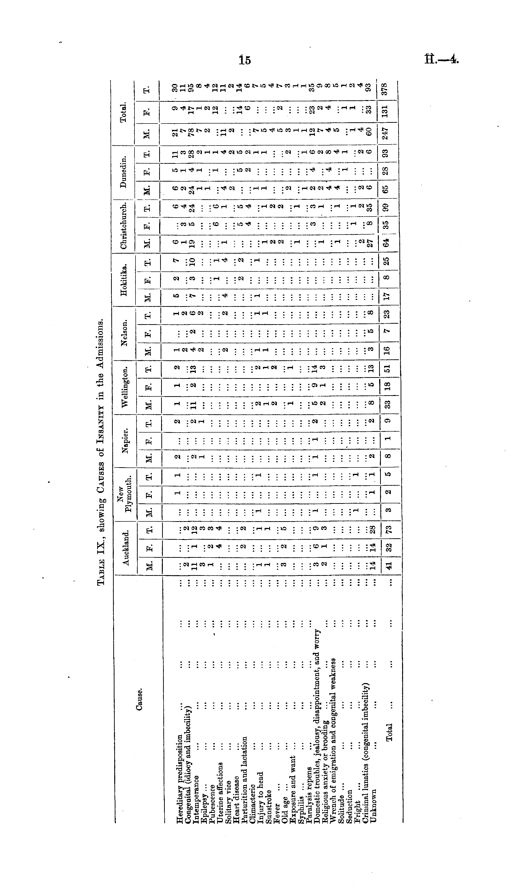 Auckland. Nev Plymoi Napier. Wellington. Nelson. Hokitika. Christchurch. Dunedin. Total. ith. Cause. M. F. T. M. F. T. M. p. jT. M. F. T. M. F. T. M. F. T. M. F. T'i *. F. T. ac F. T. I I—I I I i I I 1 I ! i Hereditary predisposition Congenital (idiocy and imbecility) Intemperance Fpilepsy... Pubescence ... ... ... . ... Uterine affections Solitary vice Heart disease Parturition aud lactation Climacteric Injury to head Sunstroke Fever Old age ... Exposure and want ... Syphilis ... Paralysis repens Domestic troubles, jealousy, disappointment, and worry Religious anxiety or brooding Wrench of emigration and congenital weakness Solitude ... Seduction Fright ... Criminal lunatics (congenital imbecility) Unknown ... 2 11 3 1 1 2 12 3 3 4 ... 1 1 2 2 1 ... | 2 2 1 1 i'i 1 2 2 13 1 2 4 2 ... "2 1 2 6 2 5 "7 2 3 7 i'6 6 1 19 3 5 6 4 24 6 2 24 1 1 5 1 4 1 11 3 28 2 1 1 4 2 5 2 1 1 21 78 7 2 9 4 17 1 2 12 30 11 95 8 4 12 11 2 14 6 7 5 4 7 8 1 1 35 9 8 5 1 2 4 93 2 4 ... '" 1 '" "i i 4 ... ... 6 I ... G 1 1 ... 2 "2 I "i "i 4 2 ii 2 2 2 "2 2 ... "5 4 5 4 5 2 14 6 ... ... . "i 1 "i 1 i i 2 1 2 2 1 2 1 1 "i 1 1 i 1 2 2 "i 2 2 1 1 7 5 4 5 3 1 1 12 7 4 5 1 ... I 3 2 "5 '" 1 ... 2 ... ... "i 1 2 "2 ... ... ... "i -• 1 2 2 1 6 2 8 4 1 ... ... "3 2 i "9 3 "i i ", "i "a "5 2 "9 1 14 3 3 "3 4 23 2 4 1 4 ... "i ... I i i 1 1 ... ... I '" ... ... ... "i i i ... ... ... ... ... i 1 2 35 1 4 60 14 14 28 i "i 2 "2 8 5 13 3 ... I 5 "8 •2 27 I "8 2 6 2 6 33 41 32 73 — — 5 8 i 1 — — 51 16 7 23 17 — 25 64 : 35 I 1 1 1 1 — 1 I I 93 I j 247 131 378 Total 3 a 33 18 8 99 ! 65 28