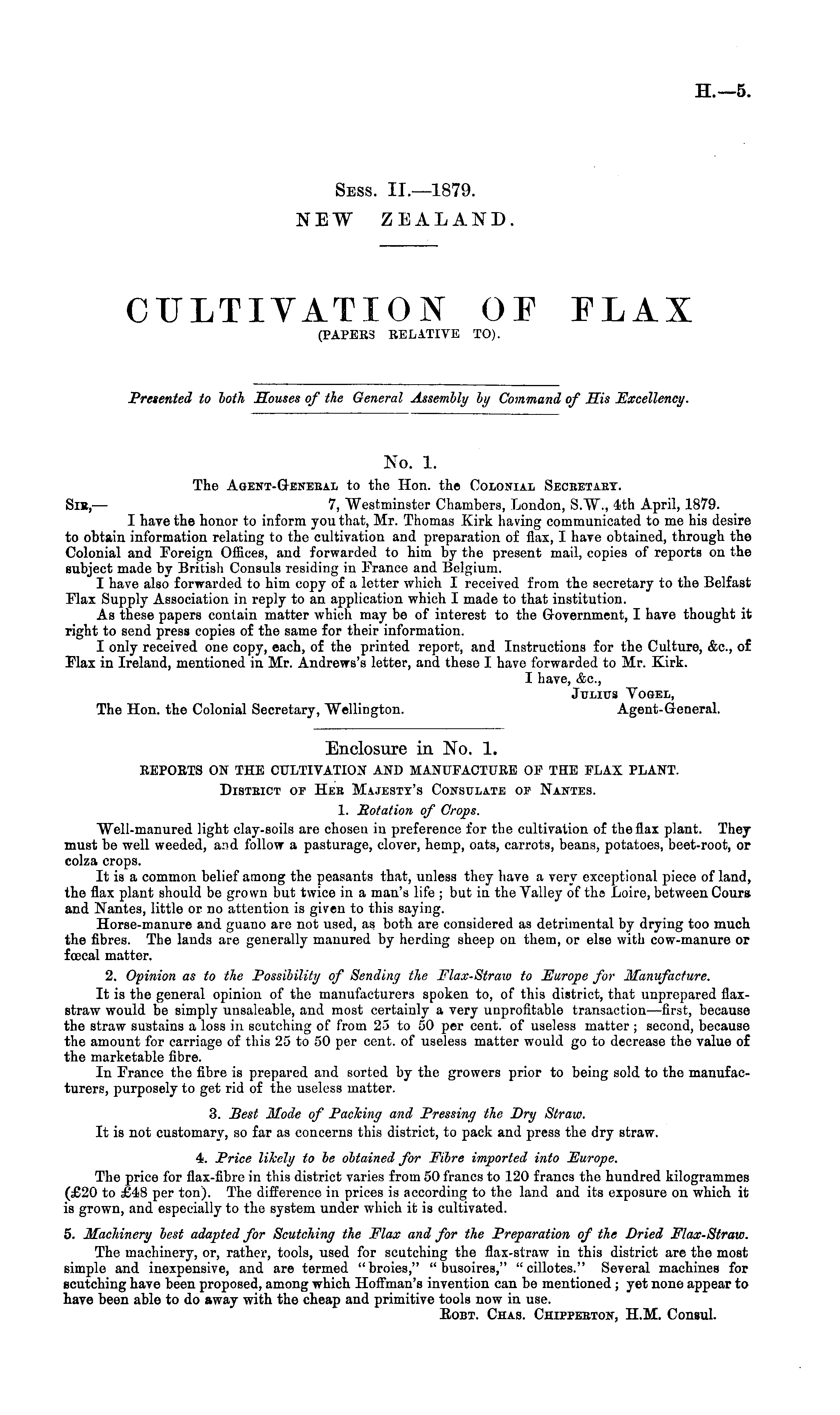 Presented to both Houses of the General Assemblg by Command of His Excellency. No. 1. The Agent-Geneeal to the Hon. the Colonial Seceetaey. Sib, — 7, Westminster Chambers, London, S.AV., 4th April, 1879. I have the honor to inform you that, Mr. Thomas Kirk having communicated to me his desire to obtain information relating to the cultivation and preparation of flax, I have obtained, through the Colonial and Foreign Offices, and forwarded to him by the present mail, copies of reports on the subject made by British Consuls residing in France and Belgium. I have also forwarded to him copy of a letter which I received from the secretary to the Belfast Flax Supply Association in reply to an application which I made to that institution. As these papers contain matter which may be of interest to the Government, I have thought it right to send press copies of the same for their information. I only received one copy, each, of the printed report, and Instructions for the Culture, &c, of Flax in Ireland, mentioned in Mr. Andrews's letter, and these I have forwarded to Mr. Kirk. I have, &c, Julius Vogel, The Hon. the Colonial Secretary, Wellington. Agent-General.