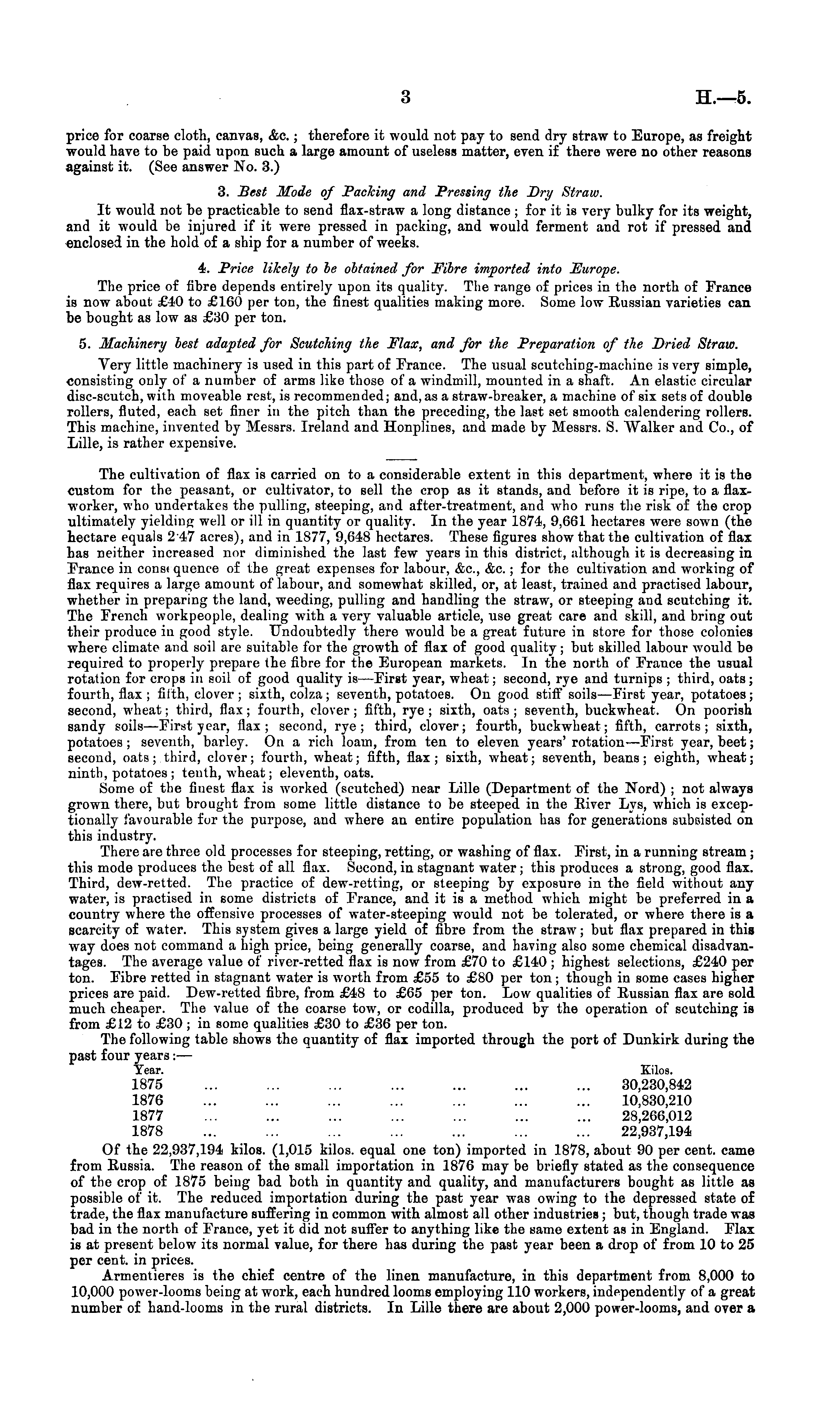 price for coarse cloth, canvas, &c. ; therefore it would not pay to send dry straw to Europe, as freight would have to be paid upon such a large amount of useless matter, even if there were no other reasons against it. (See answer No. 3.) 3. Best Mode of Packing and Pressing the Dry Straw. It would not be practicable to send flax-straw a long distance ; for it is very bulky for its weight, and it would be injured if it were pressed in packing, and would ferment and rot if pressed and enclosed in the hold of a ship for a number of weeks. 4. Price likely to be obtained for Fibre imported into Europe. The price of fibre depends entirely upon its quality. The range of prices in the north of France is now about £40 to £160 per ton, the finest qualities making more. Some low Russian varieties can be bought as low as £30 per ton. 5. Machinery best adapted for Scutching the Flax, and for the Preparation of the Dried Straw. Aery little machinery is used in this part of France. The usual scutching-maehine is very simple, consisting only of a number of arms like those of a windmill, mounted in a shaft. An elastic circular disc-scutch, with moveable rest, is recommended; and, as a straw-breaker, a machine of six sets of double rollers, fluted, each set finer in the pitch than the preceding, the last set smooth calendering rollers. This machine, invented by Messrs. Ireland and Honplines, and made by Alessrs. S. AValker and Co., of Lille, is rather expensive. The cultivation of flax is carried on to a considerable extent in this department, where it is the custom for the peasant, or cultivator, to sell the crop as it stands, and before it is ripe, to a flaxworker, who undertakes the pulling, steeping, and after-treatment, and who runs the risk of the crop ultimately yielding well or ill in quantity or quality. In the year 1874, 9,661 hectares were sown (the hectare equals 247 acres), and in 1877, 9,648 hectares. These figures show that the cultivation of flax has neither increased nor diminished the last few years in this district, although it is decreasing in France in const quence of the great expenses for labour, &c, &c.; for the cultivation and working of flax requires a largo amount of labour, and somewhat skilled, or, at least, trained and practised labour, whether in preparing the land, weeding, pulling and handling the straw, or steeping and scutching it. The French workpeople, dealing with a very valuable article, use great care and skill, and bring out their produce in good style. Undoubtedly there would be a great future in store for those colonies where climate and soil are suitable for the growth of flax of good quality; but skilled labour would be required to properly prepare the fibre for the European markets. In the north of France the usual rotation for crops in soil of good quality is—First year, wheat; second, rye and turnips ; third, oats ; fourth, flax ; fifth, clover ; sixth, colza; seventh, potatoes. On good stiff soils—First year, potatoes; second, wheat; third, flax; fourth, clover; fifth, rye ; sixth, oats ; seventh, buckwheat. On poorish sandy soils —First year, flax; second, rye; third, clover; fourth, buckwheat; fifth, carrots; sixth, potatoes; seventh, barley. On a rich loam, from ten to eleven years' rotation—First year, beet; second, oats ; third, clover; fourth, wheat; fifth, flax ; sixth, wheat; seventh, beans ; eighth, wheat; ninth, potatoes ; tenth, wheat; eleventh, oats. Some of the Arrest flax is worked (scutched) near Lille (Department of the Nord) ; not always grown there, but brought from some little distance to be steeped in the River Lys, which is exceptionally favourable for the purpose, and where an entire population has for generations subsisted on this industry. There are three old processes for steeping, retting, or washing of flax. First, in a running stream ; this mode produces the best of all flax. Second, in stagnant water; this produces a strong, good flax. Third, dew-retted. The practice of dew-retting, or steeping by exposure in the field without any water, is practised in some districts of France, and it is a method which might be preferred in a country where the offensive processes of water-steeping would not be tolerated, or where there is a scarcity of water. This system gives a large yield of fibre from the straw 7; but flax prepared in this way does not command a high price, being generally coarse, and having also some chemical disadvantages. The average value of river-retted flax is now from £70 to £140 ; highest selections, £240 per ton. Fibre retted in stagnant water is worth from £55 to £80 per ton; though in some cases higher prices are paid. Dew-retted fibre, from £48 to £65 per ton. Low qualities of Russian flax are sold much cheaper. The value of the coarse tow, or codilla, produced by the operation of scutching is from £12 to £30 ; iv some qualities £30 to £36 per ton. The following table shows the quantity of flax imported through the port of Dunkirk during the past four years : — Year. Kilos. 1875 ... ... ... ... ... ... ... 30,230,842 1876 ... ... ... ... ... ... ... 10,830,210 1877 ... ... ... ... ... ... ... 28,266,012 1878 ... ... ... ... ... ... ... 22,937,194 Of the 22,937,194 kilos. (1,015 kilos, equal one ton) imported in 1878, about 90 per cent, came from Russia. The reason of the small importation in 1876 may be briefly stated as the consequence of the crop of 1875 being bad both in quantity and quality, and manufacturers bought as little as possible of it. The reduced importation during the past year was owing to the depressed state of trade, the flax manufacture suffering in common with almost all other industries ; but, though trade was bad in the north of France, yet it did not suffer to anything like the same extent as in England. Flax is at present below 7 its normal value, for there has during the past year been a drop of from 10 to 25 per cent, in prices. Armentieres is the chief centre of