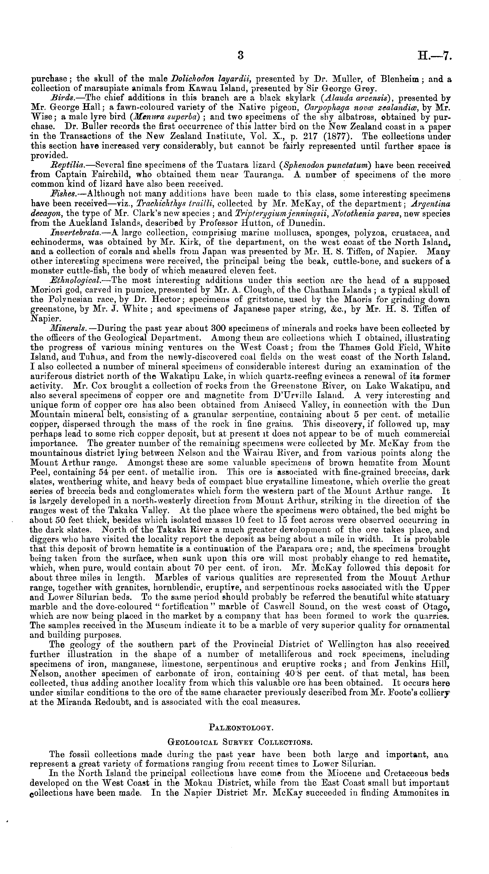 purchase ; the skull of the male Dolicliodon layardii, presented by Dr. Muller, of Blenheim ; and a collection of marsupiate animals from Kawau Island, presented by Sir George Grey. Birds. —The. chief additions in this branch are a black skylark (Alauda arvensis), presented by Mr. George Hall; a fawn-coloured variety of the Native pigeon, Carpophaga nova; zealandiw, by Mr. Wise; a male lyre bird (Mennra superbd) ; and two specimens of the shy albatross, obtained by purchase. Dr. Buller records the first occurrence of this latter bird on the New 7 Zealand coast in a paper in the Transactions of the New Zealand Institute, Vol. X., p. 217 (1877). The collections under this section have increased very considerably, but cannot be fairly represented until further space is provided. Reptilia. —Several fine specimens of the Tuatara lizard (Sphenodon punclatuiri) have been received from Captain Fair-child, who obtained them near Tauranga. A number of specimens of the more common kind of lizard have also been received. Fishes. —Although not many additions have been made to this class, some interesting specimens have been received—viz., Trachichthys irailli, collected by Mr. McKay, of the department; Argentina decagon, the type of Mr. Clark's new species ; and Tripterygiumjenningsii, Nototheniaparva, new species from the Auckland Islands, described by Professor Hutton, of Dunedin. Invertebrata.- —A large collection, comprisiug marine mollusca, sponges, polyzoa, Crustacea, and eehinoderms, was obtained by Mr. Kirk, of the department, on the west coast of the North Island, and a collection of corals and shells from Japan was presented by Mr. H. S. Tiflen, of Napier. Many other interesting specimens were received, the principal being the beak, cuttle-bone, and suckers of a monster cuttle-fish, the body of which measured eleven feet. Ethnological. —The most interesting additiorrs under this section are the head of a supposed Moriori god, carved in pumice, presented by Mr. A. Clouglr, of the Chatham Islands ; a typical slurll of the Polynesian race, by Dr. Hector; specimens of gritstone, used by the Maoris for grinding down greenstone, by Mr. J. White ; and specimens of Japanese paper string, &c, by Mr. IT. S. Tiffen of Napier. Minerals. —During the past year about 300 specimens of minerals and rocks have been collected by the officers of'the Geological Department. Among them are collections which I obtained, illustrating the progress of various mining ventures on the West Coast; from the Thames Gold Eielcl, White Island, and Trrhua, and from the newly-discovered coal fields on the west coast of the North Island. I also collected a number of mineral specimens of considerable interest during an examination of the auriferous district north of the Wakatipu Lake, irr which quartz-reefing evinces a renewal of its former activity. Mr. Cox brought a collection of rocks from the Greenstone River, on Lake Wakatipu, and also several specimens of copper ore and magnetite from D'Urville Island. A very interesting and unique form of copper ore has also been obtained from Aniseed Valley, in connection with the Dun Mountain mineral belt, consisting of a granular serpentine, containing about 5 per cent, of metallic copper, dispersed through the mass of the rock in fine grains. This discovery, if followed up, may perhaps lead to some rich copper deposit, but at present it does not appear to be of much commercial importance. The greater number of the remaining specimens were collected by Mr. McKay from the mountainous district lying between Nelson and the Wairau Eiver, and from various points along the Mount Arthur range. Amongst these are some valuable specimens of brown hematite from Mount Peel, containing 54 per cent, of metallic iron. This ore is associated with fine-grained breccias, dark slates, weathering white, and heavy beds of compact blue crystalline limestone, which overlie the great series of breccia beds and conglomerates which form the western part of the Mount Arthur range. It is largely developed in a north-westerly direction from Mount Arthur, striking in the direction of the ranges west of the Takaka Valley. At the place where the specimens were obtained, the bed might be about 50 feet thick, besides which isolated masses 10 feet to 15 feet across were observed occurring in the dark slates. North of the Takaka River a much greater devoloprnent of the ore takes place, and diggers who have visited the locality report the deposit as being about a mile in width. It is probable that this deposit of brown hematite is a continuation of the Parapara ore; and, the specimens brought being taken from the surface, when sunk upon this ore will most probably change to red hematite, which, when pure, would contain about 70 per cent, of iron. Mr. McKay followed this deposit for about three miles in length. Marbles of various qualities are represented from the Mount Arthur range, together with granites, hornblendic, eruptive, and serpentinous rocks associated with the Upper and Lower Silurian beds. To the same period should probably be referred the beautiful white statuary marble and the dove-coloured "fortification" marble of Caswell Sound, on the west coast of Otago, which are now being placed in the market by a company that has been formed to work the quarries. The samples received in the Museum indicate it to he a marble of very superior quality for ornamental and building purposes. The geology of the southern part of the Provincial District of Wellington has also received further illustration in the shape of a number of metalliferous and rock specimens, including specimens of iron, manganese, limestone, serpentinous and eruptive rocks; and from Jenkins Hill, Nelson, another specimen of carbonate of iron, containing 40'S per cent, of that metal, has been collected, thus addirrg another locality from which this valuable ore has been obtained. It occurs here under similar conditions to the ore of the sa