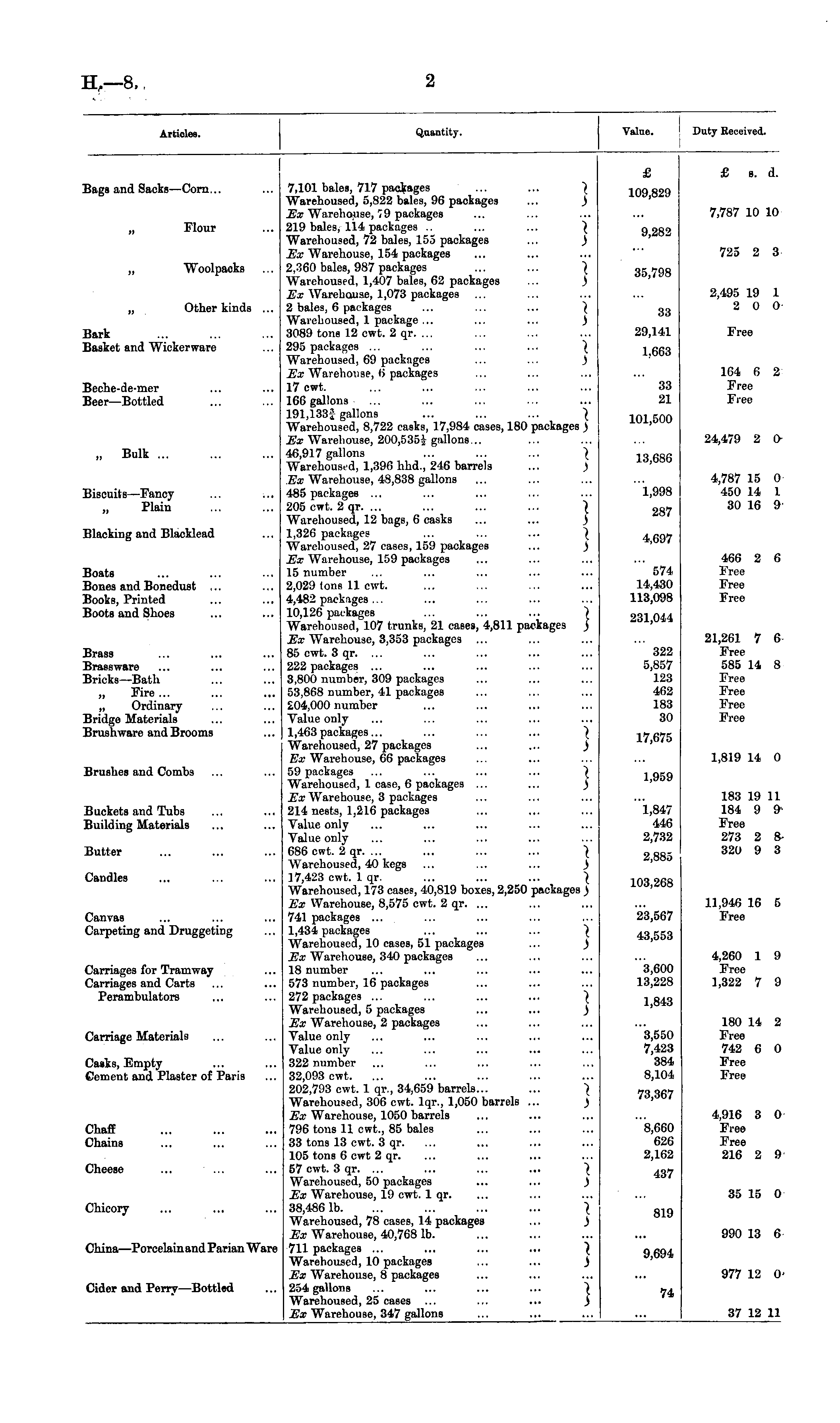 Articles. Quantity. Value. I Duty Eeceived. £ £ a. A. Bags and Sacks —Corn... 7,101 bales, 717 packages ... ... ) Warehoused, 5,822 bales, 96 packages ... _ Ex Warehouse, 79 packages 219 bales, 114 packages .. ... ... Warehoused, 72 bales, 155 packages ... ) Ex Warehouse, 154 packages 2,:!60 bales, 987 packages ... ... } Warehoused, 1,407 bales, 62 packages ... 3 Ex Warehouse, 1,073 packages 2 bales, 6 packages ... ... ... } Warehoused, 1 package... ... ... ) 3089 tons 12 cwt. 2 qr. ... 295 packages ... ... ... ... Warehoused, 69 packages ... ... ) Ex Warehouse, 6 packages 17 cwt. 166 gallons 191,133} gallons ... ... ... } Warehoused, 8,722 casks, 17,984 cases, 180 packages ) Ex Warehouse, 200,5351- gallons... 46,917 gallons ... ... ... ) Warehoused, 1,396 hhd., 246 barrels ... ) .Ea. Warehouse, 48,838 gallons 485 packages ... 205 cwt. 2qr. ... ... ... ... } Warehoused, 12 bags, 6 casks ... ... ) 1,326 packages ... ... ... ) Warehoused, 27 eases, 159 packages ... ) Ex Warehouse, 159 packages 15 number 2,029 tons 11 cwt. 4,482 packages ... 10,126 packages ... ... ... ~) Warehoused, 107 trunks, 21 cases, 4,811 packages j Ex Warehouse, 3,353 packages ... 85 cwt. 3 qr. ... 222 packages ... 3,800 number, 309 packages 53,868 number, 41 packages £04,000 number Value only 1,463 packages... ... ... ... Warehoused, 27 packages ... ... ) Ex Warehouse, 66 packages 59 packages ... ... ... ... Warehoused, 1 case, 6 packages ... ... . Ex Warehouse, 3 packages 214 nests, 1,216 packages Value only Value only 686 cwt. 2 qr. ... ... ... ... ) Warehoused, 40 kegs ... ... ... _) 17,423 cwt. 1 qr. ... ... ... ) Warehoused, 173 eases, 40,819 boxes, 2,250 packages ) Ex Warehouse, 8,575 cwt. 2 qr. ... 741 packages ... 1,434 packages ... ... ... Warehoused, 10 cases, 51 packages ... . Ex Warehouse, 340 packages 18 number 573 number, 16 packages 272 packages ... ... ... ... Warehoused, 5 packages ... ... ) Ex Warehouse, 2 packages Value only Value only 322 number 32,093 cwt. 202,793 cwt. 1 qr., 34,659 barrels... ... } Warehoused, 306 cwt. lqr., 1,050 barrels ... ) Ex Warehouse, 1050 barrels 796 tons 11 cwt., 85 bales 33 tons 13 cwt. 3 qr. 105 tons 6 cwt 2 qr. 57 cwt. 3 qr. ... ... ... ... Warehoused, 50 packages ... ... ) .Ex Warehouse, 19 cwt. 1 qr. 38,486 1b. ... ... ... ... } Warehoused, 78 cases, 14 packages ... J Ex Warehouse, 40,768 lb. 711 packages ... ... ... ... } Warehoused, 10 packages ... ... 3 Ex Warehouse, 8 packages 254 gallons ... ... ... ... Warehoused, 25 cases ... ... ... ) Ex Warehouse, 347 gallons „. ... 109,829 7,787 10 10 „ Flour 9,282 „ Woolpacks 725 2 3 35,798 2,495 19 1 2 0 0 „ Other kinds ... 33 Bark Basket and Wickerware 29,141 1.663 Free Beche-de-mer Beer—Bottled 33 21 164 6 2 Free Free 101,500 24,479 2 O „ Bulk ... 13,686 Biscuits —Fancy „ Plain ' 1,998 4,787 15 0 450 14 1 30 16 9 287 Blacking and Blacklead 4,697 466 2 6 Free Free Free Boats Bones and Bonedust .. Books, Printed Boots and Shoes 574 14,430 113,098 231,044 21,261 7 6 Free 585 14 8 Free Free Free Free Brass Brassware Bricks —Bath „ Fire ... „ Ordinary Bridge Materials Brushware and Brooms 322 5,857 123 462 183 30 17,675 1,819 14 0 Brushes and Combs 1,959 Buckets and Tubs Building Materials 1,847 446 2,732 183 19 11 184 9 9 Free 273 2 8 320 9 3 Butter 2,885 Candles 103,268 11,946 16 5 Free Canvas Carpeting and Druggeting 23,567 43,553 4,260 1 9 Free 1,322 7 9 Carriages for Tramway Carriages and Carts Perambulators 3,600 13,228 1,843 180 14 2 Free 742 6 0 Free Free Carriage Materials 3,550 7,423 384 8,104 Casks, Empty Cement and Plaster of Paris 73,367 4,916 3 0 Free Free 216 2 9 Chaff Chains 8,660 626 2,162 Cheese ... ... 437 Chicory 35 15 0 819 990 13 6 China —Porcelainand Parian Ware 9,694 Cider and Perry —Bottled 977 12 0 74 37 12 11