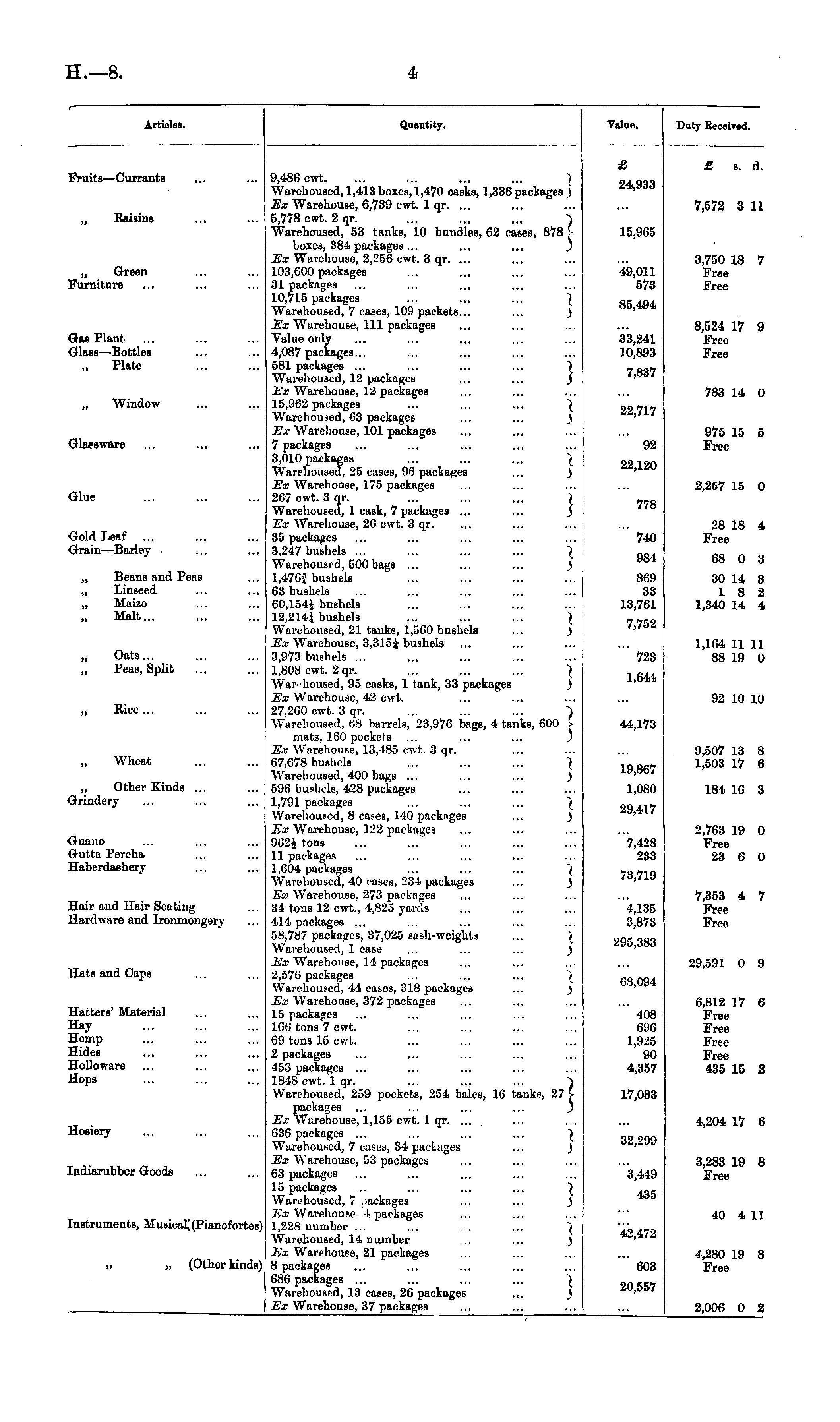 Articles. Quantity. Value. Duty Eeceived. £ £ a. A. Fruits—Currants „ Raisins „ Green Furniture Gas Plant ... Glass—Bottles Plate „ Window Glassware Glue Gold Leaf Grain —Barley „ Beans and Peas „ Linseed „ Maize „ Malt... Oats... „ Peas, Split „ Rice ... Wheat 9,486 cwt. ... ... ... ... "J Warehoused, 1,413 boxes, 1,470 casks, 1,336 packages ) Ex Warehouse, 6,739 cwt. 1 qr. ... 5,778 cwt. 2 qr. ... ... ... "1 Warehoused, 53 tanks, 10 bundles, 62 cases, 878 fboxes, 384 packages... ... ... ) Ex Warehouse, 2,256 cwt. 3 qr. ... 103,600 packages 31 packages 10,715 packages ... ... ... } Warehoused, 7 cases, 109 packets... ... ) Ex Warehouse, 111 packages Value only 4,087 packages... 581 packages ... ... ... ... Warehoused, 12 packages ... ... 3 Ex Warehouse, 12 packages 15,962 packages ... ... ... } Warehoused, 63 packages ... ... ,. Ex Warehouse, 101 packages 7 packages 3,010 packages ... ... ... Warehoused. 25 cases, 90 packages ... ) Ex Warehouse, 175 packages 207 cwt. 3 qr. ... ... ... } Warehoused, 1 cask, 7packages ... ... ) Ex Warehouse, 20 cwt. 3 qr. 35 packages 3,247 bushels ... ... ... ... } Warehoused, 500 bags ... ... ... ) 1,470-J bushels 63 bushels 60.154J bushels 12,2144. bushels ... ... ... } Warehoused, 21 tanks, 1,560 bushels ... ) Ex Warehouse, 3,315i bushels 3,973 bushels ... 1,808 cwt. 2 qr. ... ... ... } War' housed, 95 casks, 1 tank, 33 packages > Ex Warehouse, 42 ewt. 27,200 cwt. 3 qr. ... ... ... ) Warehoused, OS barrels, 23,976 bags, 4 tanks, 600 > mats, 160 pockets ... ... ... ) Ex Warehouse, 13,485 cwt. 3 qr. 67,678 bushels ... ... ... } Warehoused, 400 bags ... ... ... ) 596 bushels, 428 packages 1,791 packages ... ... ... Warehoused, 8 ca.es, 140 packages ... ) Ex Warehouse, 122 packages 962i tons 11 packages 1,604 packages ... ... ... Warehoused, 40 eases, 234 packages ... ) Ex Warehouse. 273 packages 34 tons 12 cwt., 4,825 yards 414 packages ... 58,787 packages, 37,025 sash-weights ... ) Warehoused, 1 case ... ... ... > Ex Warehouse, 14 packages 2,570 packages ... ... ... ") Warehoused, 44 eases, 318 packages ... ) Ex Warehouse, 372 packages 15 packages 100 tons 7 cwt. 69 tons 15 cwt. 2 packages 453 packages ... 1848 cwt. 1 qr. ... ... ... ) Warehoused, 259 pockets, 254 bales, 16 tauks, 27 £ packages ... ... ... ... j Ex Warehouse, 1,155 cwt. 1 qr. ... 636 packages ... ... ... ... Warehoused, 7 cases, 34 package! ... J Ex Warehouse, 53 packages 63 packages 15 packages ... ... ... ... | Warehoused, 7 packages ... ... ) Ex Warehouse. 4 packages 1,228 number ... ... ... ... } Warehoused, 14 number ... ... ) Ex Warehouse, 21 packages 8 ];ackages 686 packages ... ... ... ... } Warehoused, 13 cases, 26 packages ... 3 Ex Warehouse, 37 packages 24,933 15,965 49,011 573 85,494 33,241 10,893 7,837 22,717 92 22,120 778 740 984 869 33 13,761 7,752 723 1,644 44,173 7,572 3 11 3,750 18 7 Free Free 8,524 17 9 Free Free 783 14 O 975 15 5 Free 2,257 15 0 28 18 4 Free 68 0 3 30 14 3 18 2 1,340 14 4 1,164 11 11 88 19 0 92 10 10 9,507 13 8 1,503 17 6 19,867 „ Other Kinds ... Grindery 1,080 184 16 3 29,417 2,763 19 0 Free 23 6 0 Guano Gutta Percha Haberdashery 7,428 233 73,719 7,353 4 7 Free Free Hair and Hair Seating Hardware and Ironmongery 4,135 3,873 295,383 29,591 0 9 Hats and Caps 6,8,094 6,812 17 6 Free Free Free Free 435 15 2 Hatters' Material Hay Hemp Hides Holloware Hops 408 696 1,925 90 4,357 17,083 4,204 17 6 Hosiery 32,299 3,283 19 8 Free Indiarubber Goods 3,449 435 Instruments, Musical (Pianofortes) 40 4 11 42,472 >. „ (Other kinds) 603 .280 19 8 Free 20,557 2,006 0 2