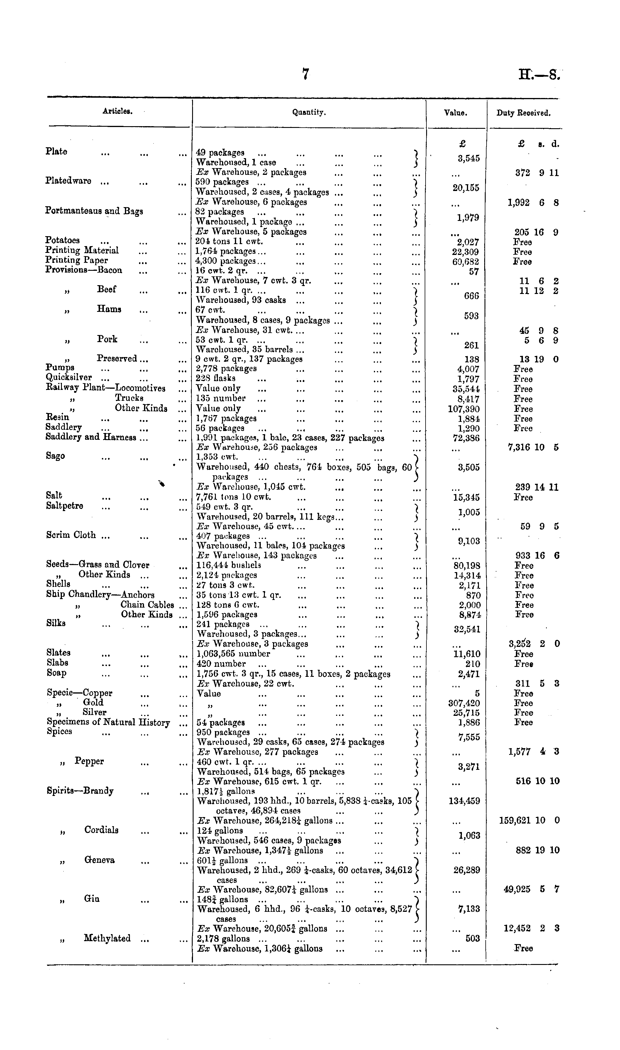 Articles. Quantity. Value. Duty Eeceived. £ £ s. d. Plato Platedwaro ... Portmanteaus and Bags Potatoes Printing Material Printing Paper Provisions—Bacon » Beef „ Hams Pork ,, Preserved... Pumps Quicksilver ... Railway Plant—Locomotives Trucks ., Other Kinds ... Resin Saddlery Saddlery and Harness ... 49 packages ... ... ... ... ") Warehoused, lease ... ... ... 3 Ex Warehouse, 2 packages 590 packages ... ... ... ... ") Warehoused, 2 cases, 4 packages ... ... 3 Ex Warehouse, 6 packages 82 packages ... ... ... ... Warehoused, 1 package ... ... ... 3 Ex Warehouse, 5 packages 201 tons 11 cwt. 1,704 packages... 4,300 packages... 16 cwt. 2 qr. ... Ex Warehouse, 7 cwt. 3 qr. 110 cwt. 1 qr. ... ... ... ,., ) Warehoused, 93 casks ... ... ... j 67 cwt. ... ... ... ... -> Warehoused, 8 cases, 9 packages ... ... 3 Ex Warehouse, 31 cwt. ... 53 cwt. 1 qr. ... ... ... ... 1 Warehoused, 35 barrels ... ... ... 3 9 cwt. 2 qr., 137 packages 2,778 packages 22S Uasks Value only 135 number Value only 1,707 packages 50 packages 1,991 packages, 1 bale, 23 cases, 227 packages Ex Warehouse, 256 packages 1,353 cwt. ... ... .., ... -\ Warehoused, 410 chests, 761 boxes, 505 bags, 60 C packages ... ... ... ... j Ex Warehouse, 1,045 cwt. 7,701 Ions 10 ewt. 549 cwt. 3 qr. ... ... ... } Warehoused, 20 barrels, 111 kegs... ... 3 Ex Warehouse, 45 cwt.... 407 packages ... ... ... ... "£ Warehoused, 11 bales, 104 packages ... 3 Ex Warehouse, 143 packages 110,441 bushels 2,124 packages 27 tons 3 ewt. 35 tons 18 cwt. 1 qr. 128 tons 6 cwt. 1,596 packages 211 packages ... ... ... ... } Warehoused, 3 packages... ... ... 3 Ex Warehouse, 3 packages 1,063,505 number 4.20 number 1,750 cwt. 3 qr., 15 cases, 11 boxes, 2 packages Ex Warehouse, 22 cwt. Value 3,545 20,155 1,979 2,027 22,309 60,682 57 600 593 261 138 4,007 1,797 35,544 8,417 107,390 1,884 1,290 72,386 372 9 11 1,902 6 8 205 16 9 Free Free Free 11 6 2 11 12 2 45 9 8 5 6 9 13 19 0 Free Free Free Free Free Free Free Sago 7,316 10 5 3,505 239 14 11 Free \ 15,345 Salt Saltpetre 1,005 Scrim Cloth ... 9,103 59 9 5 Seeds—Grass and Clover ,, Other Kinds Shells Ship Chandlery—Anchors „ Chain Cables ... ,, Other Kinds ... 80,193 14,314 2,171 870 2,000 8,874 933 16 6 Free Freo Freo Free Free Free Silks ... 32,541 Slates Slabs Soap 11,010 210 2,471 3,232 2 0 Free Free Specie—Copper Gold „ Silver Specimens of Natural History ... Spices 5 307,420 25,715 1,886 311 5 3 Free Free Free Free „ Pepper Spirits —Brandy ... „ Cordials 51 packages 950 packages ... ... ... ... Warehoused, 29 casks, 05 cases, 274 packages 3 Ex Warehouse, 277 packages 460 cwt. 1 qr. ... ... ... ... } Warehoused, 514 bags, 65 packages ... 3 Ex Warehouse, 615 cwt. 1 qr. 1,817V gallons ... ... ... ) Warehoused, 193 hhd., 10 barrels, 5,838 i-casks, 105 > octaves, 46,894 cases ... ... j Ex Warehouse, 2G4,218i gallons ... 121 gallons ... ... ... ... } Warehoused, 540 cases, 9 packages ... 3 Ex Warehouse, 1,347i gallons 6011 gallons ... ... ... ... ") Warehoused, 2 hhd., 269 i-casks, 60 octaves, 34,612 f cases ... ... ... ... J Ex AVarehouse, S2,607i gallons ... 148} gallons ... ... ... ... } Warehoused, 6 hhd., 96 i-casks, 10 octavos, 8,527 > cases ... ... ... ... J Ex AVarehouse, 20,605} gallons ... 2,178 gallons ... Ex Warehouse, l,306i gallons 7,555 3,271 134,459 1,063 1,577 4 3 516 10 10 159,621 10 0 „ Geneva 882 19 10 26,289 49,925 5 7 „ Giu 7,133 „ Methylated ... 12,452 2 3 503 Free