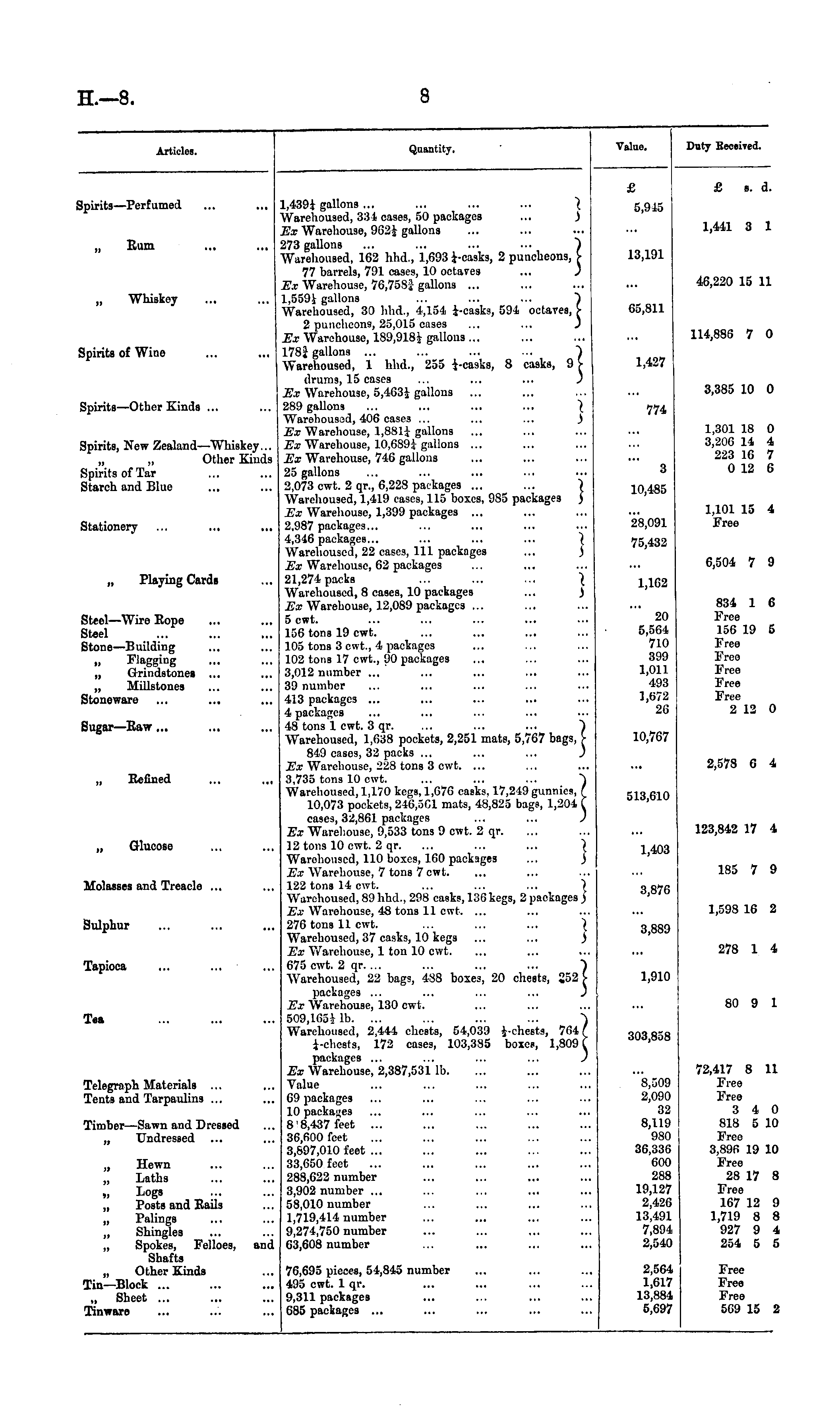 Quantity. Value. Duty Eeceived. Articles. £ £ s. d. Spirits —Perfumed 1,439i gallons ... ... ... ... } AVarehoused, 334 cases, 50 packages ... 3 Ex Warehouse, 962£ gallons 273 gallons ... ... ... ••■ ) AVarehoused, 162 hhd., 1,693 i-casks, 2 puncheons, 77 barrels, 791 cases, 10 octaves ... J Ex AVarehouse, 76,758} gallons ... 1,559}; gallons ... ... ... ~) AVarehoused, 30 hhd., 4,154 i-casks, 594 octaves, > 2 puncheons, 25,015 eases ... ... ) Ex AVarehouse, 189,918 fc gallons ... 178} gallons ... ... ... ... ~) AVarehoused, 1 hhd., 255 i-casks, 8 casks, 9 > drums, 15 cases ... ... ... J Ex Warehouse, 5,463i gallons 289 gallons ... ... ... ... } Warehoused, 406 case3 ... ... ... 3 Ex Warehouse, l,881i gallons Ex AVarehouse, 10,689i gallons ... Ex AVarehouse, 740 gallons 25 gallons 2,073 cwt. 2 qr., 6,228 packages ... ... } AVarehoused, 1,419 cases, 115 boxes, 9S5 packages 3 Ex AVarehouse, 1,399 packages ... 2,987 packages... 4,346 packages... ... ... ... AVarehoused, 22 cases, 111 packages ... 3 Ex Warehouse, 62 packages 21,274 packs ... ... ... } AVarehoused, 8 cases, 10 packages ... 3 Ex AVarehouse, 12,089 packages ... 5 cwt. 156 tons 19 cwt. 105 tons 3 cwt., 4 packages 102 tons 17 cwt., 90 packages 3,012 number ... 39 number 413 packages ... 4 packages 48 tons 1 ewt. 3 qr. ... ... ... ~) AVarehoused, 1,638 pockets, 2,251 mats, 5,767 bags, > 849 cases, 32 packs ... ... ... ) Ex AVarehouse, 228 tons 3 cwt. ... 3,735 tons 10 cwt. ... ... ... ") AVarehoused, 1,170 kegs, 1,676 casks, 17,249 gunnies, f 10,073 pockets, 246,501 mats, 48,825 bags, 1,204 ( eases, 32,861 packages ... ... ) Ex Warehouse, 9,533 tons 9 cwt. 2 qr. 12 tons 10 cwt. 2 qr. ... ... ... } Warehoused, 110 boxes, 160 packages ... 3 Ex AVarehouse, 7 tons 7 cwt. 122 tons 14 cwt. ... ... ... ) Warehoused, 89 hhd., 298 casks, 136 kegs, 2 packages j Ex Warehouse, 48 tons 11 ewt. ... 276 tons 11 cwt. ... ... ... } Warehoused, 37 casks, 10 kegs ... ... 3 Ex Warehouse, 1 ton 10 cwt. 675 cwt. 2 qr. ... ... ... ... ) AVarehoused, 22 bags, 438 boxes, 20 chests, 252 £ packages ... ... ... ... J Ex AVarehouse, 130 cwt. 509,lG5Jlb. ... ... ... .. ~) Warehoused, 2,444 chests, 54,039 i-chests, 704 f i-chests, 172 cases, 103,385 boxes, 1,809 C packages ... ... ... ... J Ex AVarehouse, 2,387,531 lb. Value 69 packages 10 packages 8'8,437feet ... 36,000 feet 3,897,010 feet ... 33,650 feet 288,622 number 3,902 number ... 58,010 number 1,719,414 number 9,274,750 number 63,608 number 5,915 1,441 3 1 „ Rum 13,191 „ Whiskey 46,220 15 11 65,811 114,886 7 0 Spirits of Wine 1,427 Spirits—Other Kinds ... 3,385 10 0 774 1,301 18 0 3,206 14 4 223 16 7 0 12 6 Spirits, New Zealand —Whiskey... „ „ Other Kinds Spirits of Tar Starch and Blue 3 10,485 1,101 15 4 Free Stationery 28,091 75,432 6,504 7 9 „ Playing Cards 1,162 Steel—Wire Rope Steel Stone —Building „ Flagging „ Grindstones ... „ Millstones Stoneware 20 5,564 710 399 1,011 493 1,072 26 834 1 6 Free 156 19 5 Free Freo Free Free Free 2 12 0 Sugar—Raw ... 10,767 „ Refined 2,578 6 4 513,610 123,842 17 4 „ Glucose 1,403 1S5 7 9 Molasses and Treacle ... 3,876 Sulphur 1,598 16 2 3,889 278 1 4 Tapioca 1,910 Tea 80 9 1 303,858 72,417 8 11 Free Free 3 4 0 818 5 10 Free 3,896 19 10 Free 28 17 8 Free 167 12 9 1,719 8 8 927 9 4 254 5 5 Telegraph Materials ... Tents and Tarpaulins ... 8,509 2,090 32 8,119 980 36,336 600 288 19,127 2,426 13,491 7,894 2,540 Timber —Sawn and Dressed „ Undressed „ Hewn „ Laths „ Logs „ Posts and Rails „ Palings „ Shingles „ Spokes, Felloes, and Shafts „ Other Kinds Tin—Block ... „ Sheet ... Tinware 76,695 pieces, 54,845 number 495 cwt. 1 qr. 9,311 packages 685 packages ... 2,564 1,617 13,884 5,697 Free Free Free 509 15 2
