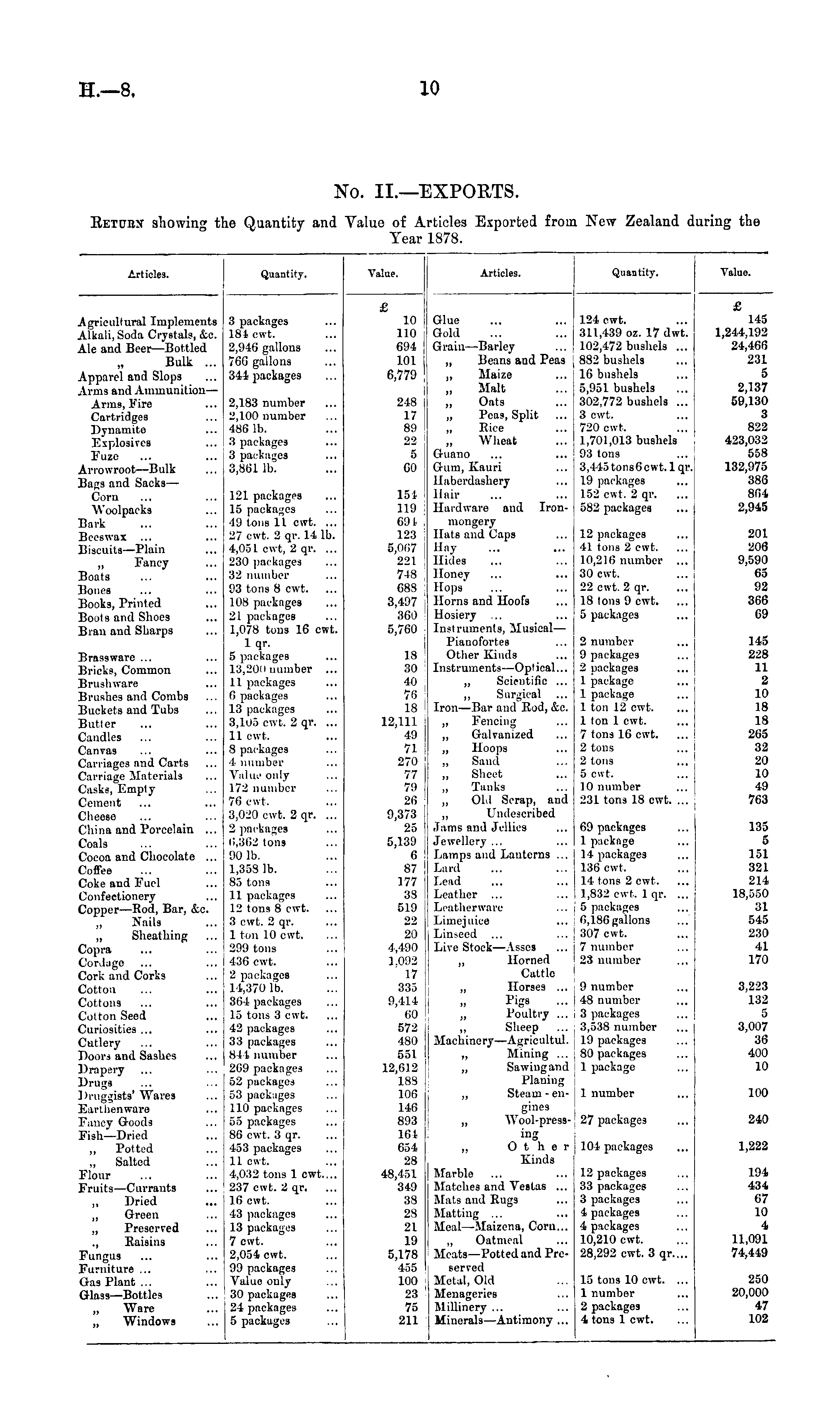 No. IL—EXPORTS. Eetuen showing the Quantity and Value of Articles Exported from New Zealand during the Tear 1878.