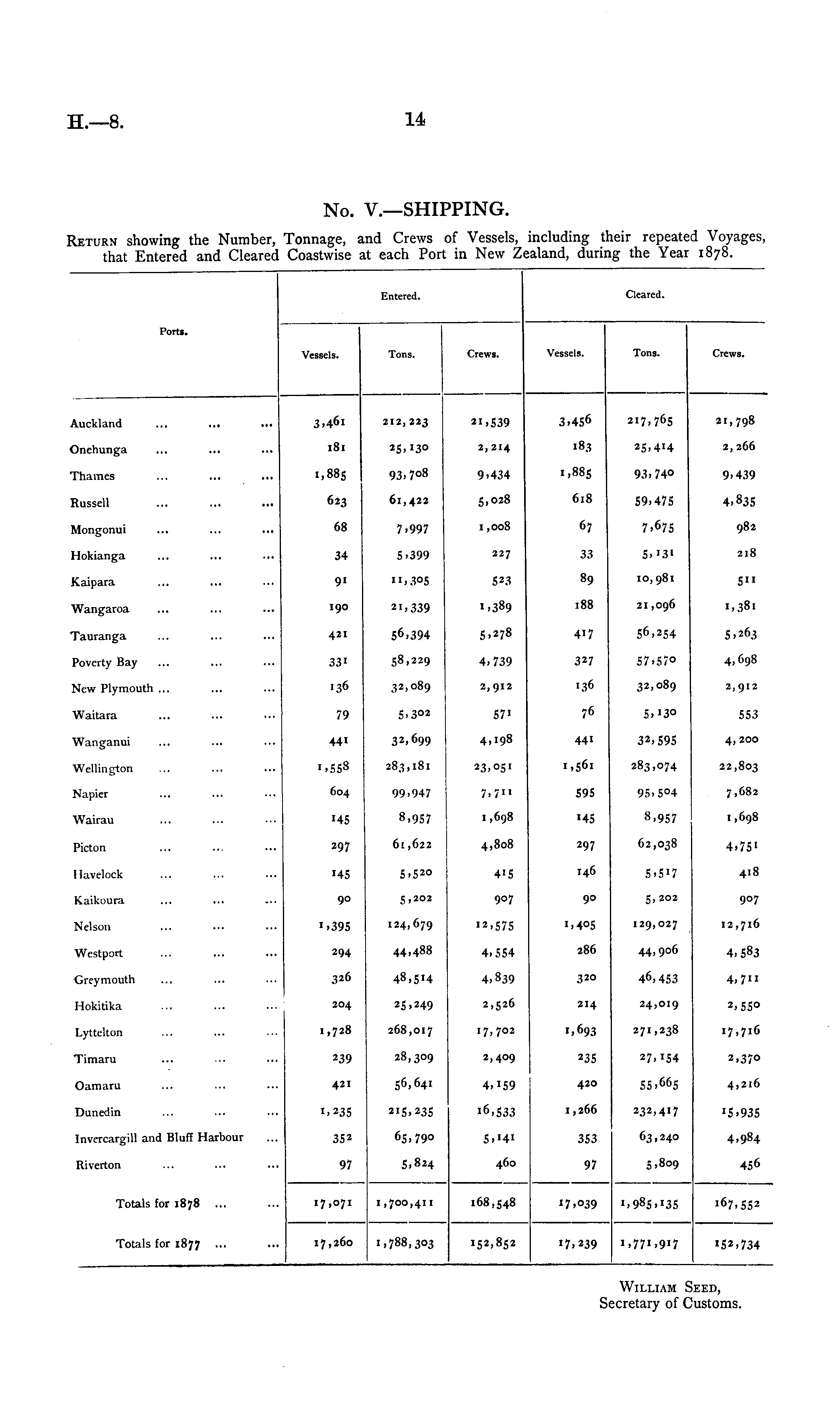 No. V.—SHIPPING. Return showing the Number, Tonnage, and Crews of Vessels, including their repeated Voyages, that Entered and Cleared Coastwise at each Port in New Zealand, during the Year 1878. Entered. Cleared. Portf. Vessels. Tons. Crews. Vessels. Tons. Crews. Auckland ... ... ... 3.461 212,223 21,539 3.4S 6 217,765 21,798 Onehunga ... ... ... 181 25,13° 2.214 183 25,414 2,266 Thames ... ... ... 1,885 93.7° 8 9.434 '.885 93.74° 9.439 Russell ... ... ... 623 61,422 5,028 618 59.475 4.835 Mongonui ... ... ... 68 7,997 1,008 67 7,675 982 Hokianga ... ... ... 34 5.399 227 33 5,131 218 Kaipara ... ... ... 9 1 «»3°5 5*3 89 10,981 511 Wangaroa ... ... ... "9° 21,339 J,389 lgB 21,096 1,381 Tauranga ... ... ... 421 55,394 5>278 47 56,254 5,263 Poverty Bay ... ... ... 33' 5 8>229 4.739 327 57,57° 4.698 New Plymouth ... ... ... 136 32,089 2.9 12 '36 32,089 2,912 Waitara ... ... ... 79 5.3°2 571 7 6 s>!3° 553 Wanganui ... ... ... 44' 32,699 4,198 441 32,595 4, 200 Wellington ... ... ... 1.55 8 283,181 23,051 1,561 283,074 22,803 Napier ... ... ... 604 99,947 7.7 11 595 95>S°4 7,682 Wairau ... ... ... "45 8,957 1,698 145 8,957 1,698 Picton ... ... ... 297 61,622 4,808 297 62,038 4,751 Havelock ... ... ... '45 5.52° 415 146 5,517 418 Kaikoura ... ... ... 9° 5>2°2 9°7 9° 5. 202 907 Nelson ... ... ... i,395 124,679 12,575 1,405 129,027 12,716 Westport ... ... ... 294 44,488 4,554 286 44.9°6 4,583 Greymouth ... ... ... 326 48,514 4,839 32° 46,453 4,7" Hokitika ... ... ... 204 25,249 2,526 214 24,019 2,550 Lyttelton ... ... ... 1|728 268,017 17.702 1.693 271,238 17,716 Timaru ... ... ... 239 28,309 2,409 235 27,154 2,370 Oamaru ... ... ... 421 56,641 4,59 42° 55,665 4,216 Dunedin ... ... ... 1,235 215,235 16,533 1,266 232,417 15,935 Invercargill and Bluff Harbour ... 352 65,790 5.14 1 353 63,240 4,984 Riverton ... ... ... 97 5,824 46° 97 5,809 456 Totals for 1878 ... ... 17.Q7 1 1,700,411 168,548 i7,°39 ',985.'35 167,552 Totals for 1877 ... ... 17,260 1,788,303 152,852 17,239 1,771,917 152,734 William Seed, Secretary of Customs.